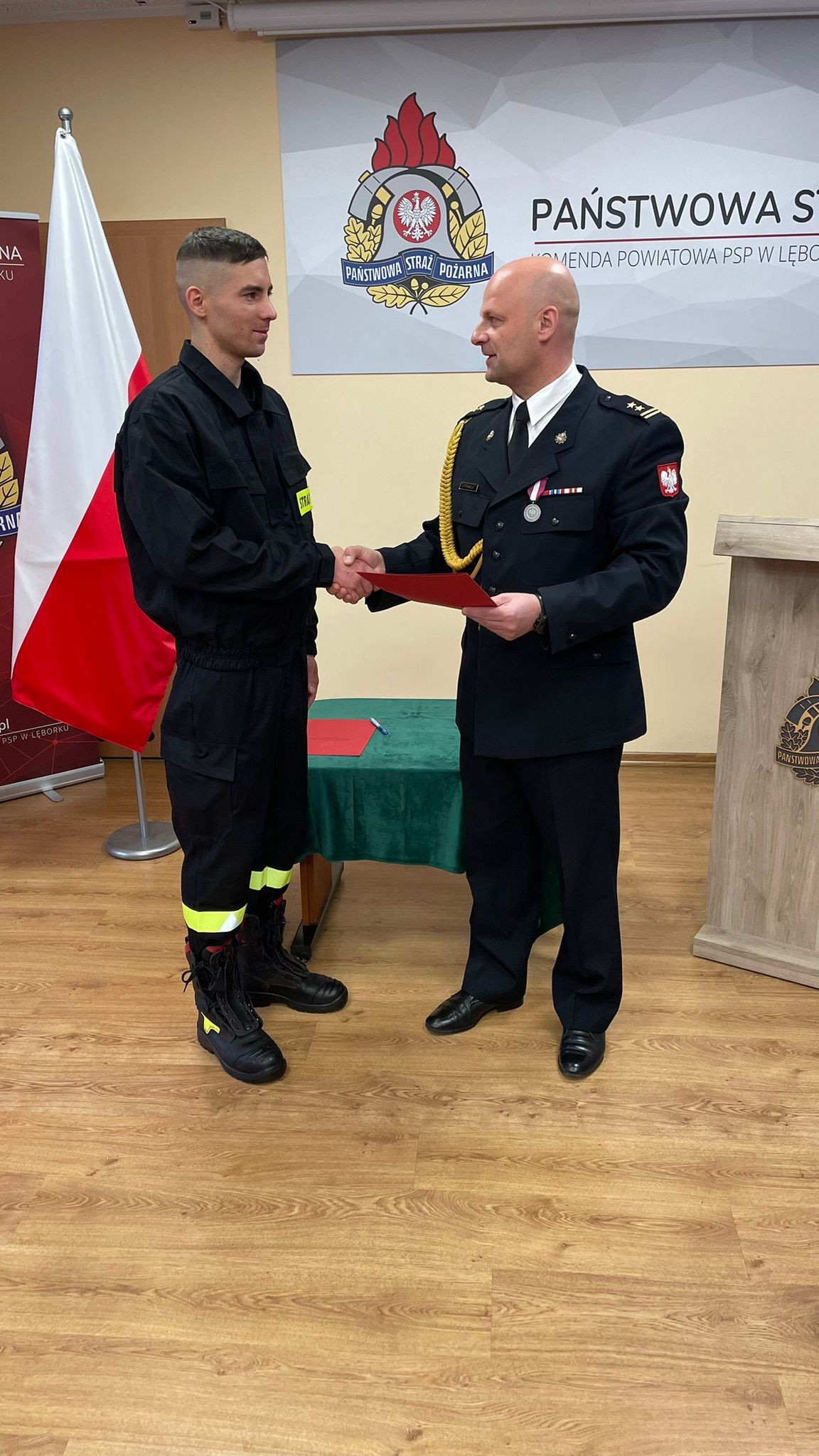 Akt ślubowania wręczył bryg. Leszek Formela Komendant Powiatowy Państwowej Straży Pożarnej w Lęborku, życząc jednocześnie wielu sukcesów zawodowych oraz zadowolenia ze służby wstępującemu w szeregi Państwowej Straży Pożarnej funkcjonariuszowi.