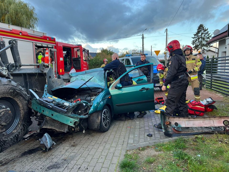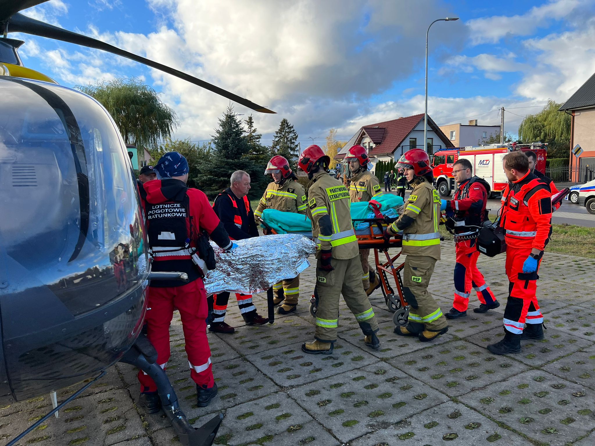 Na miejscu zdarzenia okazało się, że doszło do zderzenia samochodu osobowego z koparko - ładowarką, w wyniku czego poszkodowane zostały dwie osoby. Strażacy natychmiast zabezpieczyli miejsce zdarzenia, następnie udzielili kwalifikowanej pierwszej pomocy oraz ewakuowali osoby ranne z wraku pojazdu i przekazali zespołom ratownictwa medycznego. Decyzją ratowników medycznych na miejsce zdarzenia zadysponowano śmigłowiec Lotniczego Pogotowia Ratunkowego (LPR).