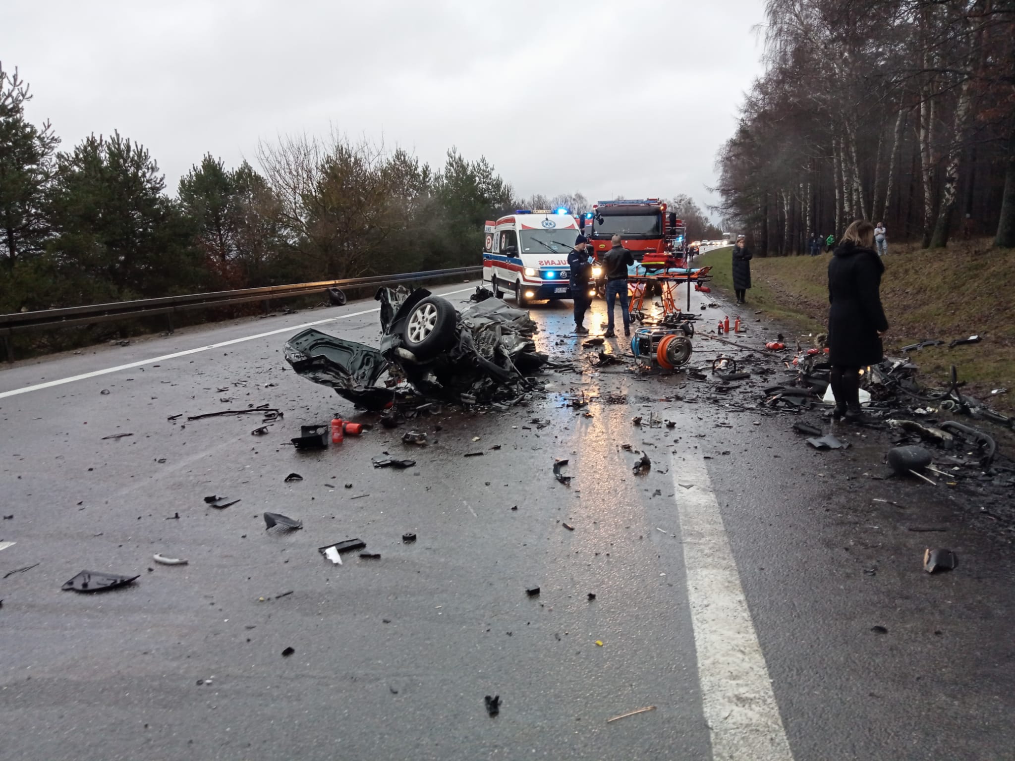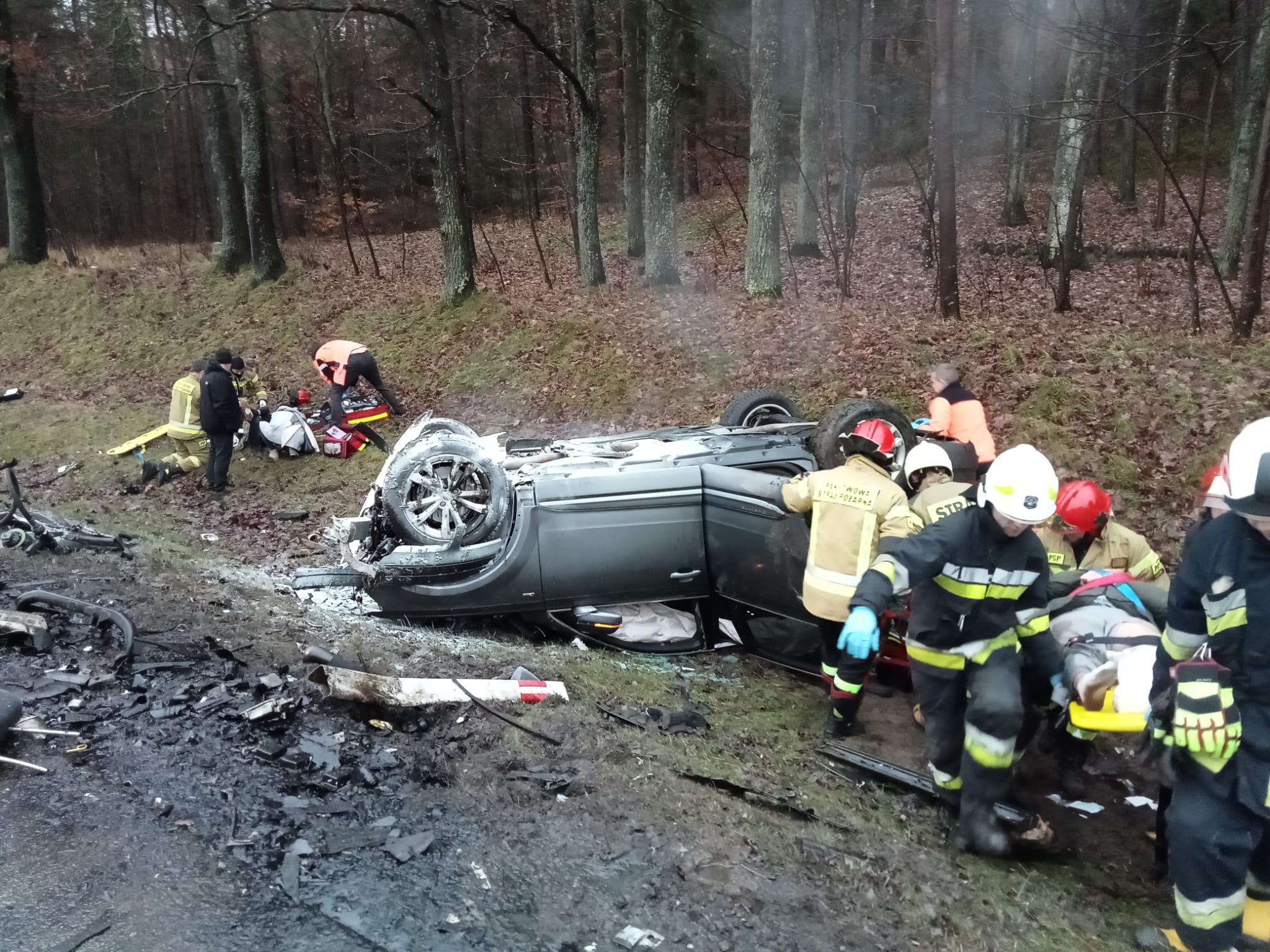 Na miejsce zdarzenia zadysponowano dwa zastępy z JRG Lębork, jeden zastęp z OSP Nowa Wieś Lęborska, jeden zastęp z OSP Lębork oraz jeden zastęp OSP Leśnice. Po przybyciu na miejsce zdarzenia stwierdzono, że doszło do czołowego zderzenia dwóch samochodów osobowych, natomiast trzeci pojazd uległ uszkodzeniu i stoi na poboczu drogi. Zderzeniu czołowemu uległ samochód marki Audi Q7 w którym podróżowało pięć osób oraz samochód marki Vw Passat, w którym podróżowały dwie osoby. Dwie osoby podróżujące Vw Passatem poniosły śmierć na miejscu. Pięć osób podróżujących Audi Q7 zostały zabrane przez Zespoły Ratownictwa Medycznego do szpitali w Lęborku i Słupsku. W trzecim pojęździe marki Audi A4 podróżowały cztery osoby, które nie wymagały udzielenia pomocy medycznej. Działania straży polegały na zabezpieczeniu miejsca zdarzenia, udzielenia kwalifikowanej pomocy przedmedycznej oraz pomoc przybyłym Zespołom Ratownictwa Medycznego. W działaniach brały udział łącznie 6 zastępów straży pożarnej, 4 Zespoły Ratownictwa Medycznego oraz 5 patroli Policji.