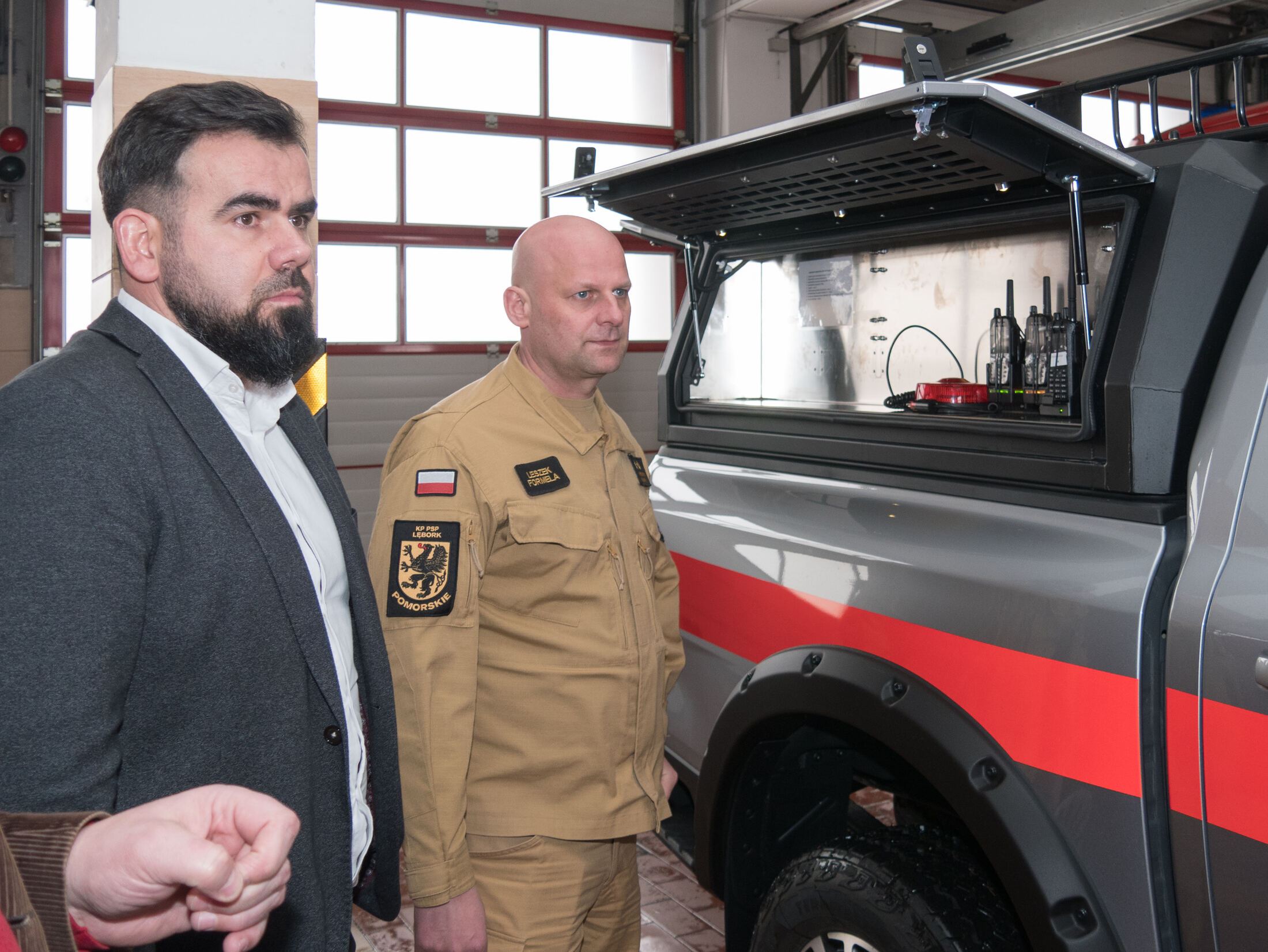 19 lutego 2026 r. w Komedzie Powiatowej Państwowej Straży Pożarnej gościł Starosta Lęborski Pan Tomasz Litwin. Wizyta związana była z podsumowaniem zakupów zrealizowanych w 2025 roku w ramach Programu Ochrony Ludności i Obrony Cywilnej na lata 2025-2026. Staroście Lęborskiemu towarzyszył Pan Cezary Kossewski - Kierownik Referatu Bezpieczeństwa i Zarządzania Kryzysowego Starostwa Powiatowego w Lęborku.
