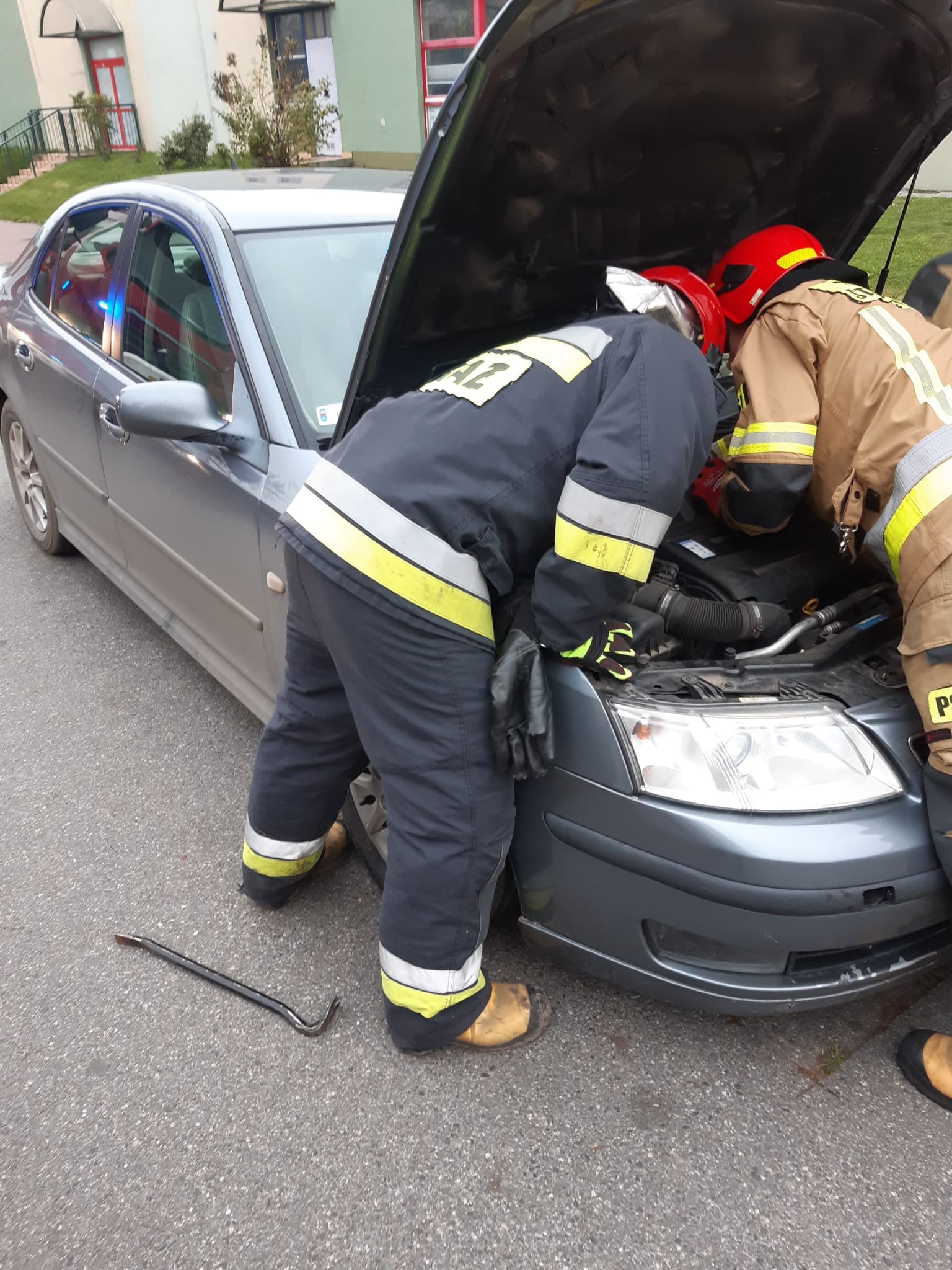 Działania straży pożarnej polegały na: wydobyciu zaklinowanego kota z komory silnika samochodu osobowego.