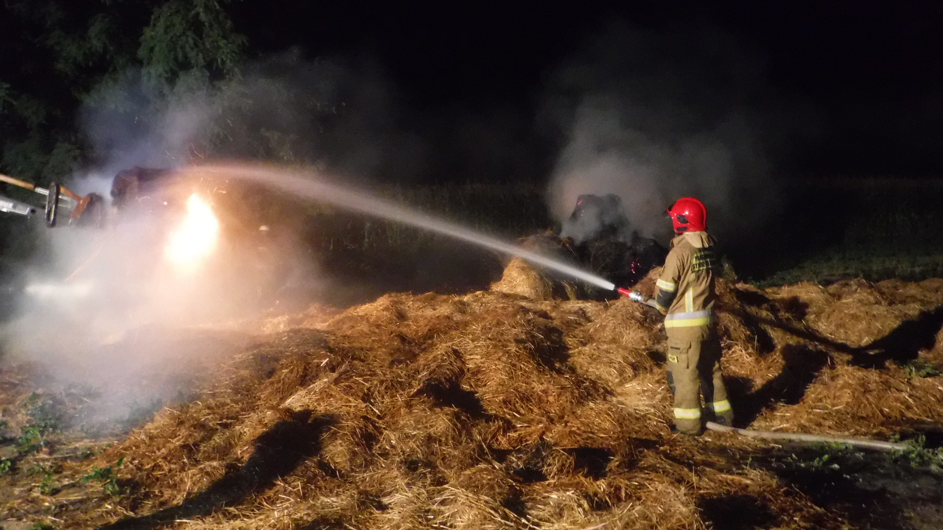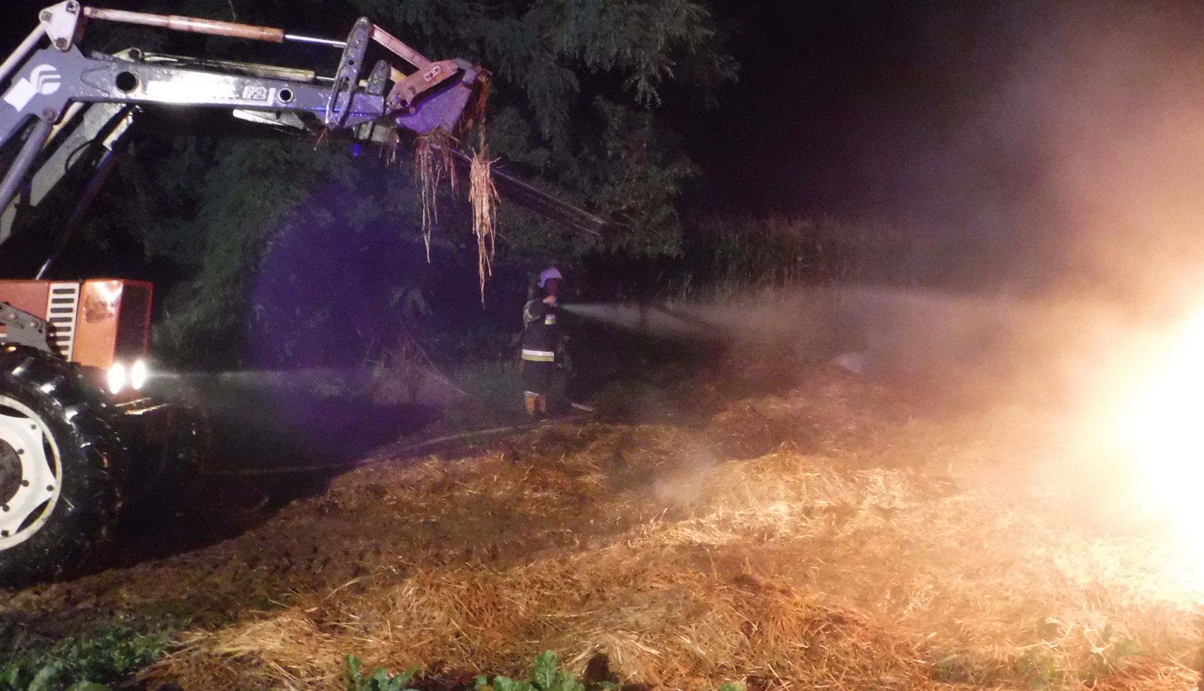 Działania straży pożarnej polegały na: zabezpieczeniu miejsca zdarzenia, podaniu 8 prądów wody w natarciu na paląca się stertę, przeszukaniu terenu akcji w celu wykluczenia ewentualnych osób poszkodowanych oraz przegarnięciu i dogaszeniu tlącej się słomy.