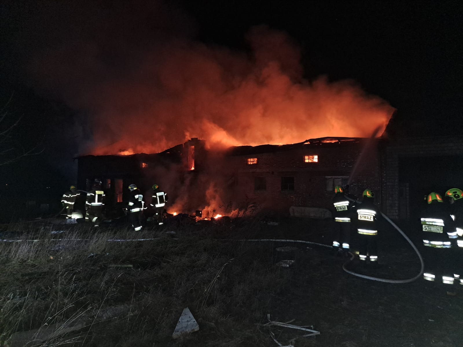 Działania straży pożarnej polegały na: oświetleniu terenu działań, podaniu dwóch prądów wody w natarciu na palący się budynek gospodarczy, podaniu dwóch prądów wody w obronie na sąsiadujący budynek mieszkalny (pustostan), przeszukaniu pomieszczeń w obu budynkach - osób poszkodowanych nie stwierdzono, ugaszeniu pożaru w pomieszczeniu objętym ogniem, pracach rozbiórkowych konstrukcji dachu, wyniesieniu nadpalonych rzeczy z budynku i ich dogaszeniu oraz udzieleniu kwalifikowanej pierwszej pomocy strażakowi, który uległ wypadkowi podczas prowadzonych działań.