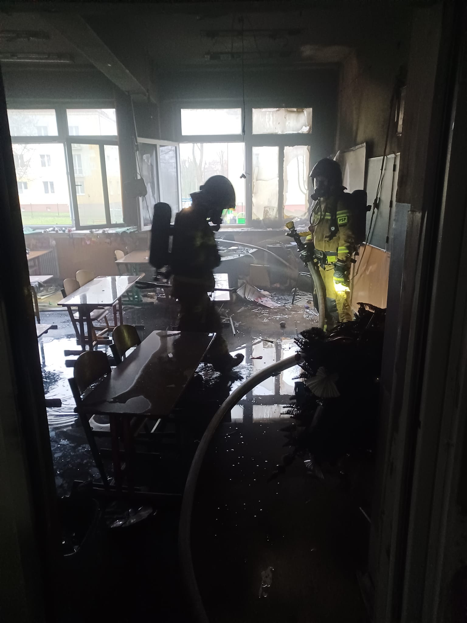 Działania straży pożarnej polegały na odłączeniu prądu w budynku przez użycie przeciwpożarowego wyłącznika prądu, podawaniu jednego prądu wody w natarciu na palącą się część sali lekcyjnej, sprawdzeniu pomieszczeń w celu wykluczenia osób poszkodowanych (brak osób poszkodowanych), oddymianiu i przewietrzeniu pomieszczeń w budynku oraz usunięciu spalonego wyposażenia sali na zewnątrz budynku oraz jego dogaszeniu.