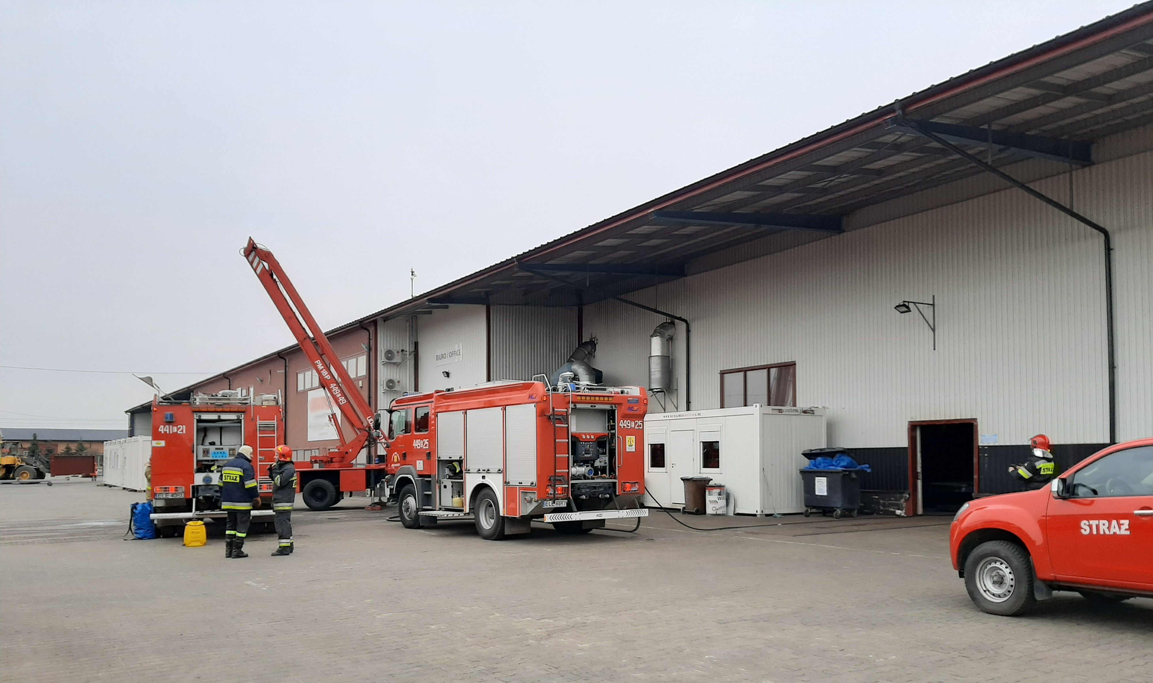 Po przybyciu na miejsce zdarzenia pierwszych zastępów straży pożarnej kierujący działaniem ratowniczym stwierdził, że pali się stacja wentylacyjna, kanał wentylacyjny oraz izolacja ściany w hali produkcyjnej. Pracownicy (44 osoby) ewakuowali się przed przybyciem zastępów straży pożarnej.