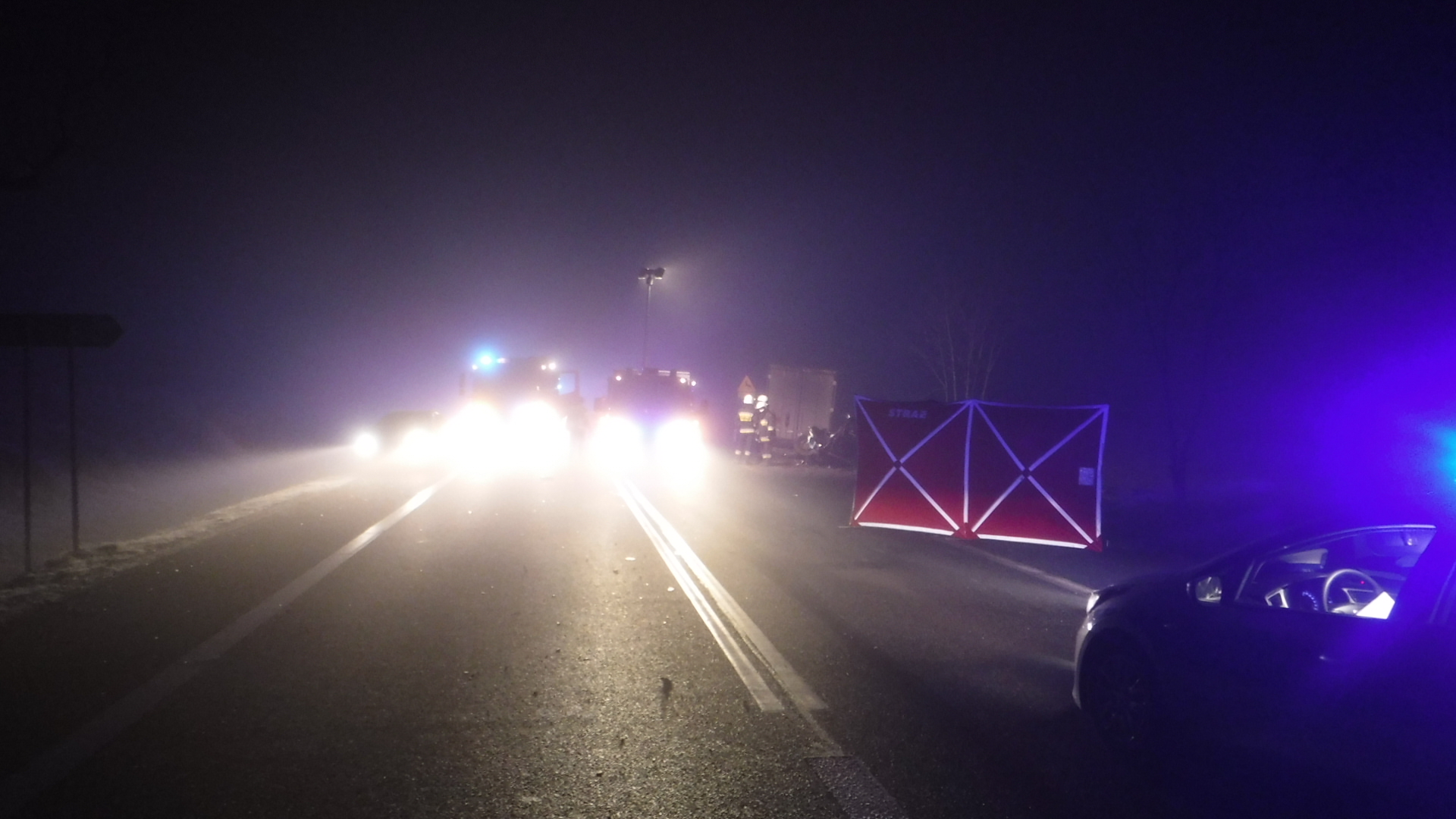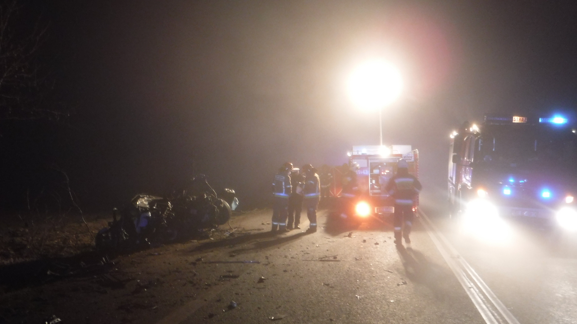 Po przybyciu na miejsce zdarzenia pierwszych zastępów straży pożarnej kierujący działaniem ratowniczym stwierdził, że samochód osobowy zderzył się z samochodem ciężarowym. Kierujący samochodem osobowym znajdował się poza pojazdem (lekarz stwierdził zgon). Dwóch mężczyzn podróżujących samochodem ciężarowym znajdowało się pod opieką przybyłej na miejsce zdarzenia załogi karetki pogotowia. Droga krajowa nr 91 została całkowicie zablokowana.