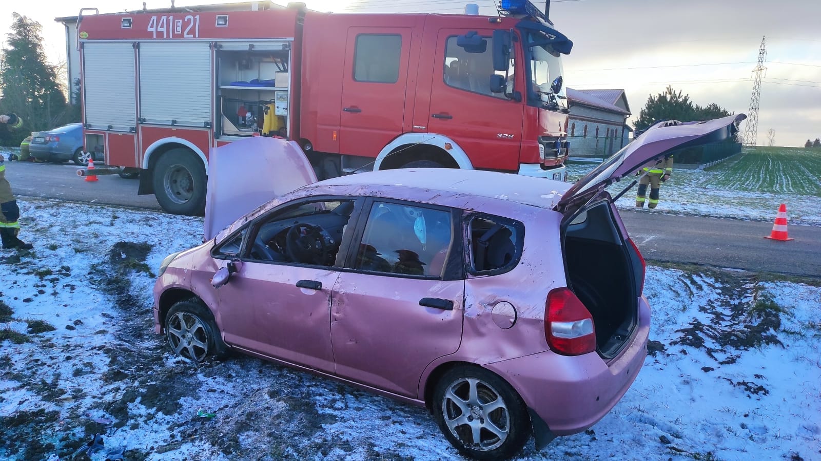 Po przybyciu na miejsce zdarzenia pierwszych zastępów straży pożarnej kierujący działaniami ratowniczymi stwierdził, że samochód osobowy wypadł z jezdni, dwie osoby poszkodowane (kobieta oraz dziecko) samodzielnie opuściły pojazd przed przybycie Jednostek Ochrony Przeciwpożarowej i znajdują się pod opieką Zespołu Ratownictwa Medycznego.
