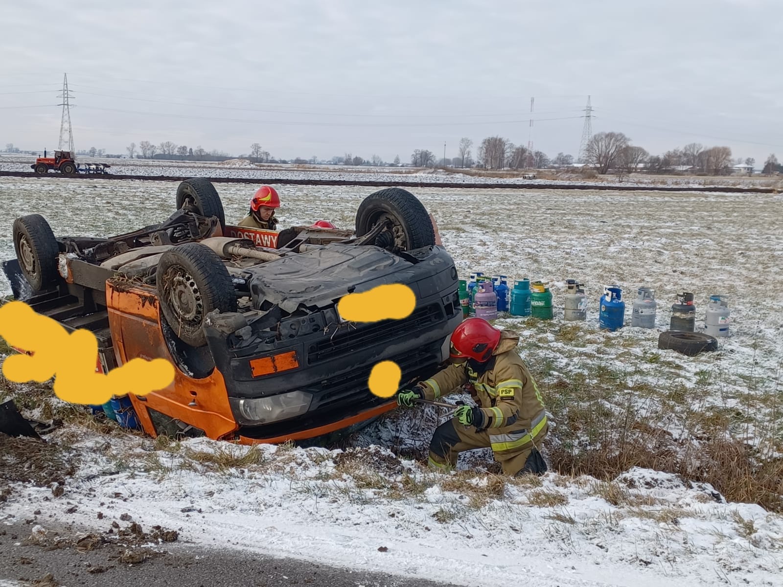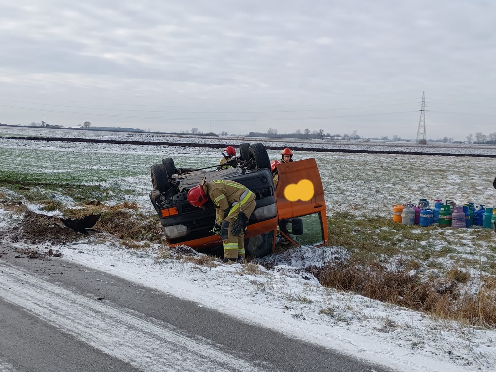 21 grudnia 2021 roku o godz. 11.00 do Stanowiska Kierowania Komendanta Powiatowego Państwowej Straży Pożarnej w Łęczycy wpłynęło zgłoszenie o dachowaniu samochodu dostawczego przewożącego butle propan-butan 11 kg, jadącego drogą powiatową w miejscowości Leszcze.