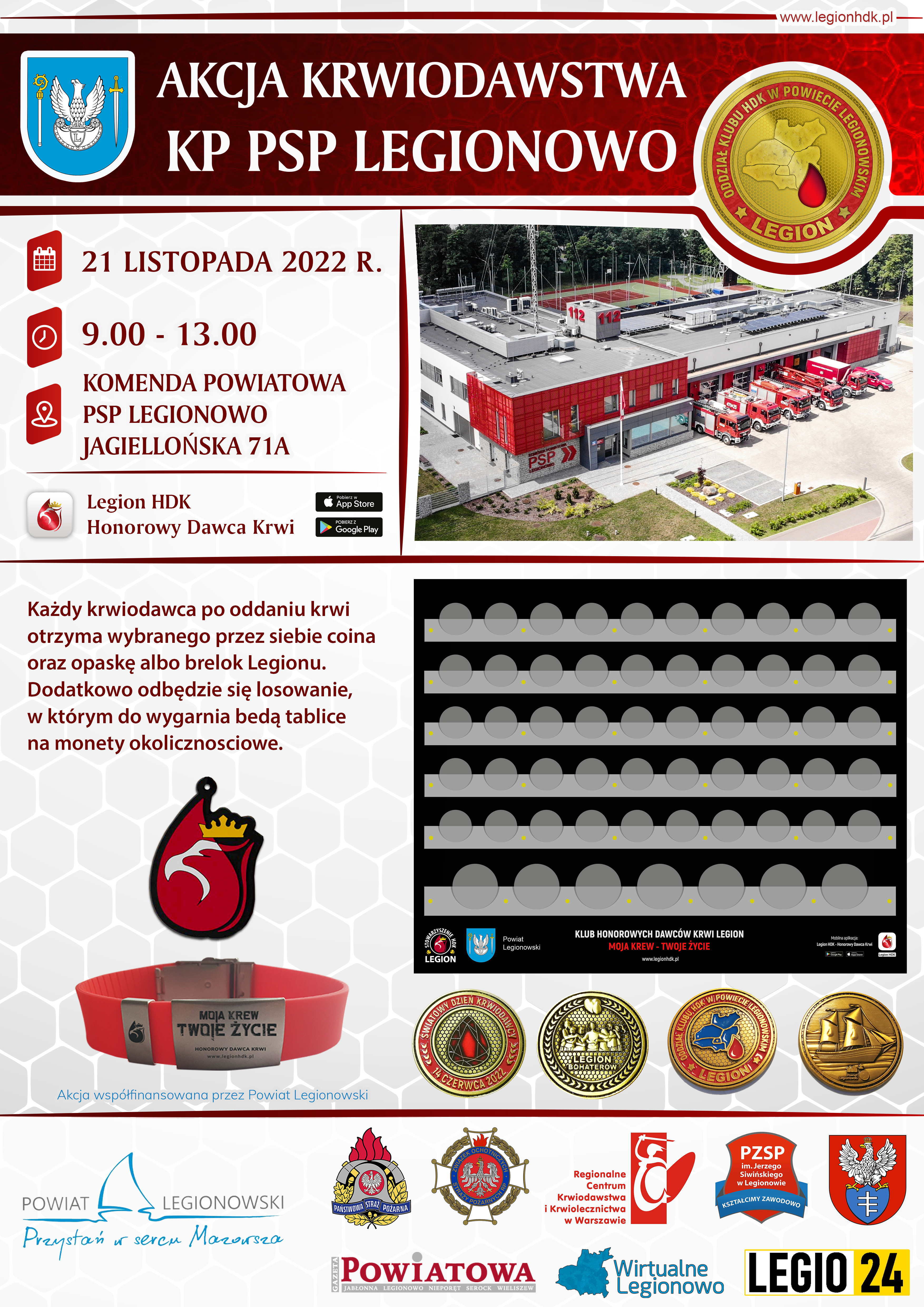 Oddział Klubu HDK Legion w Powiecie Legionowskim i Komenda Powiatowa Państwowej Straży Pożarnej w Legionowie zapraszają na akcję krwiodawstwa.