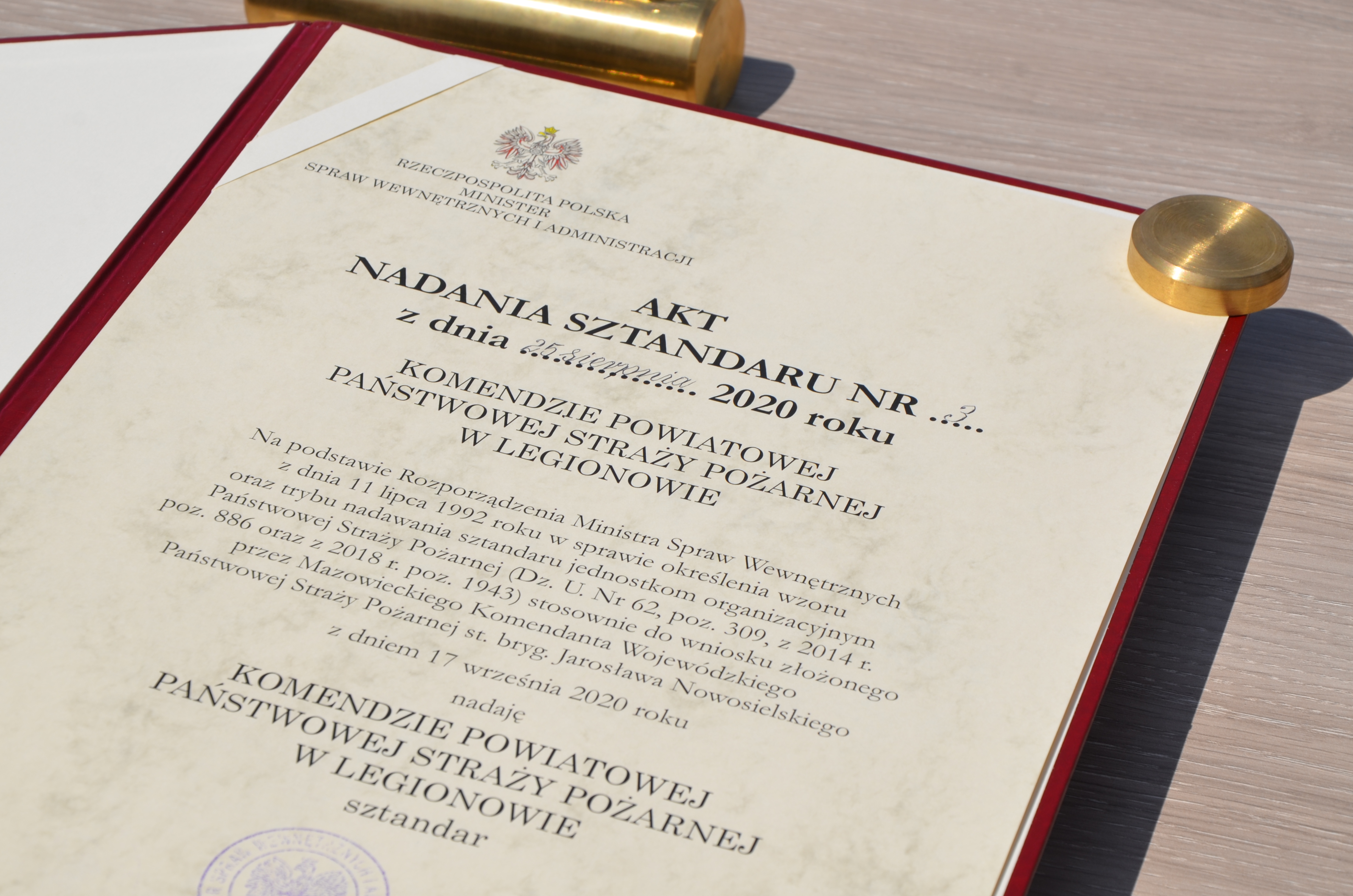 31 maja 2021 roku przed siedzibą Komendy Powiatowej PSP w Legionowie odbyła się uroczystość nadania sztandaru. W uroczystym apelu udział wzięli: Minister Obrony Narodowej, Mariusz Błaszczak, Zastępca Komendanta Głównego PSP nadbryg. Krzysztof Hejduk, Szef Gabinetu Politycznego MSWiA, Michał Pruszyński; Wicewojewoda Mazowiecki, Sylwester Dąbrowski; Mazowiecki Komendant Wojewódzki PSP, nadbryg. Jarosław Nowosielski, Wicestarosta Legionowski Konrad Michalski, Komendanci Gminni Zarządu Powiatowego OSP RP, przedstawiciele służb mundurowych i wojska polskiego z terenu powiatu legionowskiego oraz funkcjonariusze i pracownicy Komendy Powiatowej Państwowej Straży Pożarnej w Legionowie.