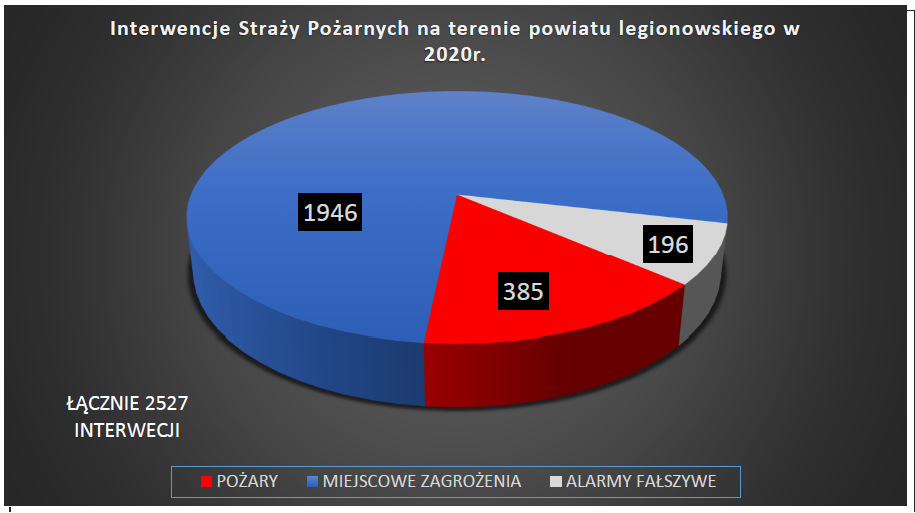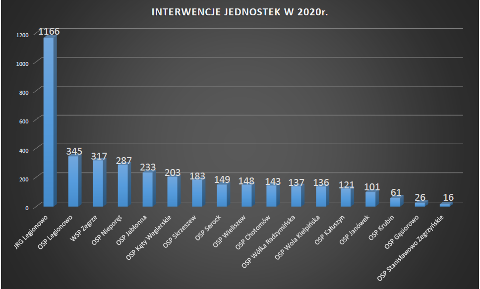 Rok 2020 był dla nas bardzo pracowity i pełen wyzwań. W całym ubiegłym roku JRG Legionowo jak i Ochotnicze Straże Pożarne wyjeżdżały łącznie do zdarzeń 2527 razy. To najwięcej interwencji w ostatnich latach. Wpływ na znaczny wzrost ilości zdarzeń miały działania dotycząca przeciwdziałania i zwalczania COVID - 19.