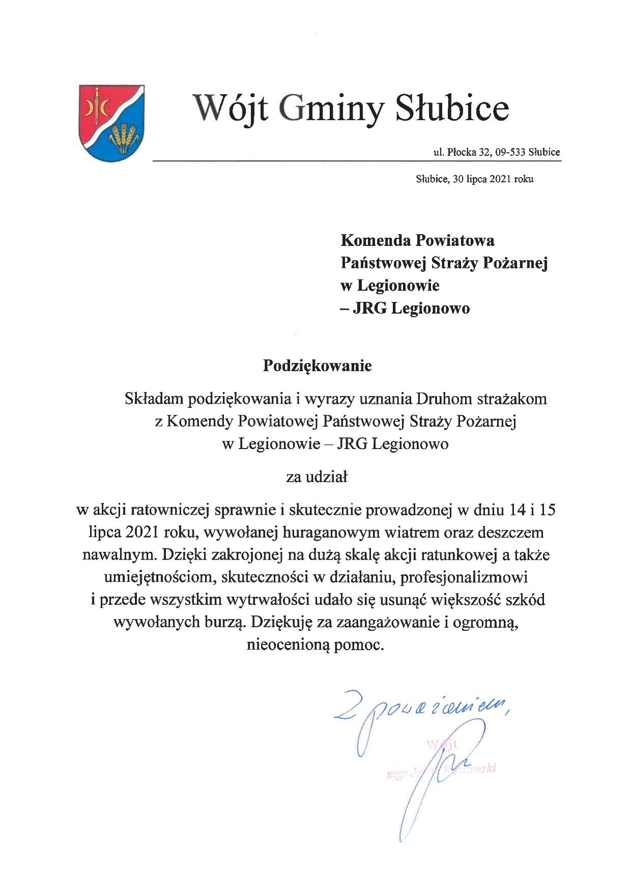Wójt gminy Słubice z powiatu Płockiego przesłał nam podziękowanie za działania prowadzone na terenie gminy w dniach 14-15 lipca 2021r.