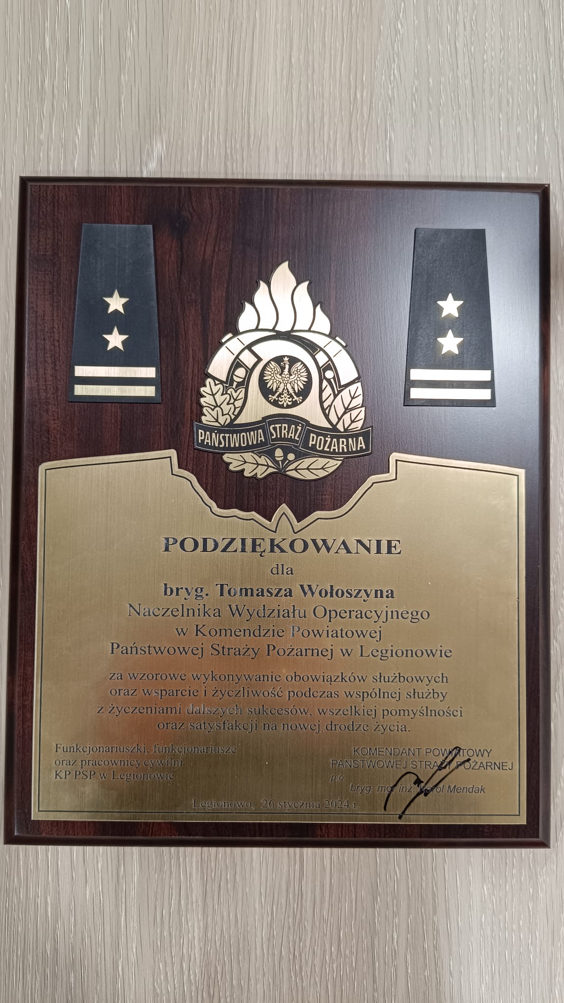 26 stycznia był ostatnim dniem pracy Naczelnika Wydziału Operacyjnego bryg. Tomasza Wołoszyna. Z okazji przejścia na zaopatrzenie emerytalne w Komendzie Powiatowej PSP w Legionowie odbyła się uroczysta zbiórka, w której udział wzięli pracownicy i funkcjonariusze Komendy na czele z p.o. Komendanta Powiatowego PSP w Legionowie bryg. Karolem Mendakiem. W uroczystości wziął udział także były Komendant Powiatowy st. bryg. Radosław Parapura.