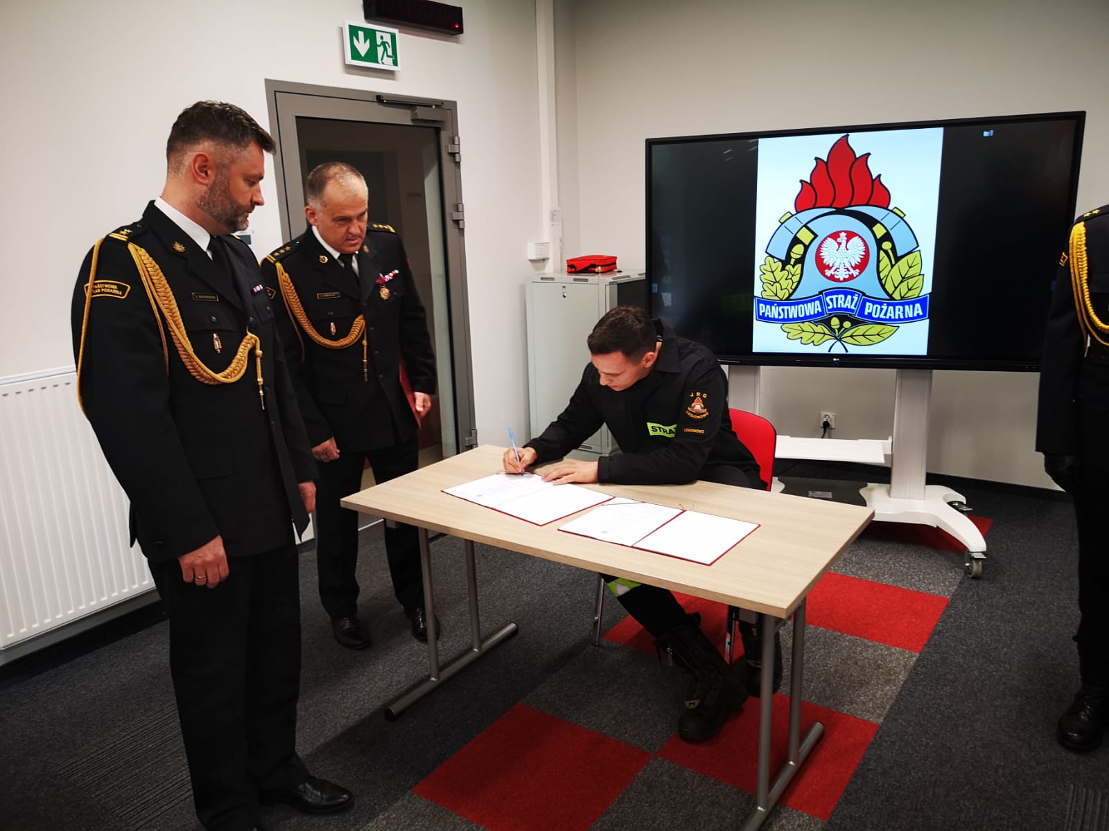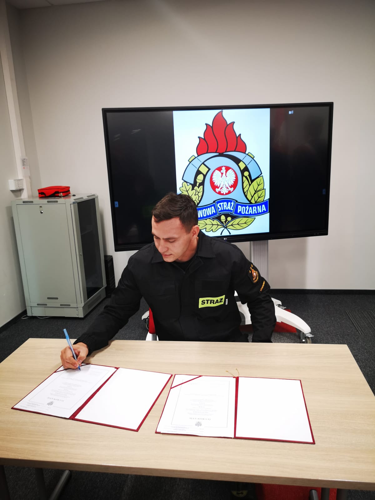 Strażak złożył podpis pod aktem ślubowania, pieczętując w ten sposób ważny krok w swojej karierze zawodowej.