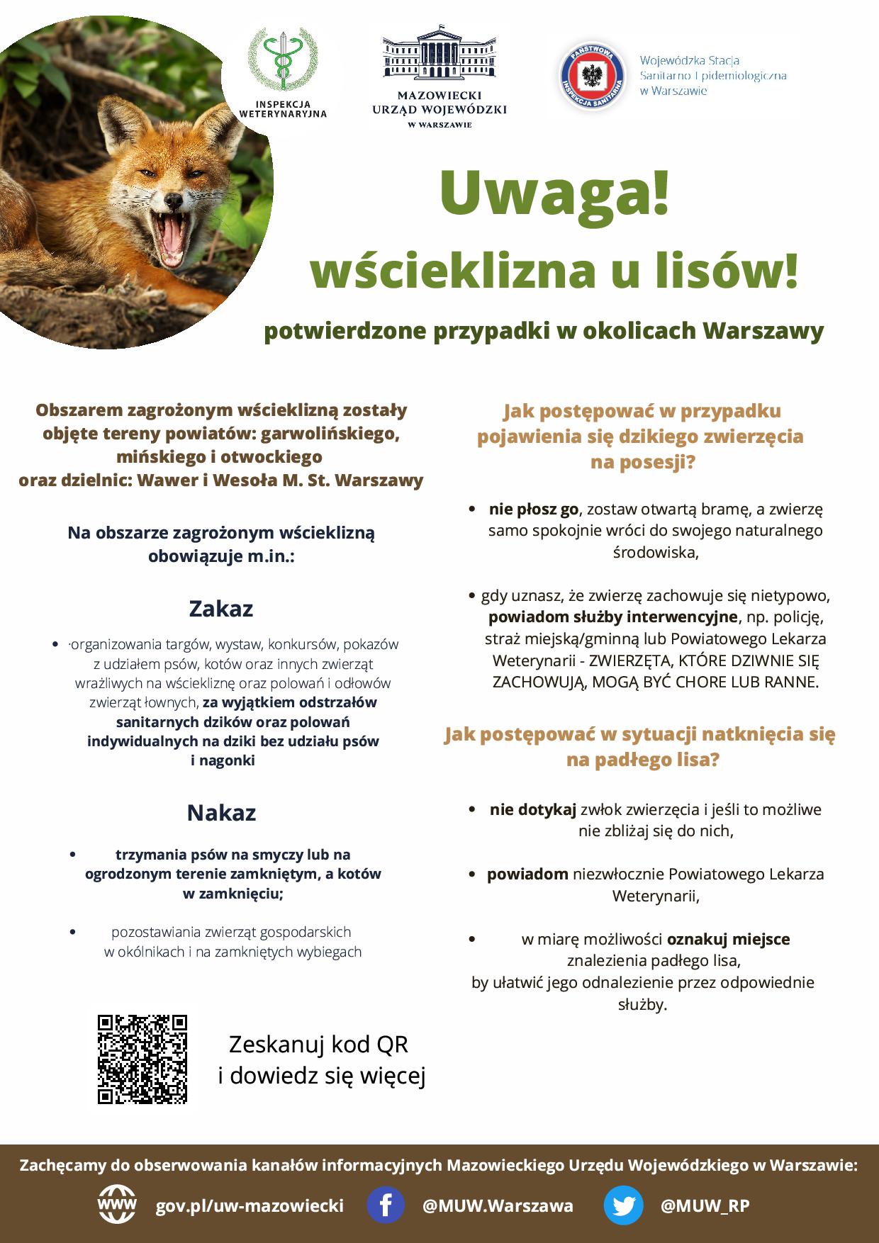 Na terenie Mazowsza pojawia się coraz więcej przypadków wścieklizny u lisów. Przypominam, że to bardzo groźna i prawie zawsze śmiertelna choroba. Dlatego apeluję o szczególną ostrożność, unikanie kontaktu z dzikimi zwierzętami oraz o przestrzeganie zakazów i nakazów obowiązujących na terenach zagrożonych wścieklizną. Proszę również pamiętać o bezpieczeństwie naszych zwierząt; szczepienie psów jest obowiązkowe, ale zaleca się szczepić również koty - powiedział Wojewoda Mazowiecki.