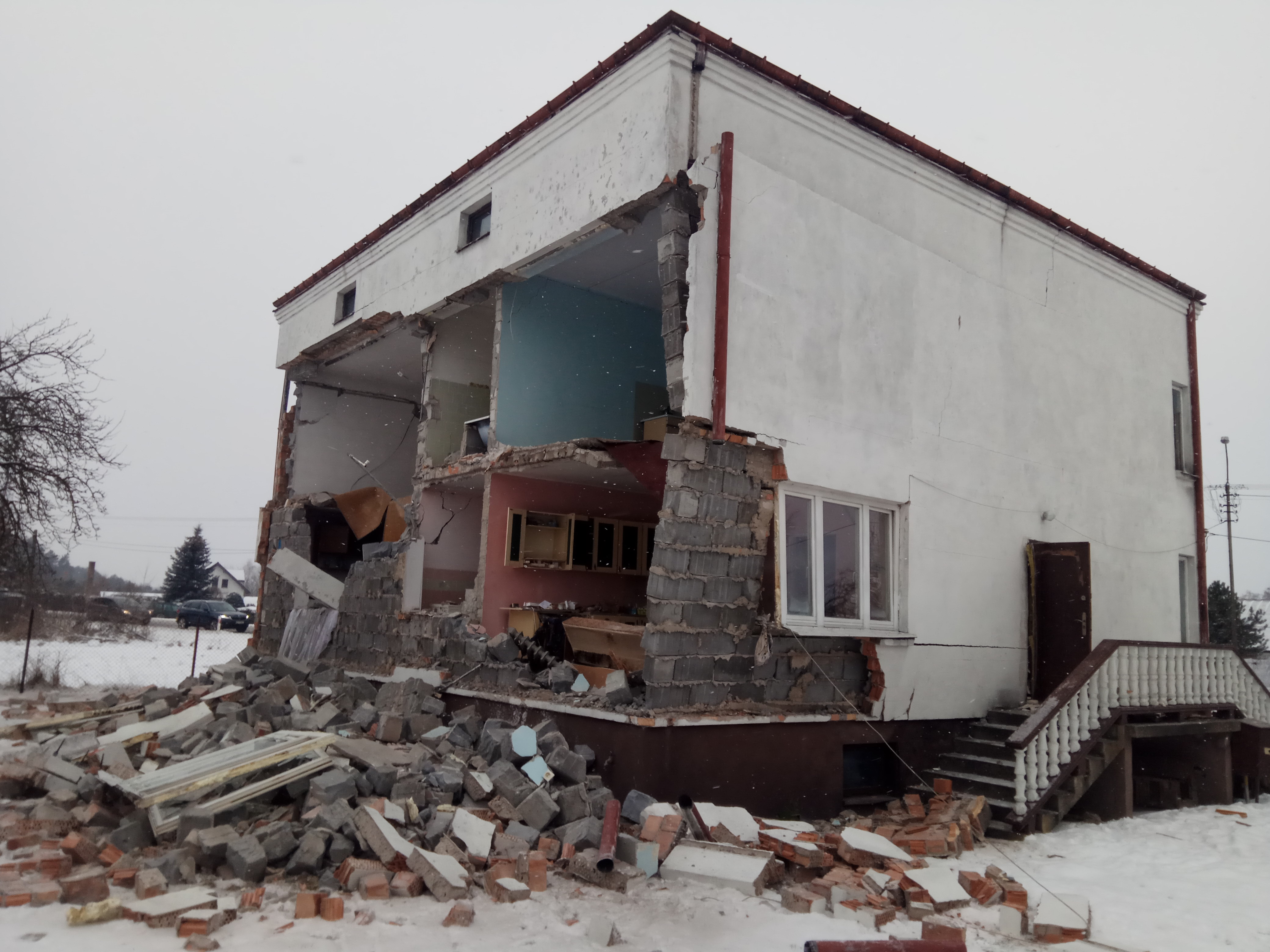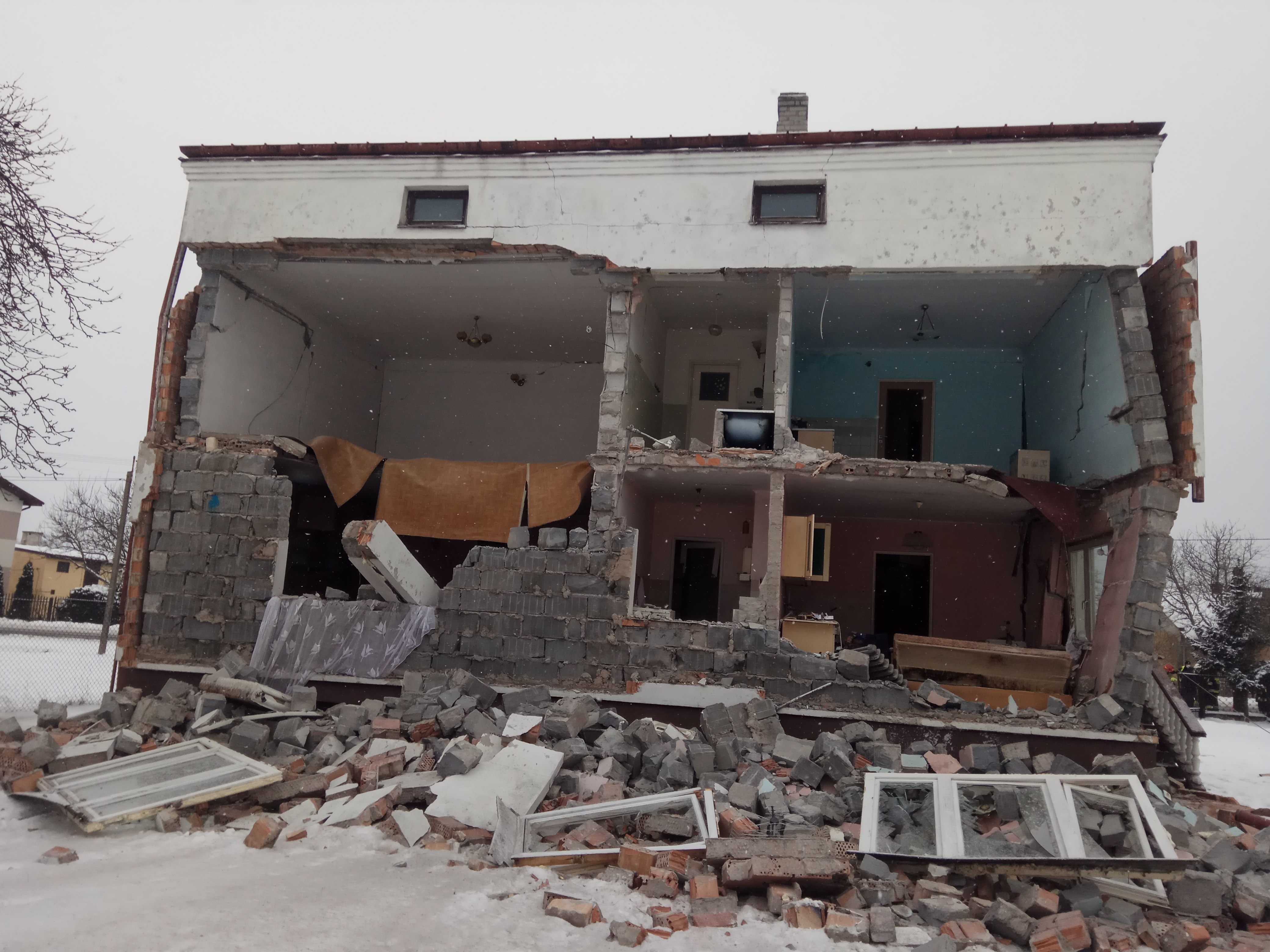 Czwartkowy poranek 11.02.2021r rozpoczał się od zgłoszenia które otrzymaliśmy przed godziną 8 o wybuchu w budynku jednorodzinnym w miejscowości Olszewnica Nowa. Natychmiast na miejsce zostały zadysponowane zastępy z JRG Legionowo oraz zastępy Ochotniczych Straży Pożarnych z Kałuszyna, Krubina oraz Chotomowa. Strażacy przybyli na miejsce zastali budynek z zawaloną jedną ścianą, popękaną konstrukcją i powybijanymi oknami. W pomieszczeniu na dole zastali mieszkankę budynku z poiwerzchownymi oparzeniami twarzy i rąk. Ratownicy natyczmiast ewakuowali poszkodowaną budynku, udzielili jej kwalifikowanej pierwszej pomocy, odłączyli zasilanie w energię elektryczną budynku oraz zabezpieczyli miejsce zdarzenia pod kątem dostępu osób postronnych na gruzowisko. Przybyły na miejsce Inspektor Nadzoru Budowlanego wydał decyzję o zakazie użytkowania obiektu. Prawdopodobną przyczyną wybuchu był ulatniający się gaz z butli 11kg.