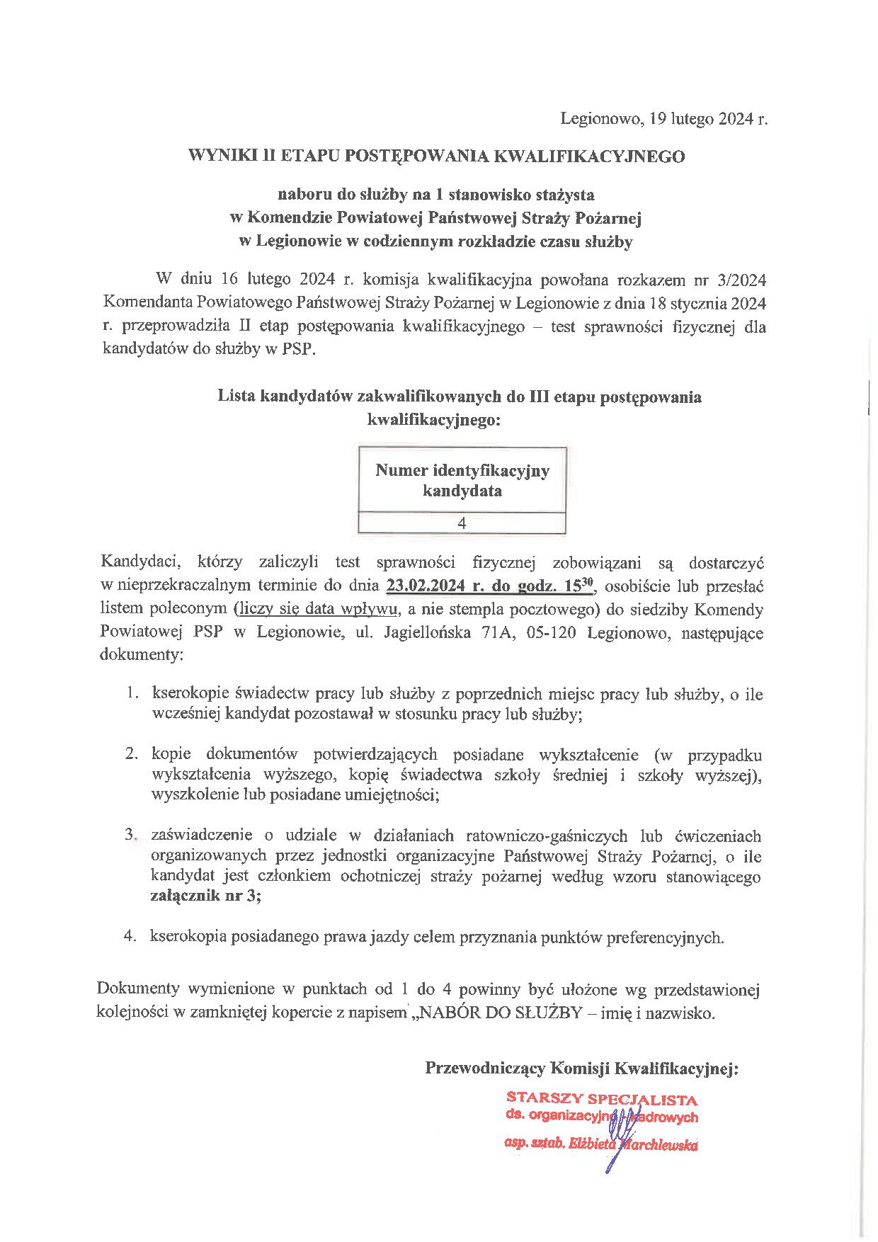 Komenda Powiatowa Państwowej Straży Pożarnej w Legionowie ogłasza wyniki II etapu postępowania kwalifikacyjnego naboru do służby na stanowisko stażysta (docelowo starszy specjalista) w codziennym rozkładzie czasu służby.