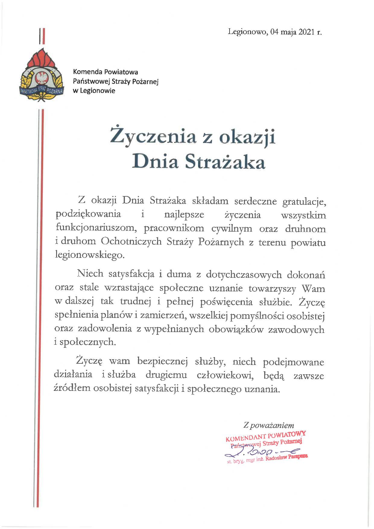 Życzenia Komendanta Powiatowego PSP w Legionowie z okazji Dnia Strażaka 04.05.2022 Zdjęcia (1) Pokaż zdjęcie 1 z galerii.