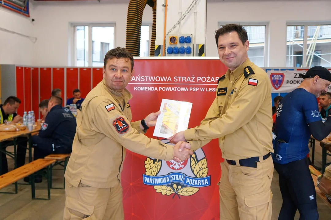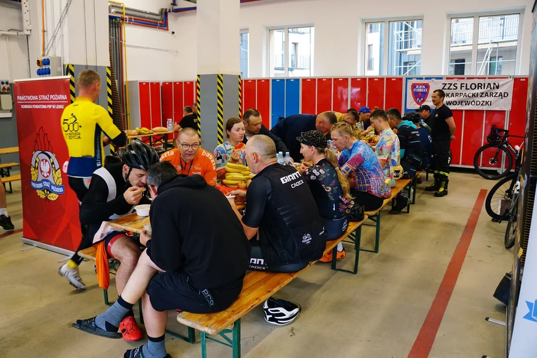 W eskorcie Policji dzielni cykliści dotarli popołudniem do Komendy Powiatowej PSP w Lesku, gdzie czekał już na nich poczęstunek i możliwość choć częściowej regeneracji po trudach drogi – nie sposób opisać pozytywnej atmosfery i chwil wzruszenia, które towarzyszyły całemu wydarzeniu...