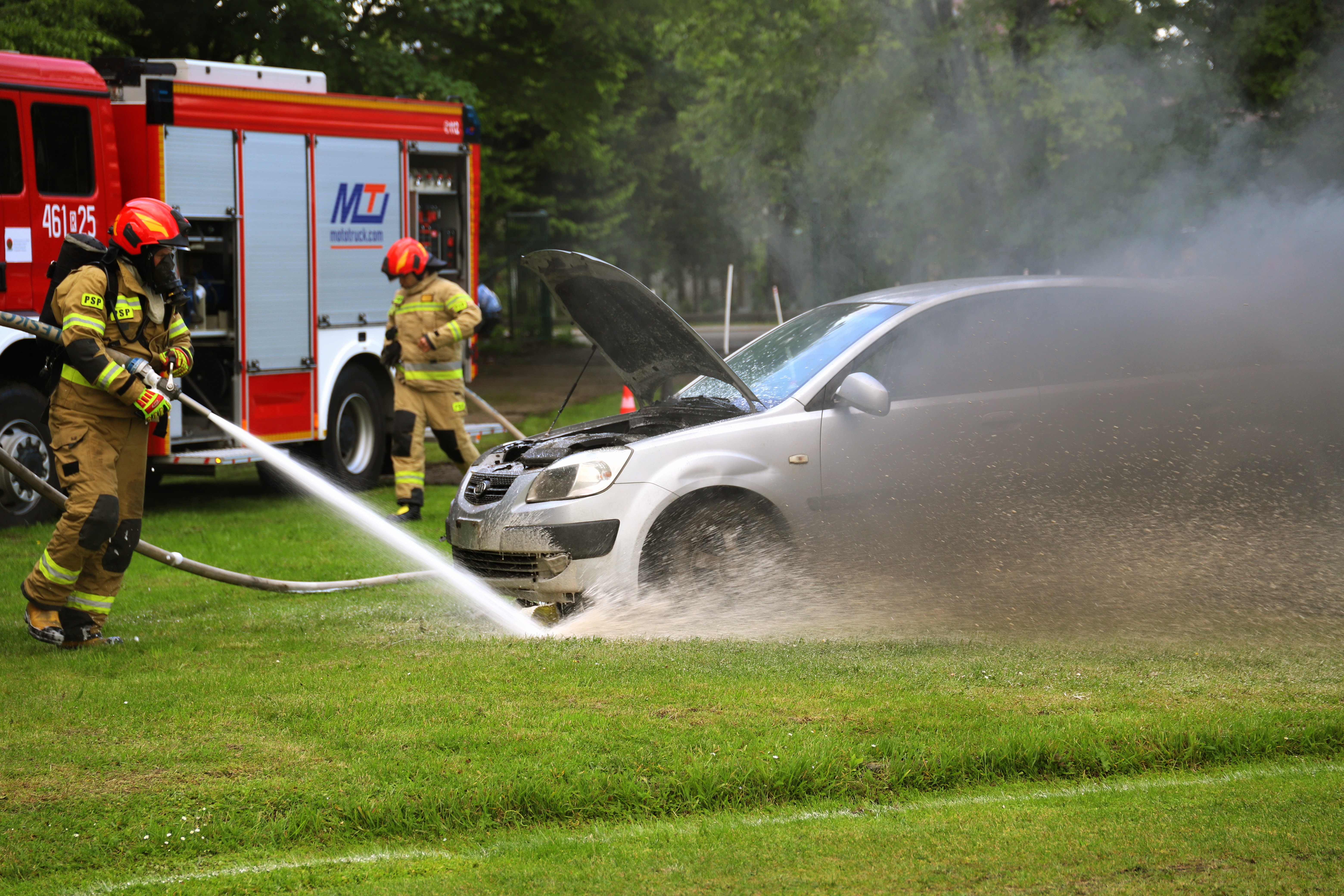 Ćwiczenie bojowe to symulacja sytuacji gaśniczej, w której młodzi strażacy muszą sprawnie rozwinąć linie wężowe i trafić strumieniem wody do celu. Z kolei sztafeta to prawdziwy test sprawności – z przewrotem przez płotek, czołganiem się pod przeszkodą oraz przenoszeniem sprzętu.