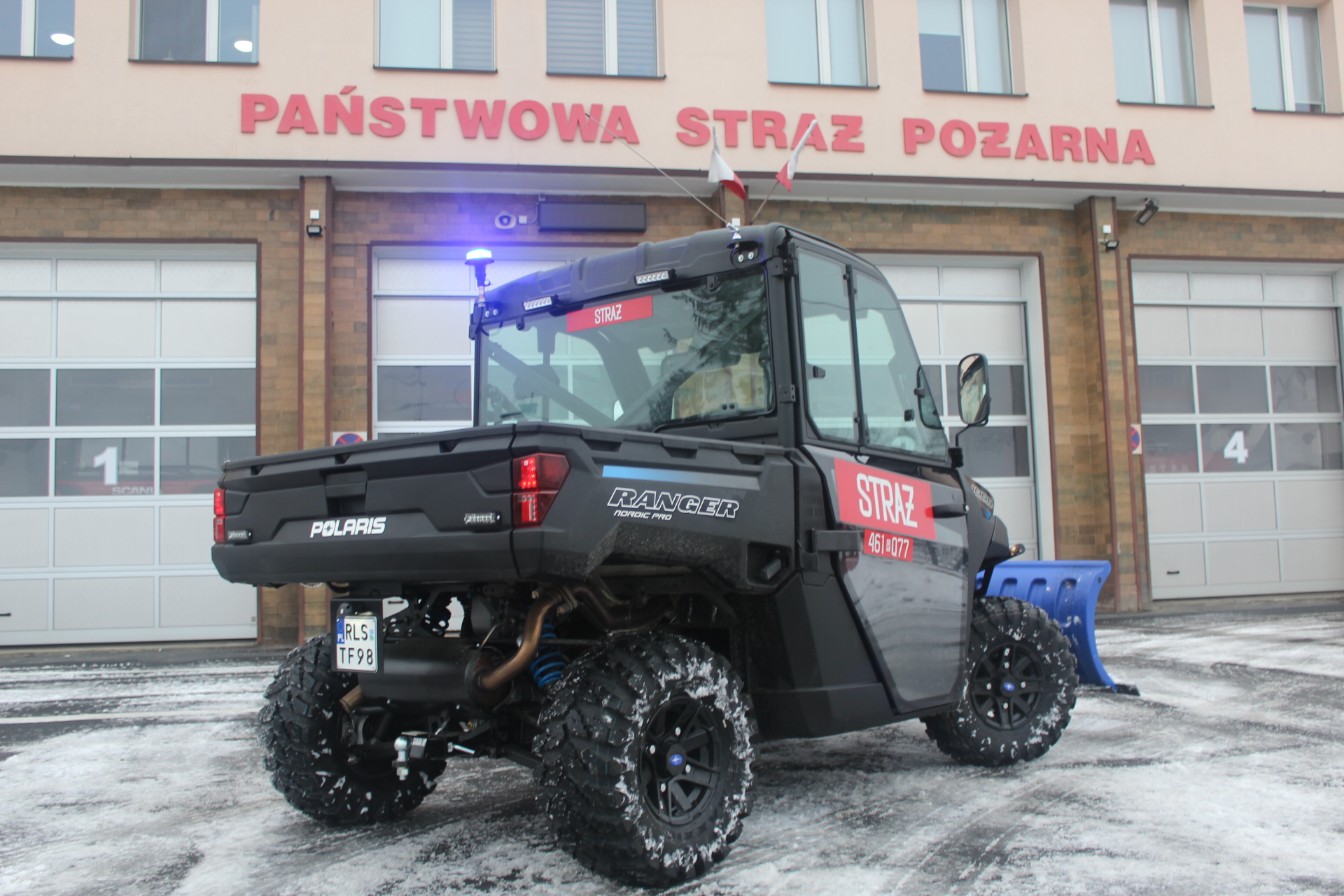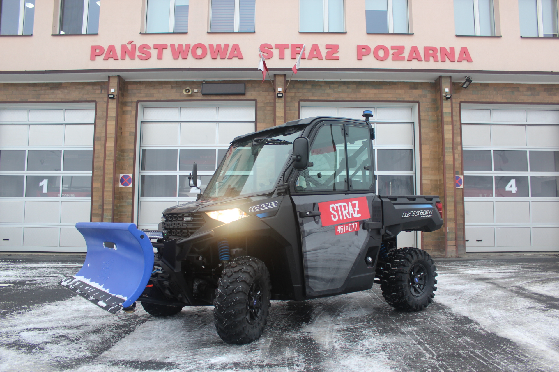 W dniu 10.12.2021 r. Komenda Powiatowa Państwowej Straży Pożarnej w Lesku wzbogaciła się o nowy pojazd typu QUAD UTV z przyczepą i pługiem. Pojazd firmy POLARIS RANGER 1000 posiada napęd terenowy i możliwość transportu sprzętu ratowniczego i gaśniczego. Quad UTV ułatwi dotarcie ratowników do osób poszkodowanych w trudno dostępnym bieszczadzkim terenie. Zakup pojazdu wzmocni potencjał ratowniczy Jednostki Ratowniczo-Gaśniczej w Lesku oraz podniesie poziom bezpieczeństwa mieszkańców powiatu leskiego i turystów wypoczywających w Bieszczadach.