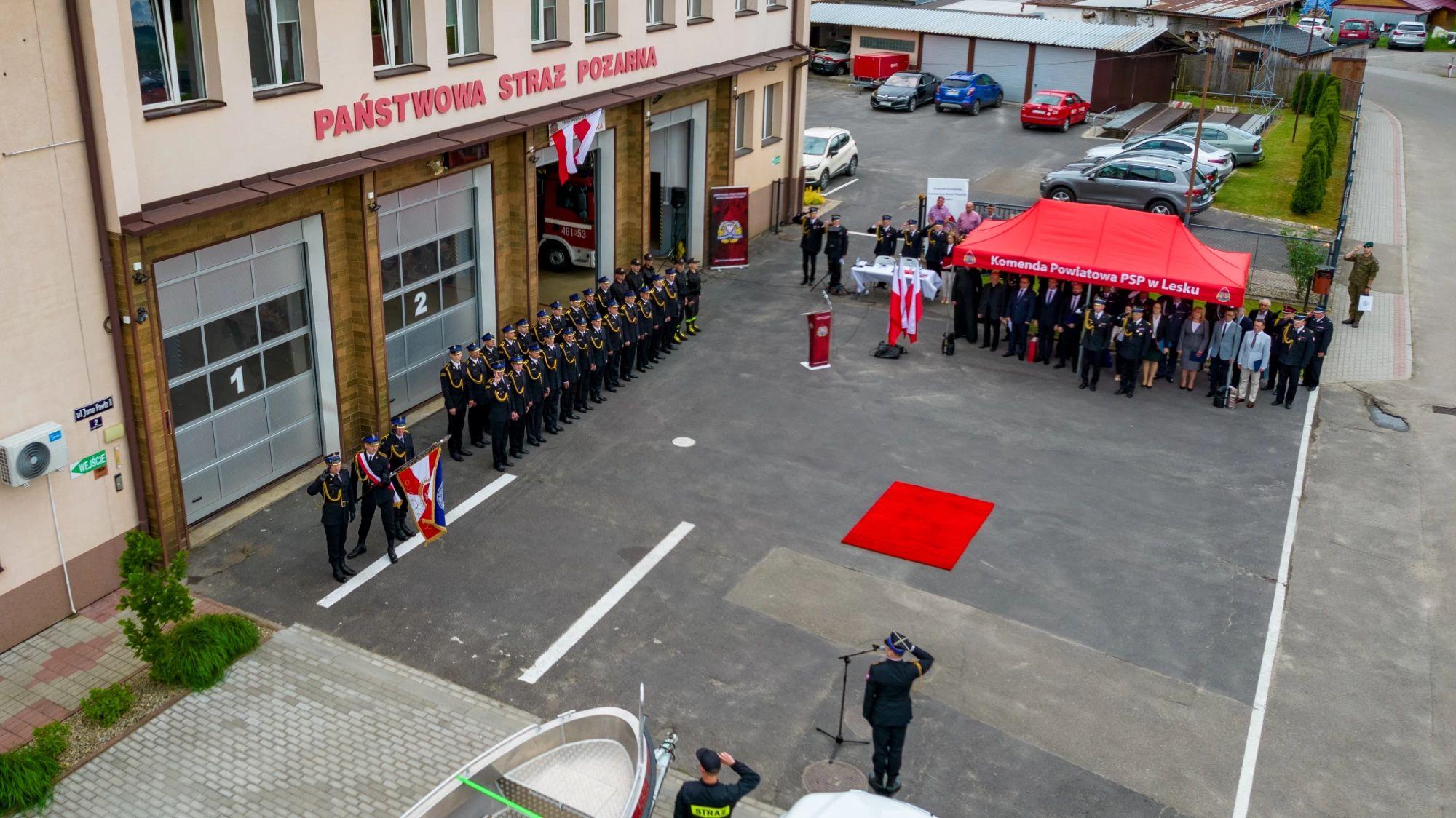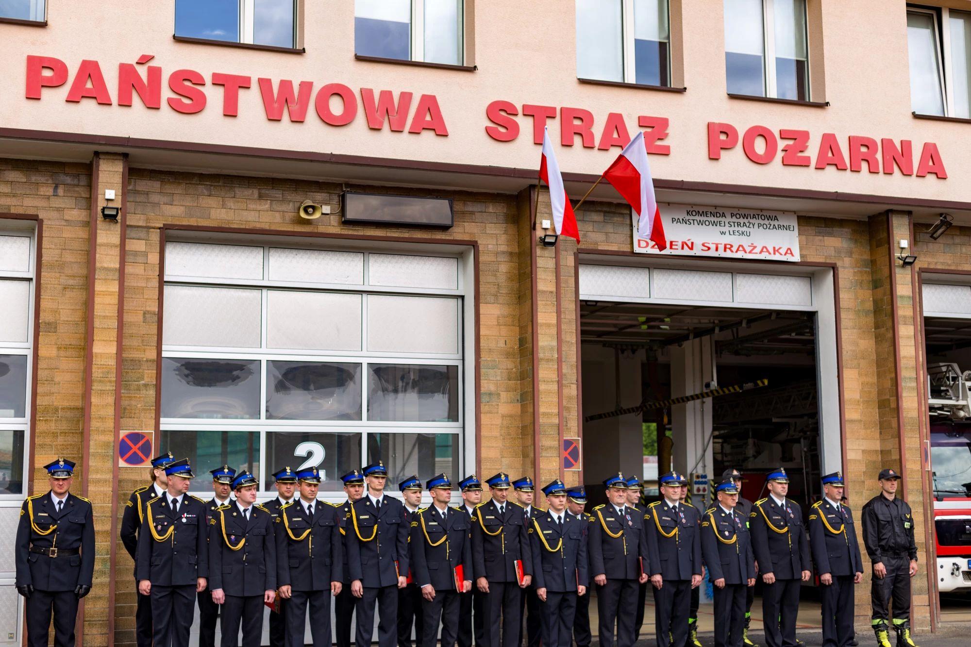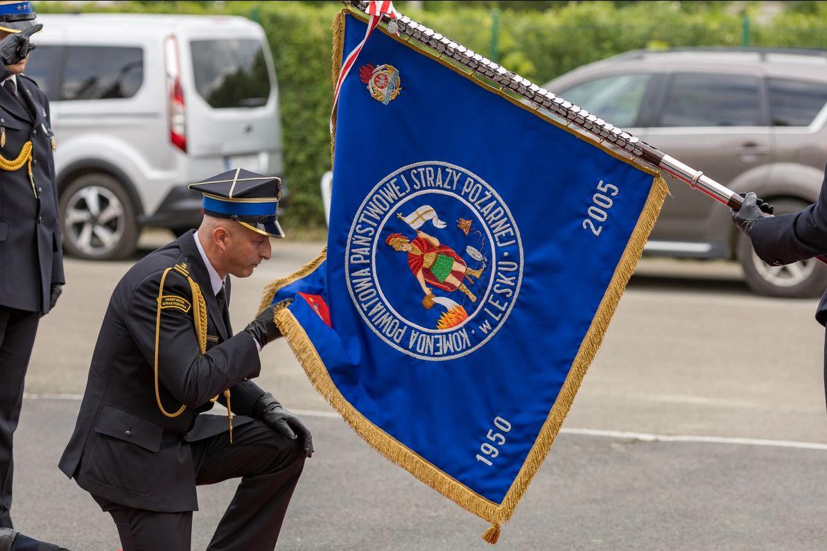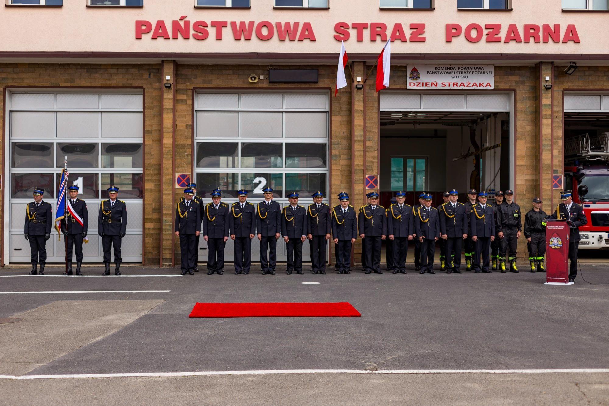 W środę, 22 maja 2024 r. w Komendzie Powiatowej PSP w Lesku odbyły się Powiatowe Obchody Dnia Strażaka połączone z powołaniem na stanowisko Komendanta Powiatowego PSP w Lesku bryg. Roberta Wojciechowskiego. Uroczystości rozpoczęły się Mszą Świętą w kościele pw. Nawiedzenia Najświętszej Marii Panny w Lesku, której przewodniczył ks. Artut Janiec Dyrektor Caritas Archidiecezji Przemyskiej. Po Eucharystii, na placu zewnętrznym Komendy Powiatowej PSP w Lesku odbyły się główne uroczystości, które rozpoczęto złożeniem meldunku przez dowódcę uroczystości kpt. Tomasza Sykuta, Podkarpackiemu Komendantowi Wojewódzkiemu PSP st. bryg. Tomaszowi Baranowi. Program obchodów obejmował przywitanie pododdziału, podniesienie flagi państwowej oraz odegranie hymnu państwowego, powołanie na stanowisko Komendanta Powiatowego PSP w Lesku oraz Jego wystąpienie okolicznościowe, wręczenie odznaczeń oraz aktów nominacji na wyższe stopnie służbowe, poświęcenie pojazdów pożarniczych i łodzi, wystąpienia okolicznościowe.