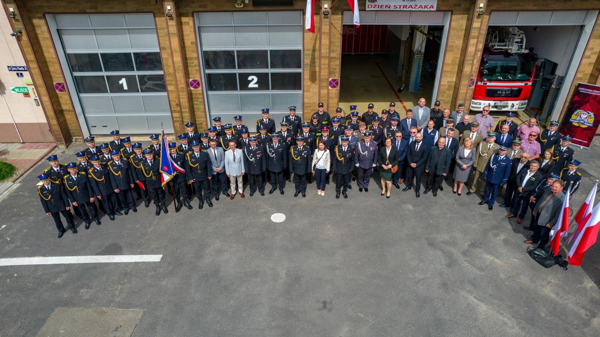 Uroczystości swoją obecnością uświetnili: Pani Ewa Mrugała przedstawicielka Posłanki do Parlamentu Europejskiego Pani Elżbiety Łukacijewskiej, Pani Aneta Figiel przedstawicielka posła na Sejm RP Pana Piotra Uruskiego, Pan Grzegorz Lonc Dyrektor Wydziału Bezpieczeństwa i Zarzadzania Kryzysowego przedstawiciel Wojewody Podkarpackiego Pani Teresy Kubas-Hul, Zastępca Dyrektora Caritas Diecezji Rzeszowskiej ks. Bogdan Janik, Proboszcz Parafii Rzymskokatolickiej w Lesku ks. Mieczysław Bąk, Starosta leski Pan Wojciech Stelmach, Burmistrz Miasta i Gminy Lesko Pan Adam Snarski, Wójt Gminy Olszanica Pan Krzysztof Zapała, Wójt Gminy Bukowsko Pan Marek Bańkowski, komendanci i dowódcy służb mundurowych, emerytowani funkcjonariusze KP PSP Lesko wraz z st. bryg. w stanie spoczynku Jackiem Dydkiem byłym Komendantem Powiatowym PSP w Lesku oraz przedstawiciele instytucji, na co dzień współpracujących z naszą formacją.