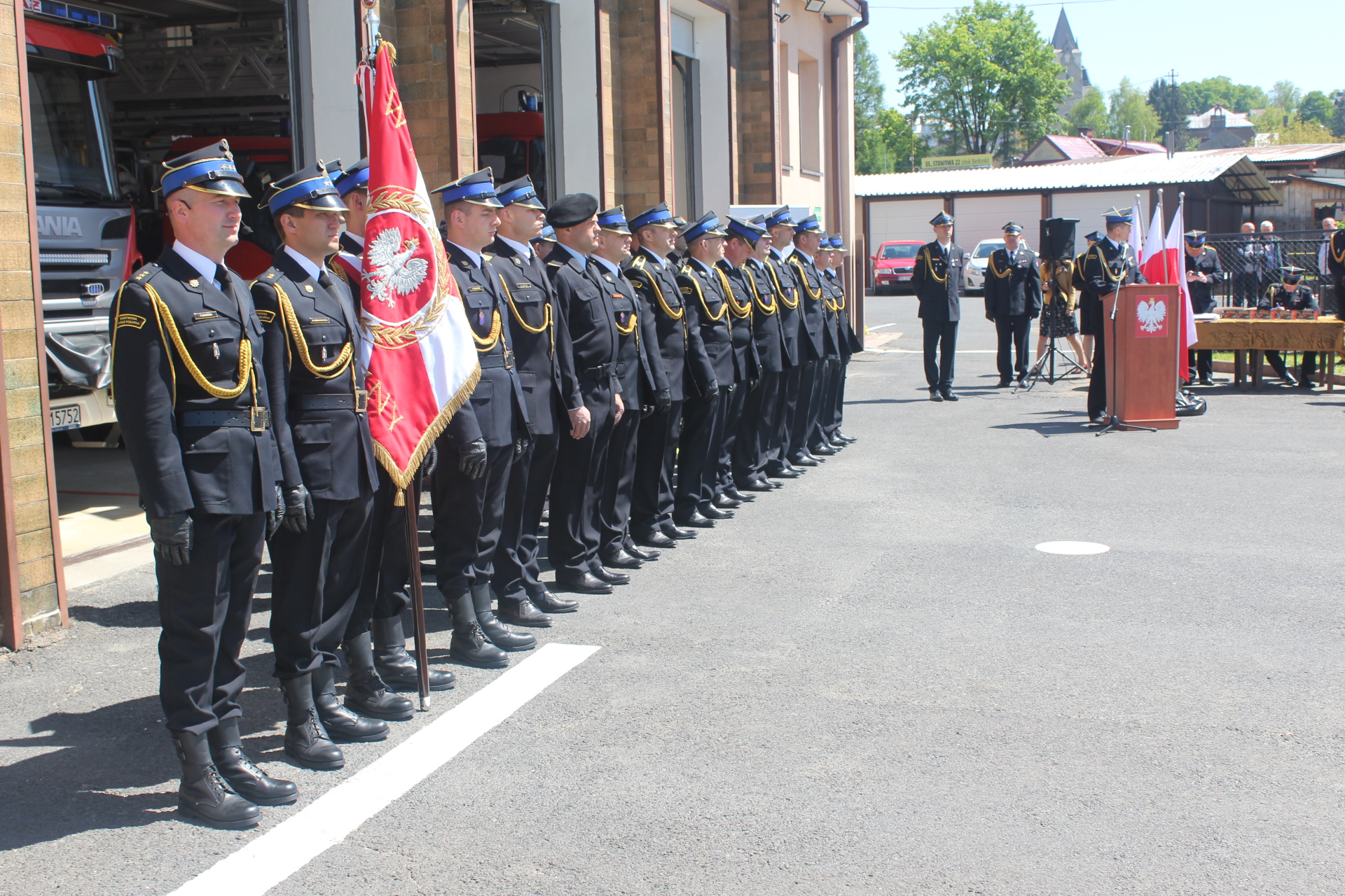 wystąpienie okolicznościowe Komendanta Powiatowego Państwowej Straży Pożarnej w Lesku, wręczenie odznaczeń oraz aktów nominacji na wyższe stopnie służbowe, wystąpienia okolicznościowe, wręczenie pamiątkowych medali z okazji 30-lecie Państwowej Straży Pożarnej oraz poświęcenie pojazdów pożarniczych.
