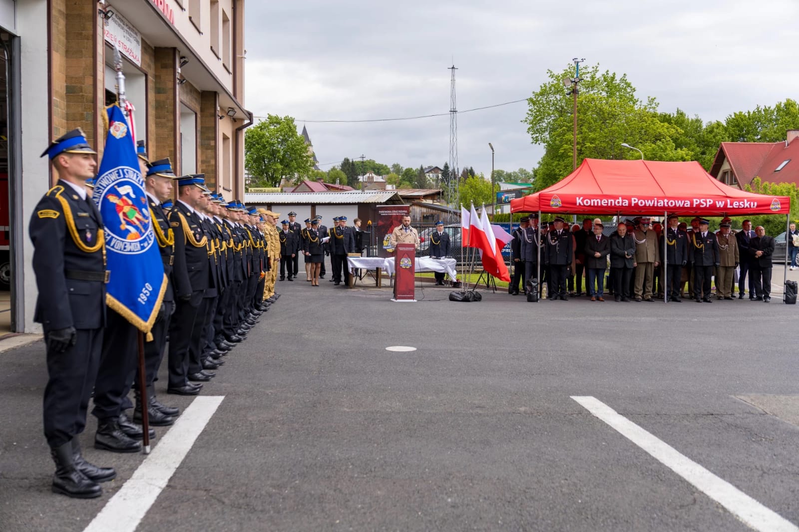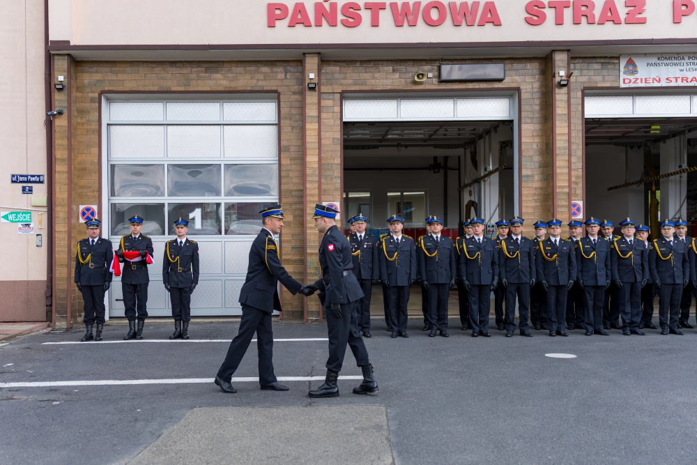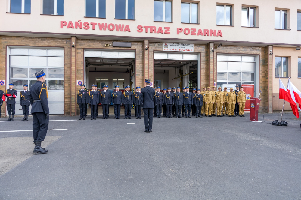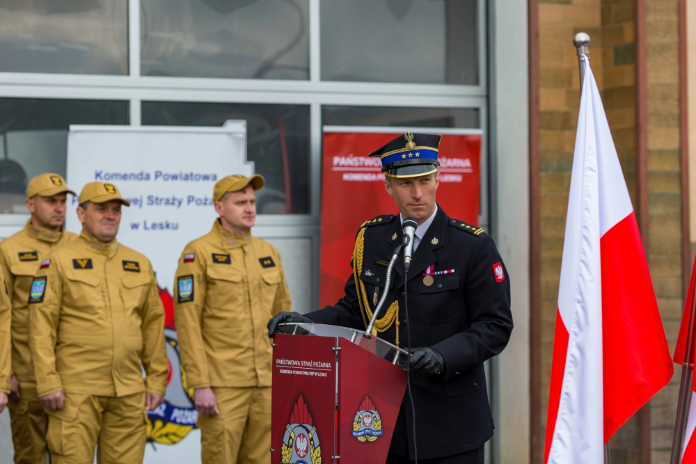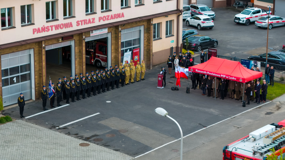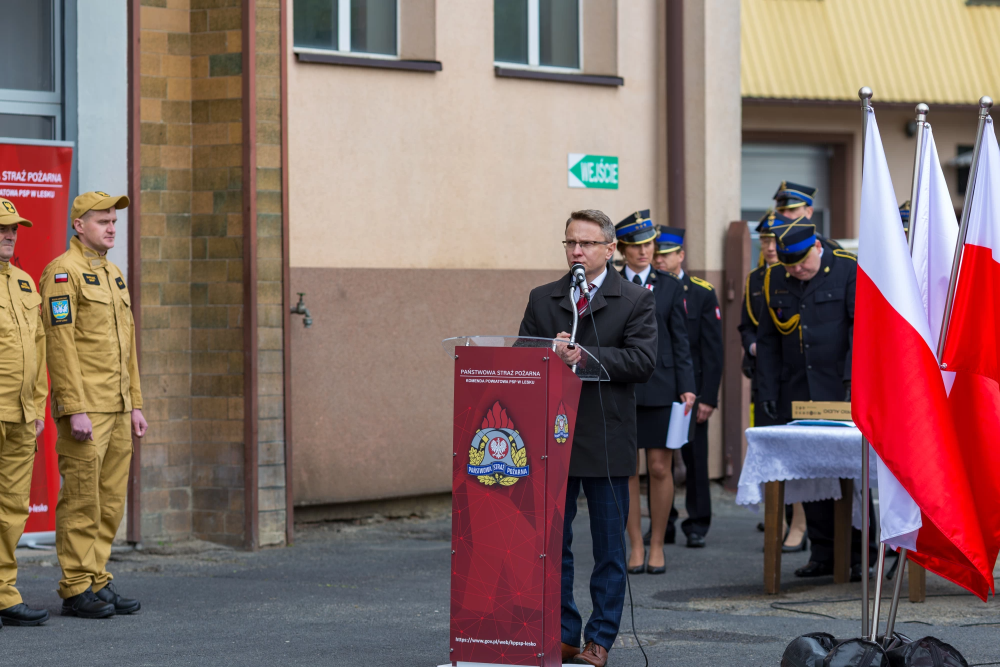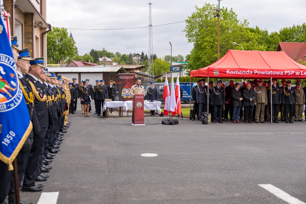 W środę 14 maja 2025r w Komendzie Powiatowej Państwowej Straży Pożarnej w Lesku odbyły się Powiatowe Obchody Dnia Strażaka. Uroczystości rozpoczęły się Mszą Świętą w kościele pw. Nawiedzenia Najświętszej Maryi Panny w Lesku. Po zakończeniu Eucharystii, na placu zewnętrznym Komendy Powiatowej PSP w Lesku miał miejsce uroczysty apel przeprowadzony zgodnie z ceremoniałem pożarniczym. Uroczystości rozpoczęły się od złożenia meldunku, który odebrał Zastępca Podkarpackiego Komendanta Wojewódzkiego PSP st. bryg. Adam Wiśniewski. Następnie dokonano przeglądu i przywitania pododdziału, wprowadzono sztandar Komendy oraz podniesiono flagę państwową przy akompaniamencie hymnu państwowego. Wszyscy zgromadzeni wysłuchali przemówienia okolicznościowego Komendanta Powiatowego PSP w Lesku, bryg. Roberta Wojciechowskiego, które zawierało w sobie podsumowanie działalności za ubiegły rok, podziękowanie dla strażaków i pracowników cywilnych tutejszej Komendy, a także instytucji współpracujących, mowa była również o planach na przyszłość.