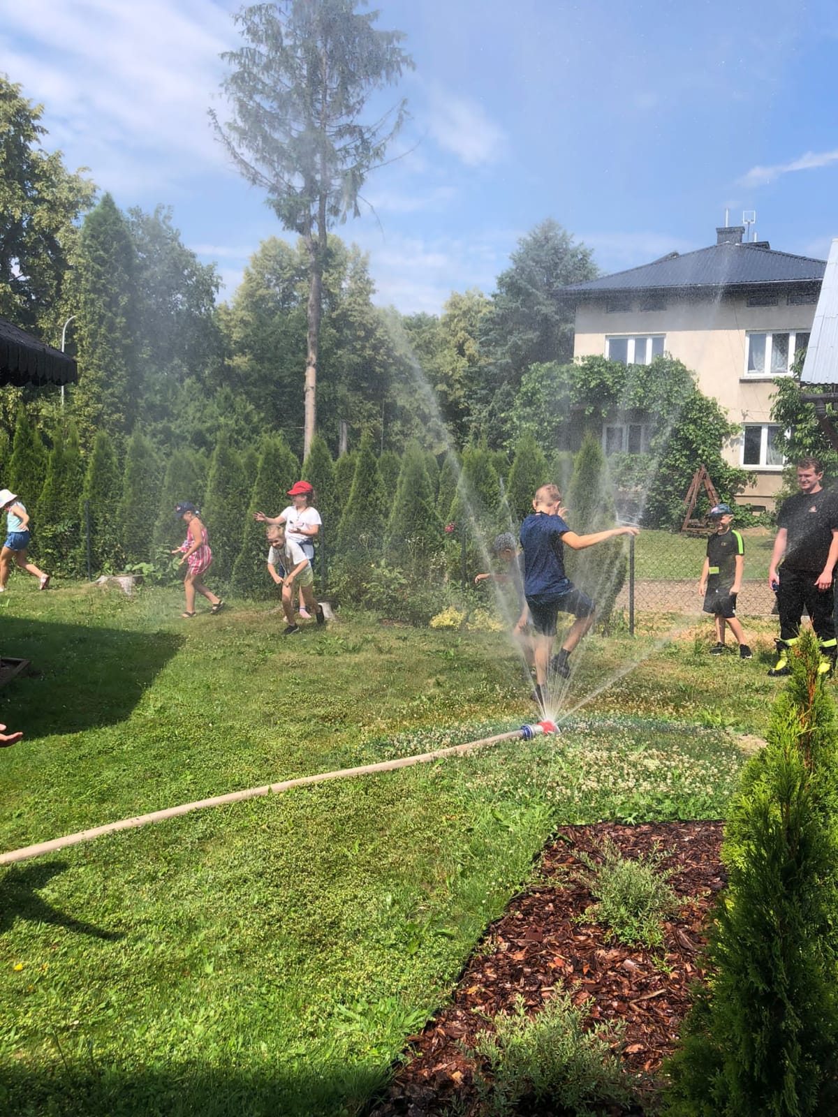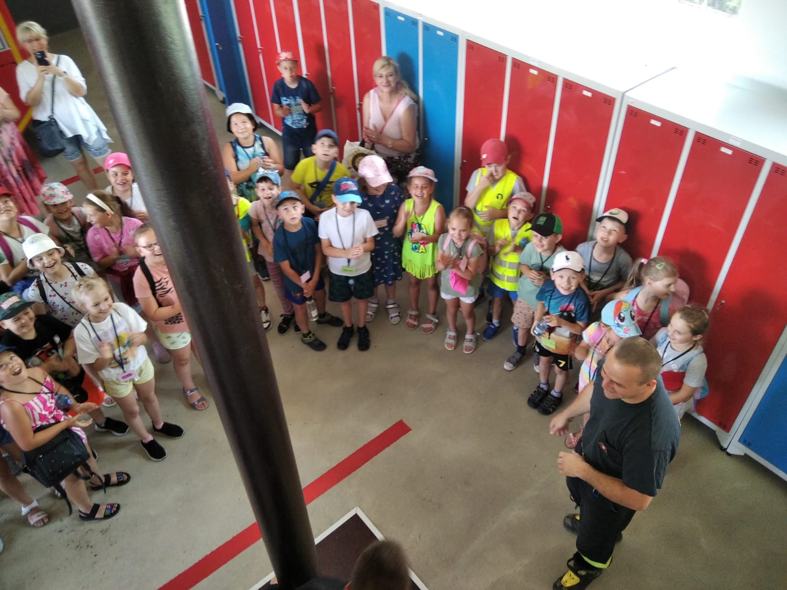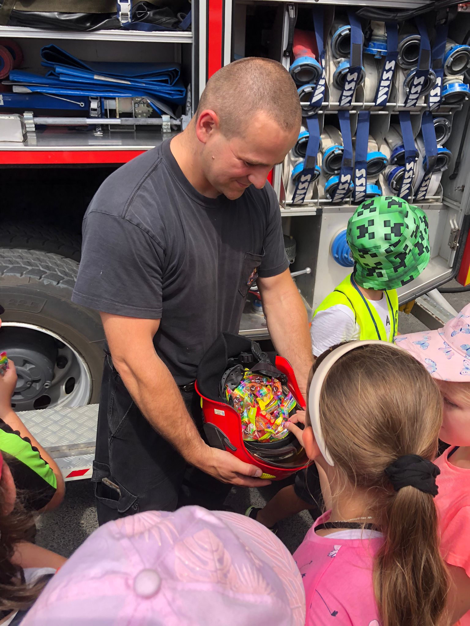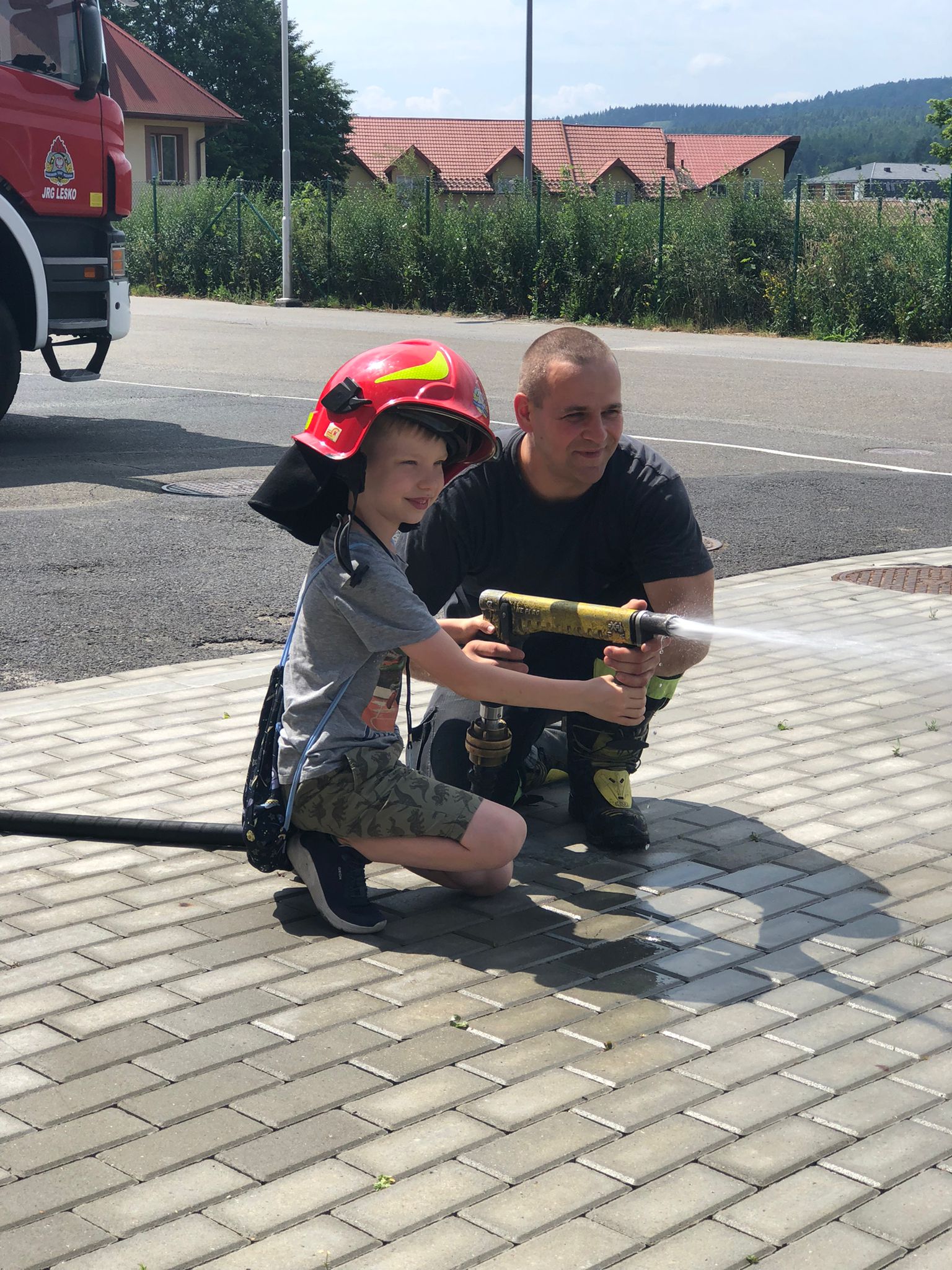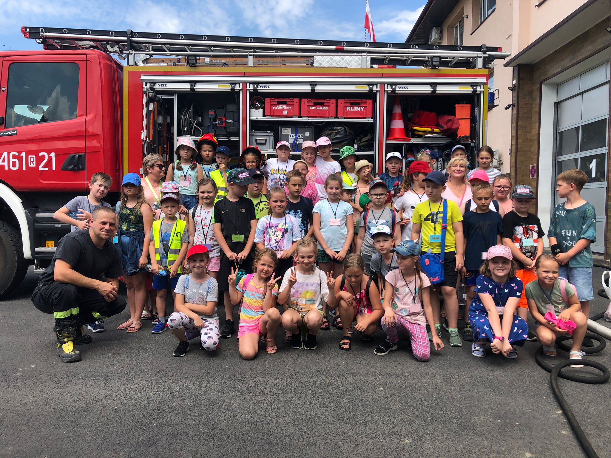 przebywające na półkolonii w Szkole Podstawowej w Lesku. Dzieciom zapewniono dużo różnych atrakcji oraz zabaw związanych z tematyką pożarniczą oraz wszelakiego bezpieczeństwa.