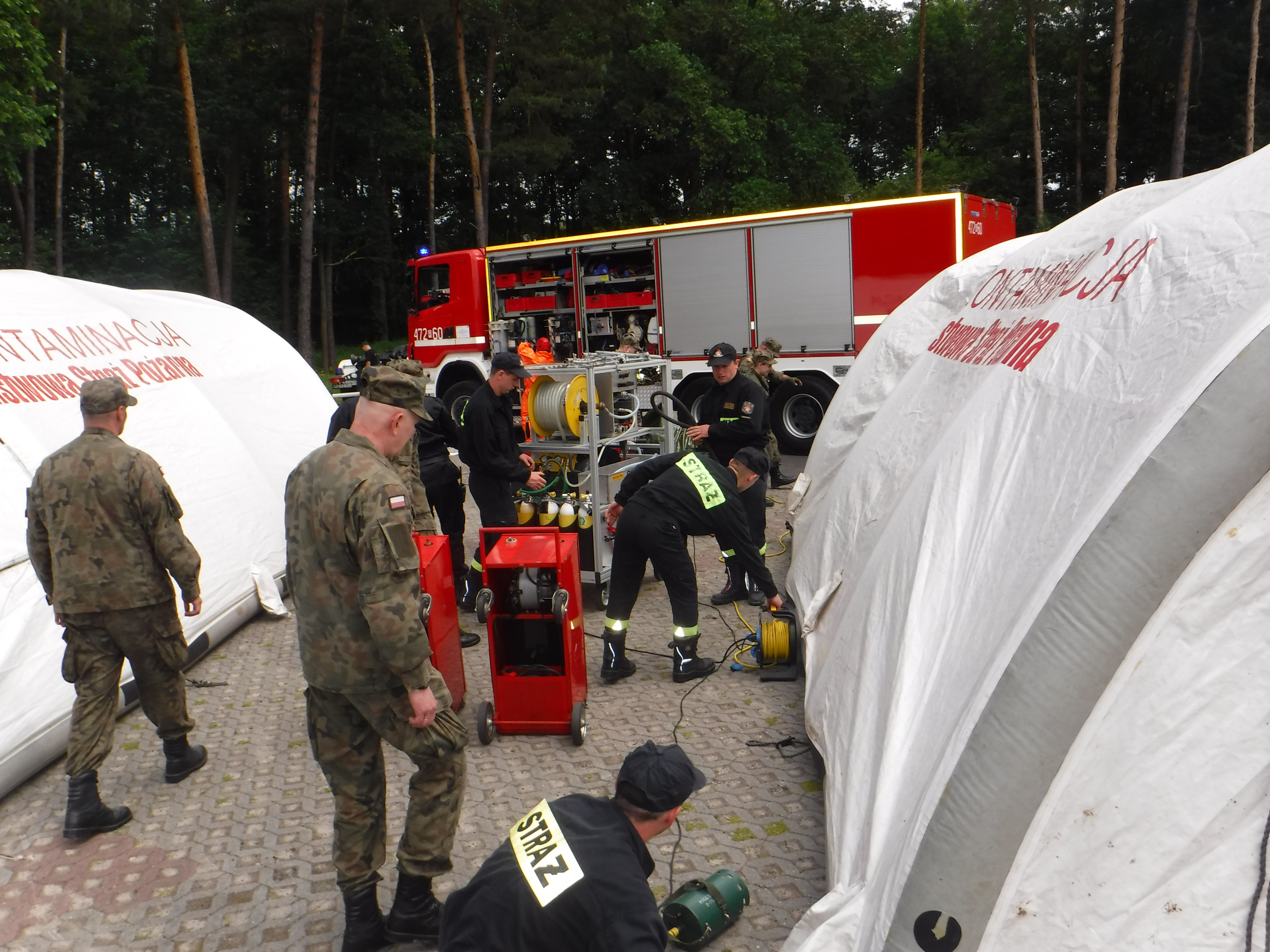 9-11 czerwca br. na terenie na terenie Centrum Szkolenia Klas Mundurowych w Nowej Sarzynie odbyły się ćwiczenia zgrywające, obejmujące współdziałanie Specjalistycznych Grup Ratownictwa Chemiczno- Ekologicznego „Leżajsk” i „Rzeszów 2”, które funkcjonują w ramach centralnego odwodu operacyjnego Państwowej Straży Pożarnej.