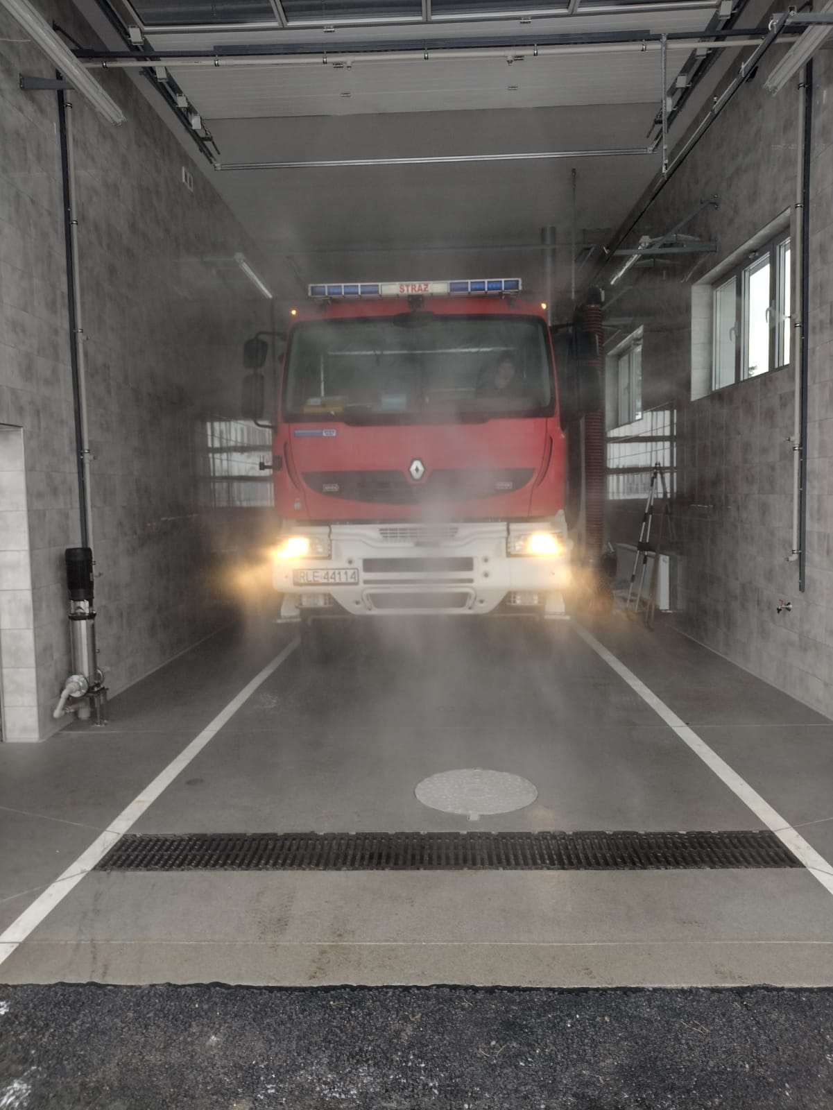 Nowy budynek posiada 4 stanowiska garażowe dla samochodów pożarniczych oraz pomieszczenie do dekontaminacji pojazdów i sprzętu specjalistycznego używanego podczas działań ratowniczych w środowisku skażonym niebezpiecznymi substancjami chemicznymi.