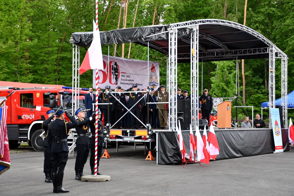 Uroczystość rozpoczęła się złożeniem meldunku zastępcy komendanta głównego PSP nadbryg. dr. inż. Adamowi Koniecznemu, który następnie dokonał przeglądu pododdziałów i przywitał się ze strażakami. Kolejno nastąpiło uroczyste podniesienie flagi na maszt, odegranie i odśpiewanie hymnu państwowego.