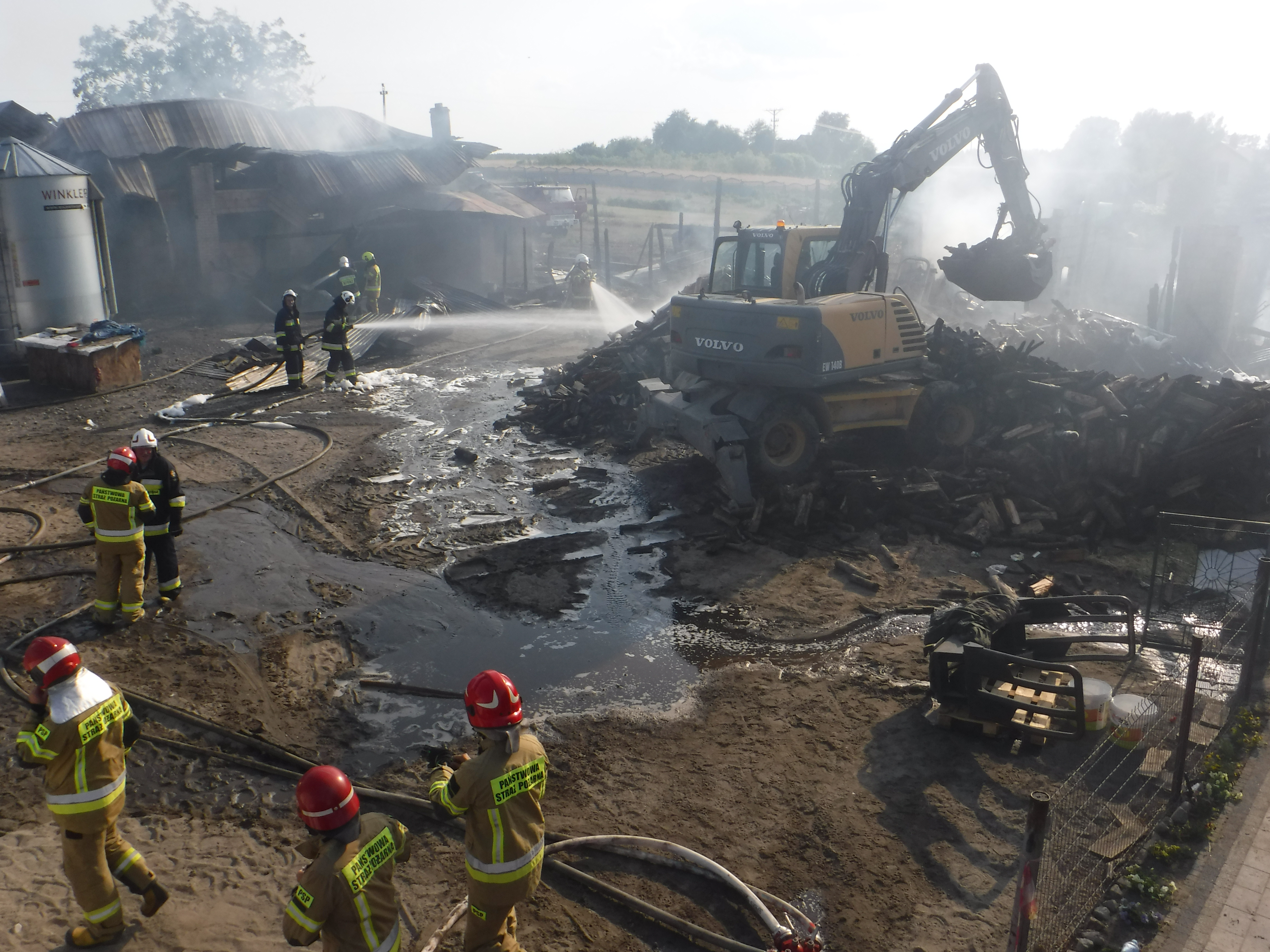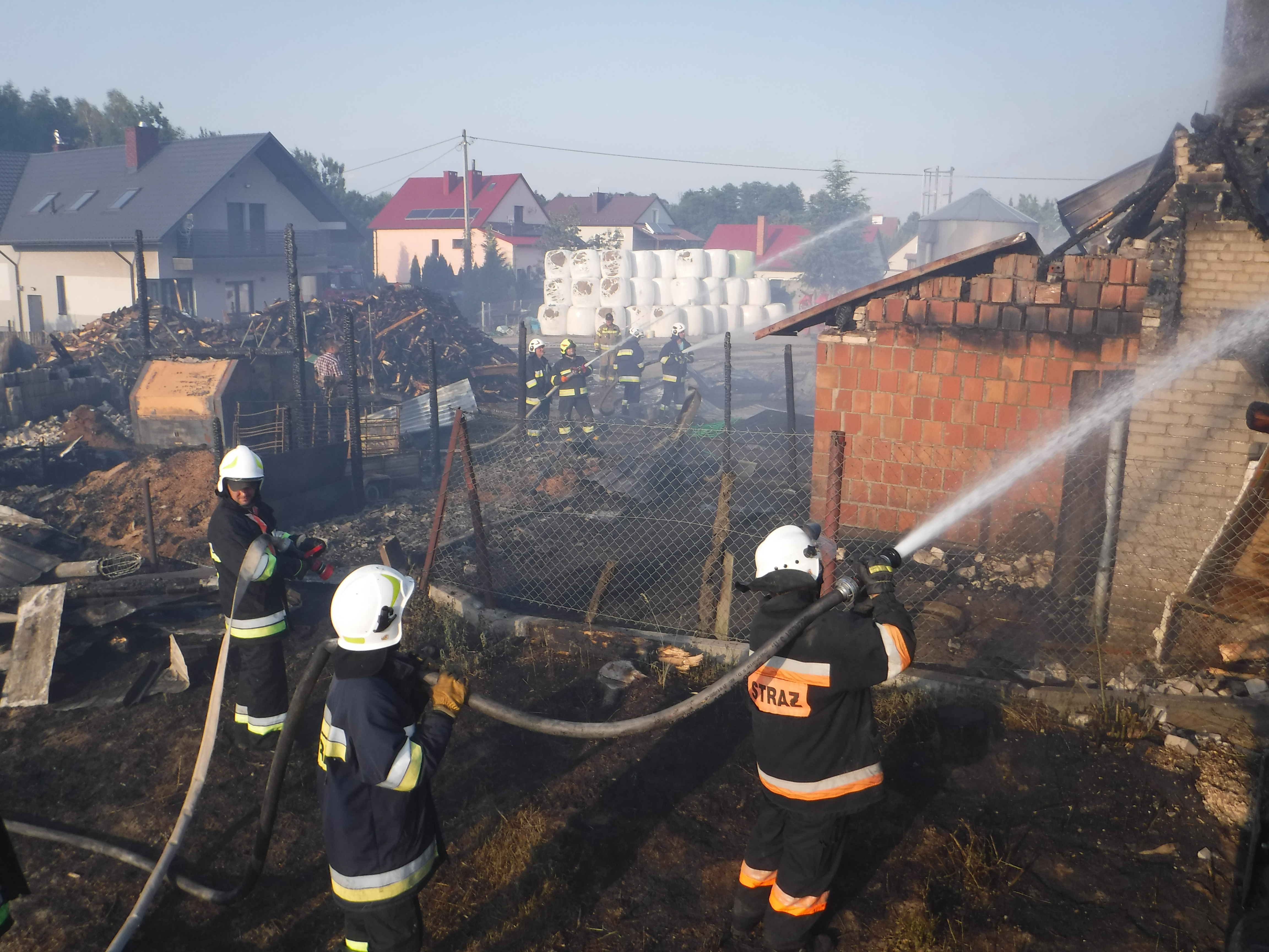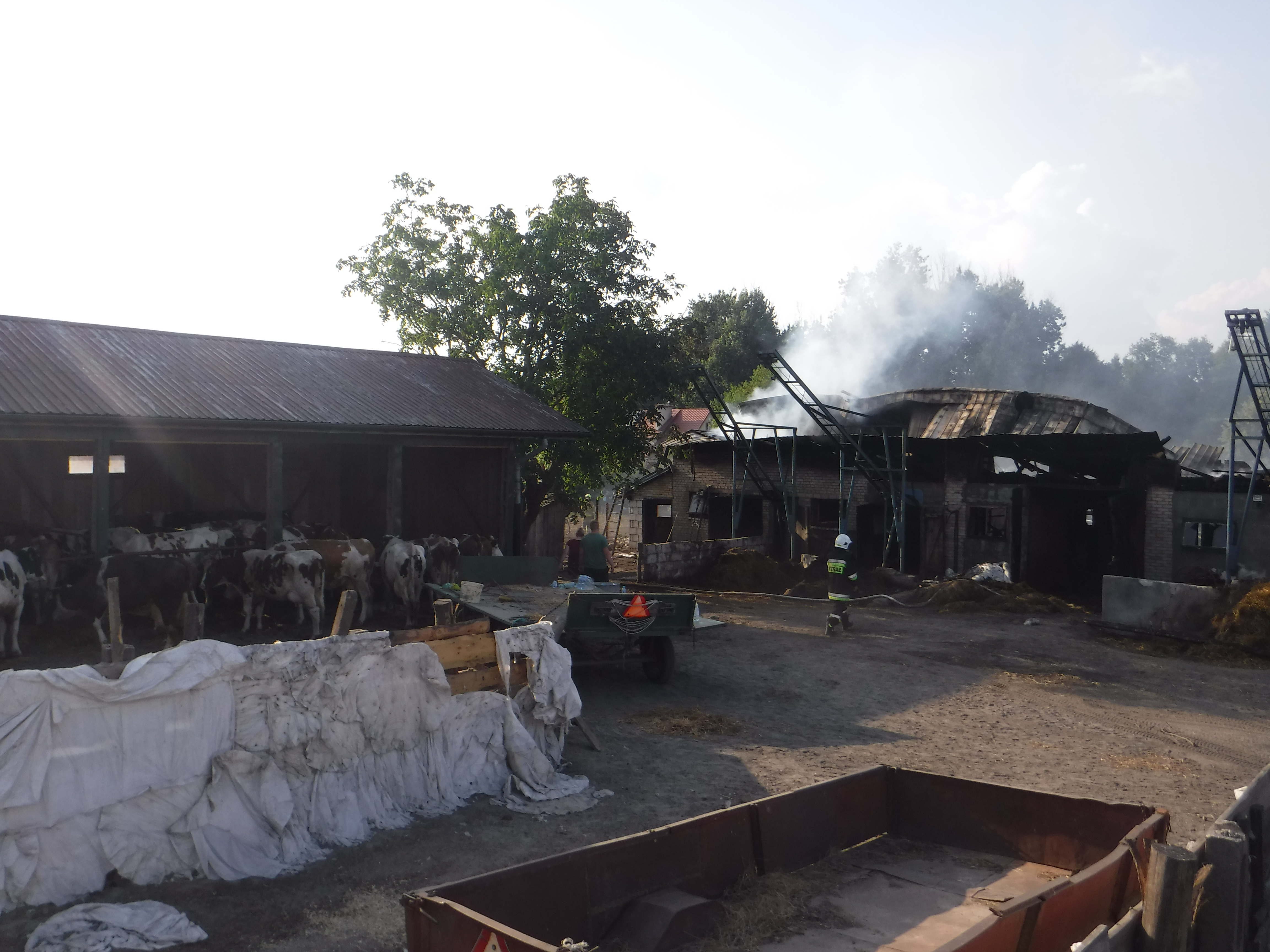 Strażacy natychmiast przystąpili do gaszenia palących się budynków i podjęli działania w obronie budynku mieszkalnego. Przeprowadzili ewakuację krów z budynku inwentarskiego oraz urządzeń gospodarczych. Podczas akcji konieczna była częsta podmiana ratowników ze względu na wyczerpanie spowodowane wysoką temperaturą pożaru i pracą w upale 34oC.