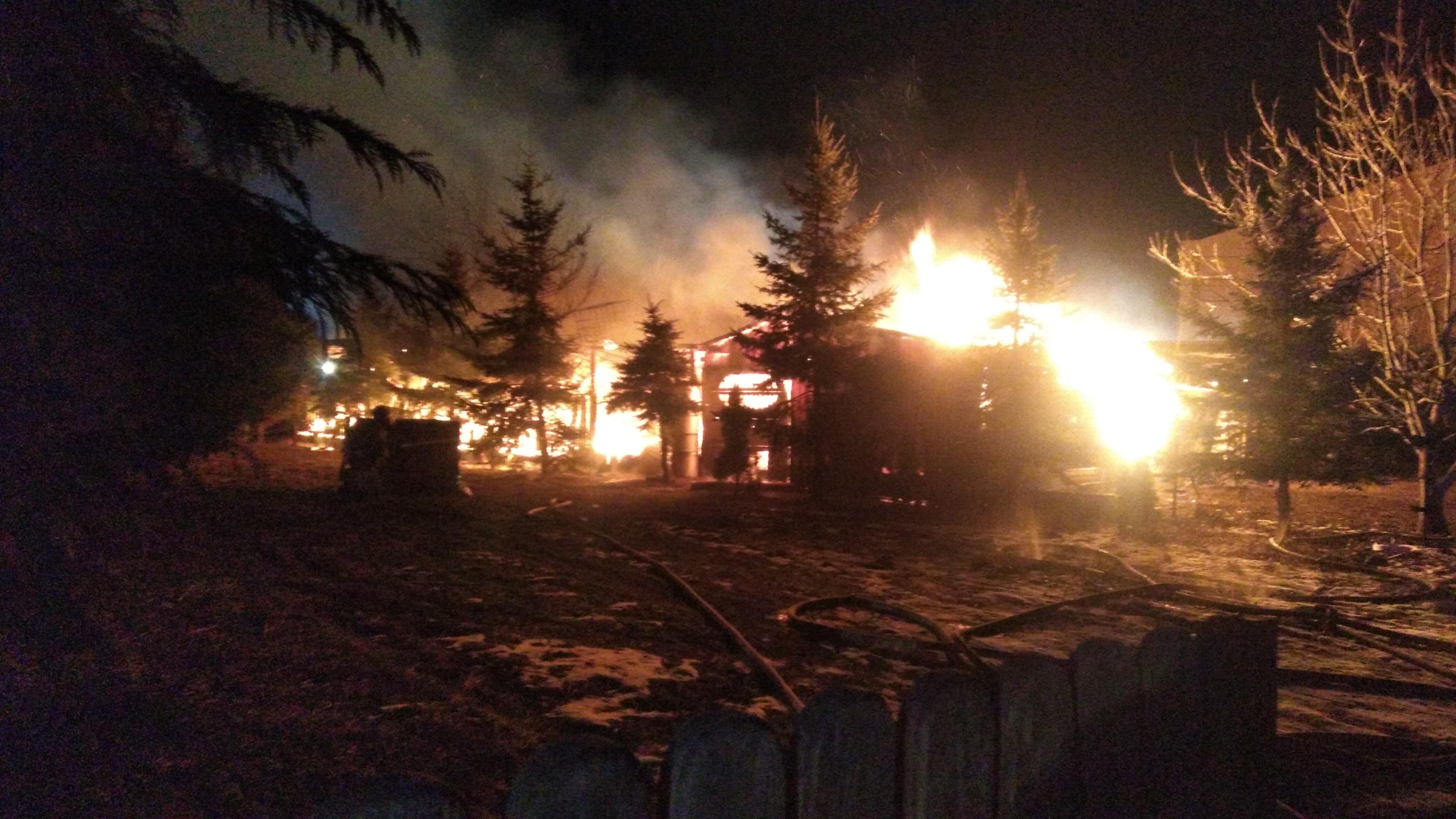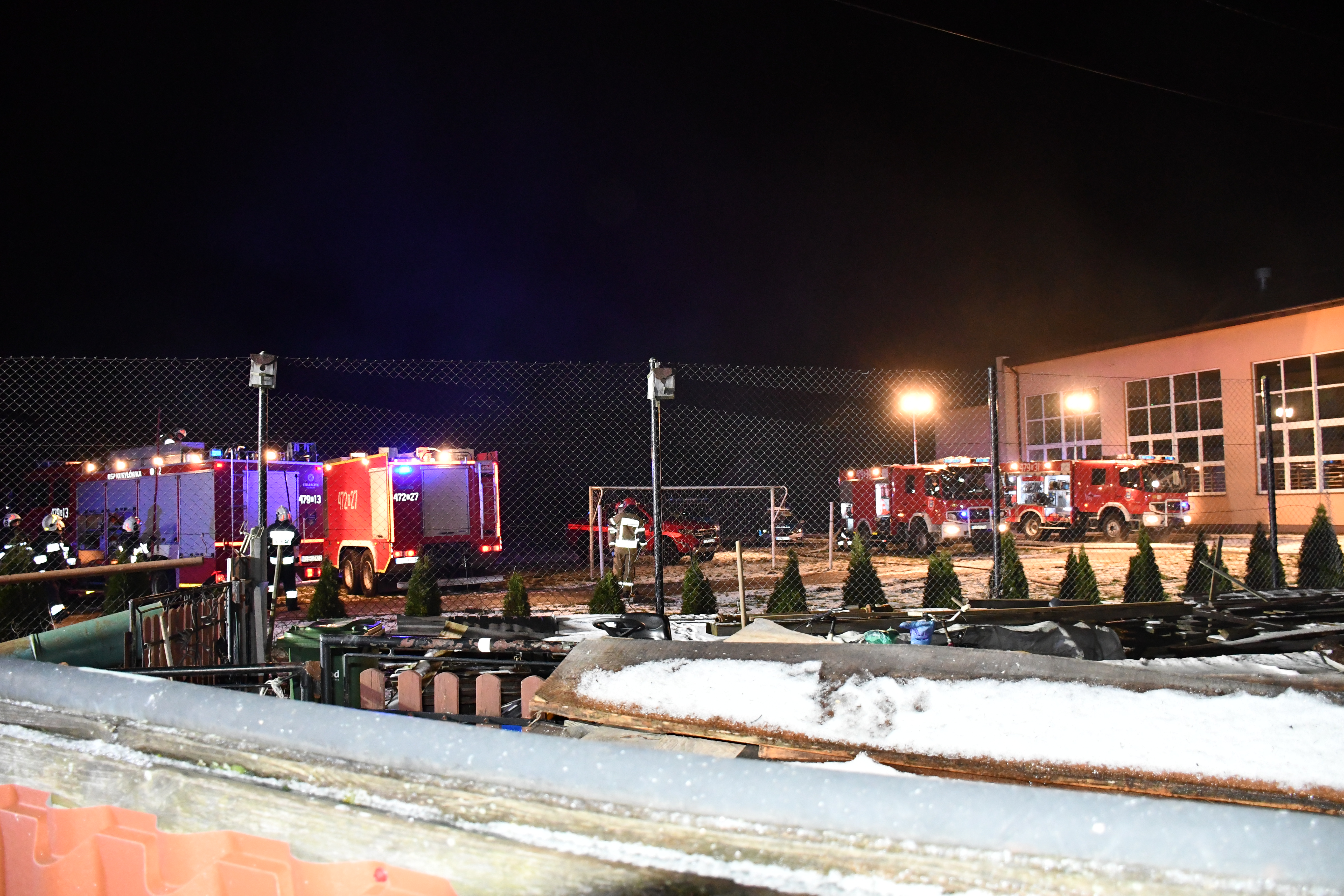 Po przyjeździe na miejsce pierwszych zastępów okazało się, że pożarem objęty został kompleks połączonych ze sobą wiat drewnianych, w których zgromadzone były maszyny i sprzęt stolarski oraz drewno opałowe. Bezpośrednio zagrożone były sąsiadujący budynek szkoły podstawowej oraz dom mieszkalny.
