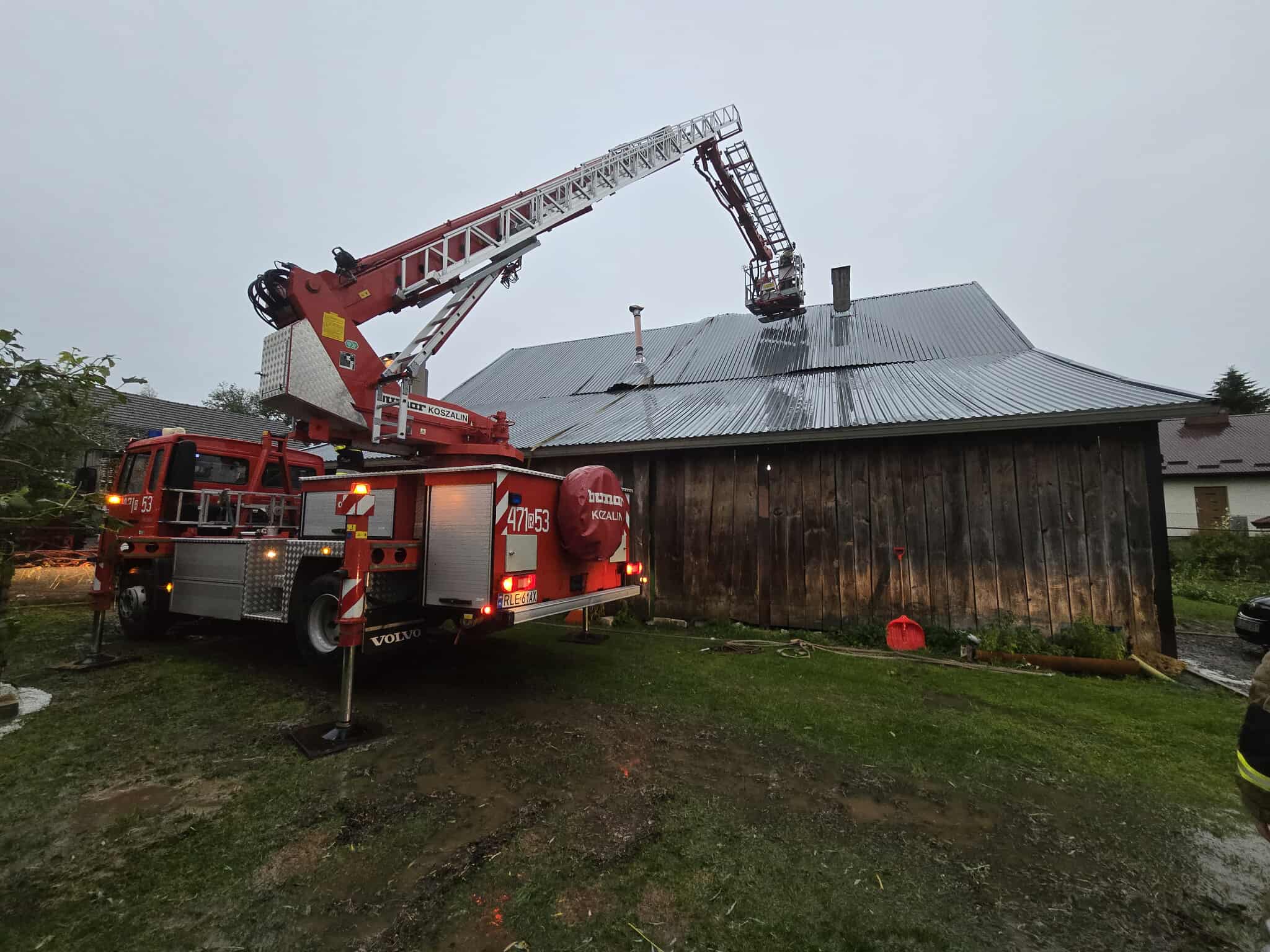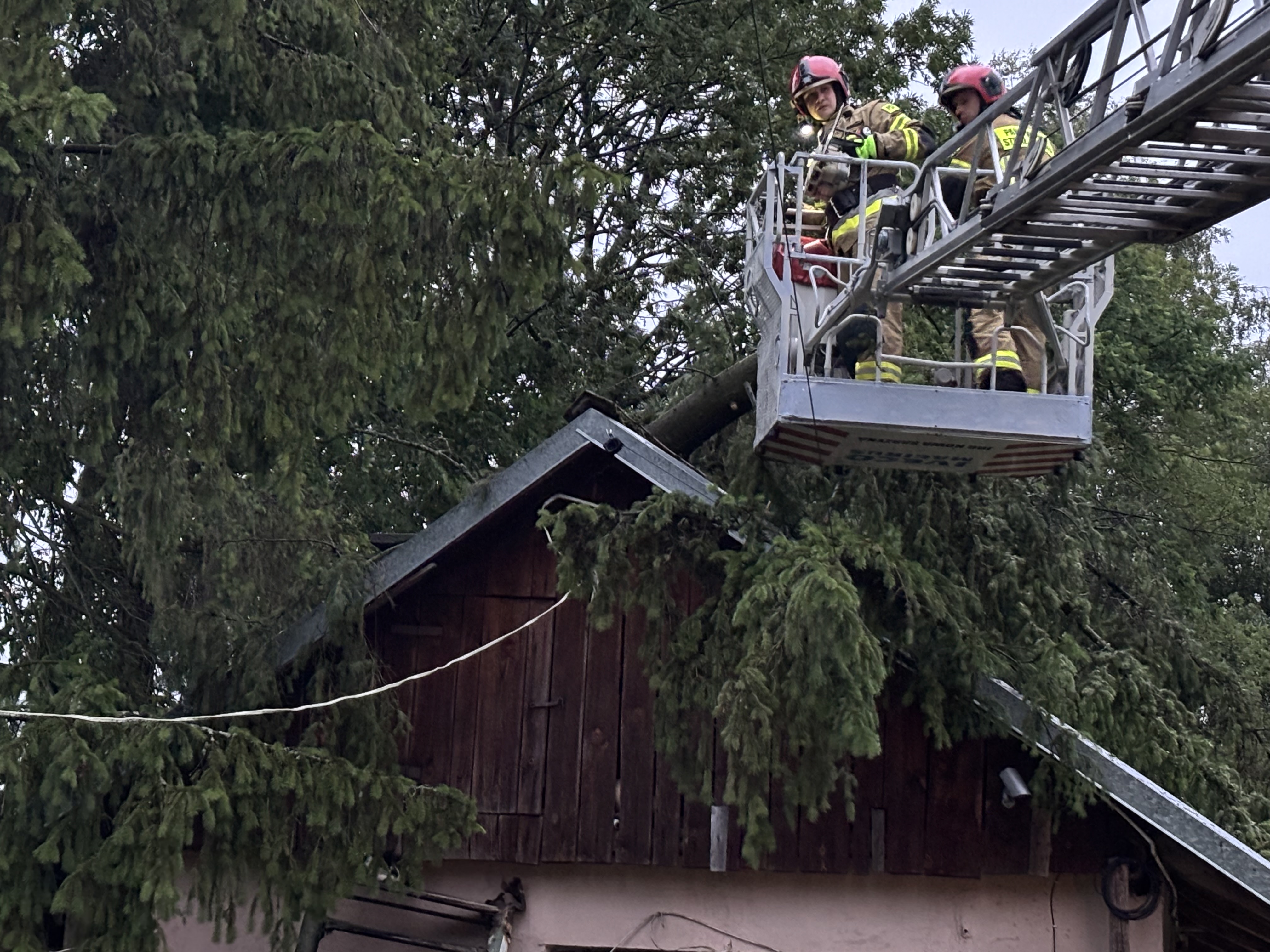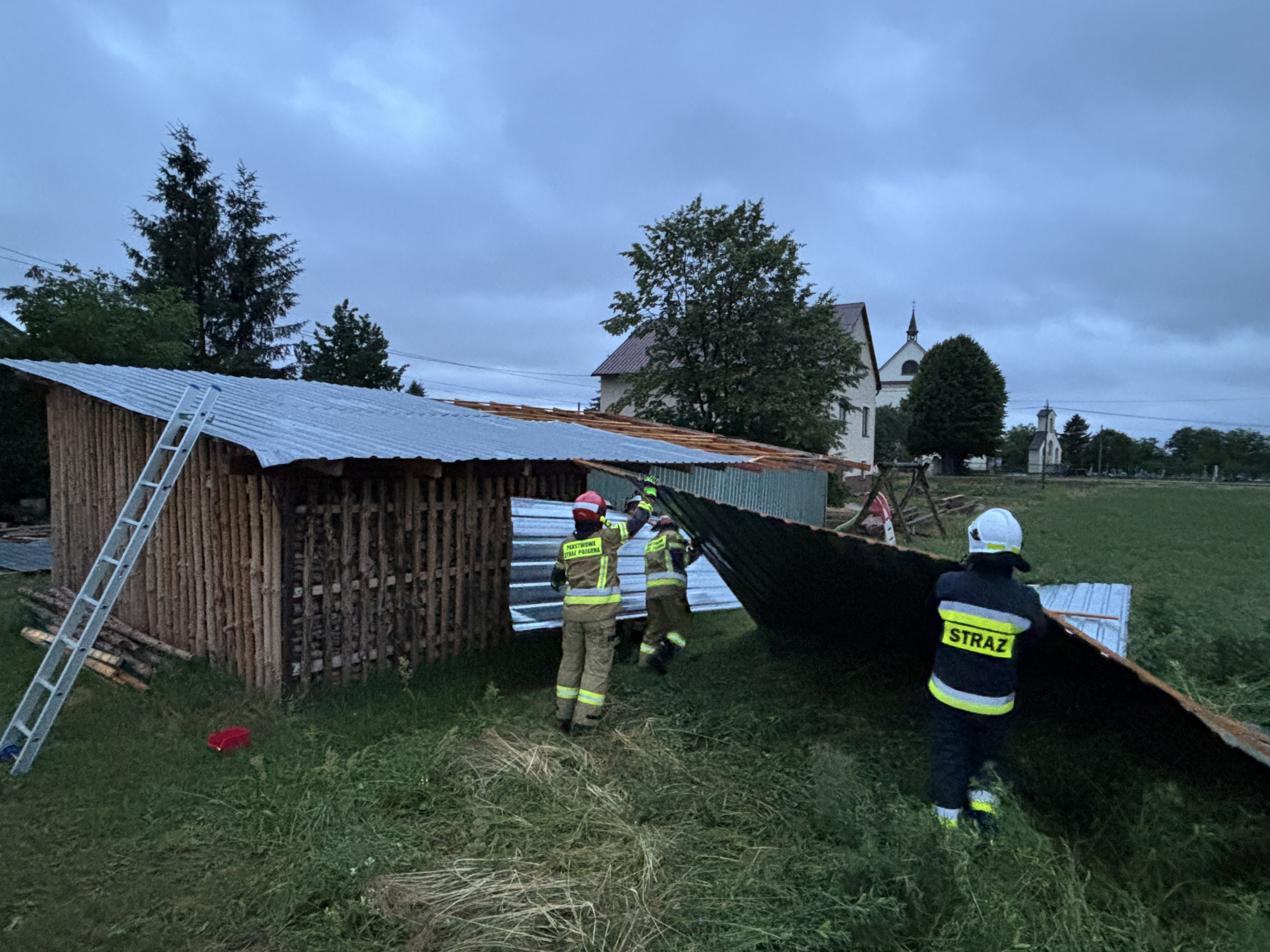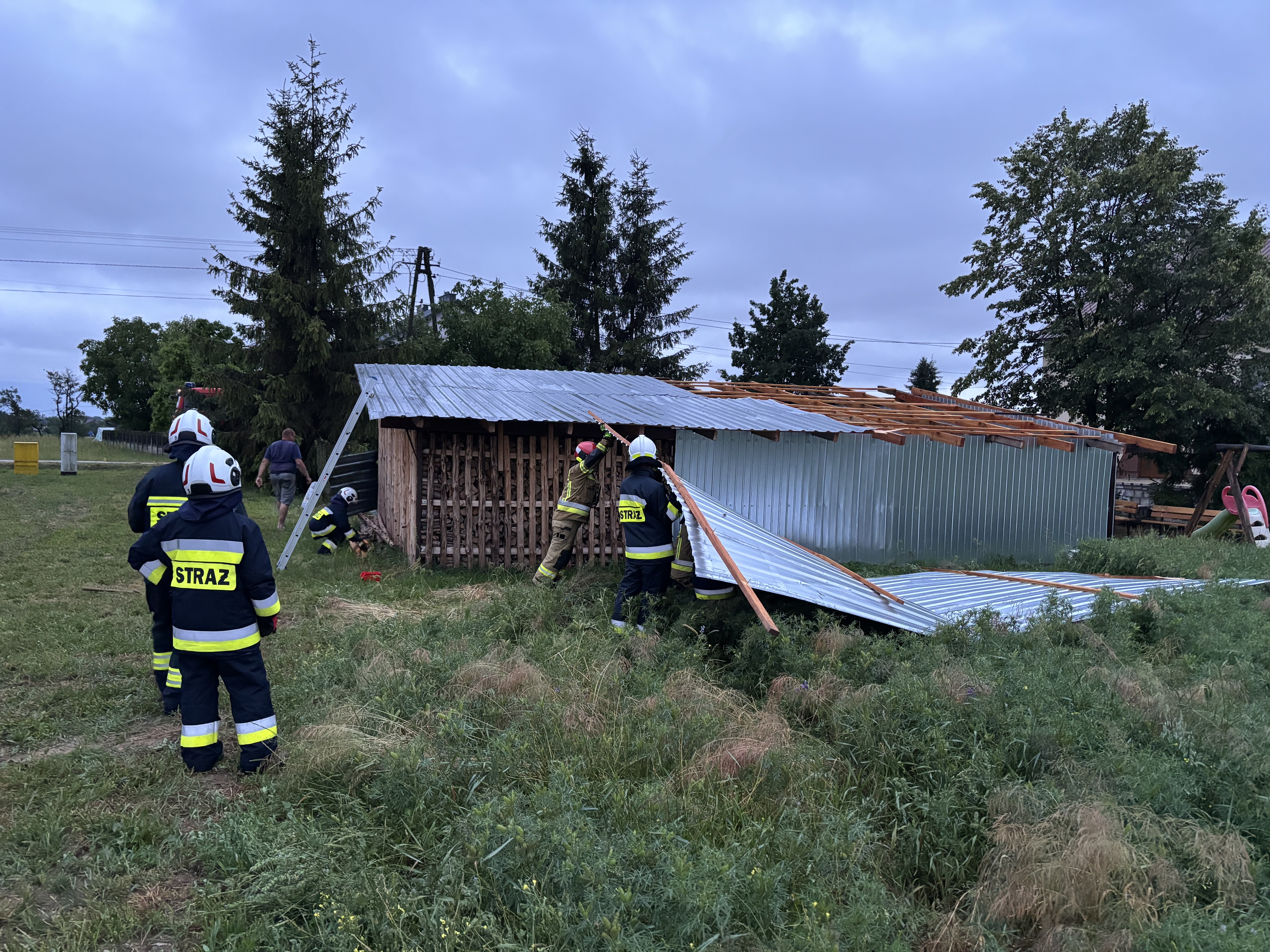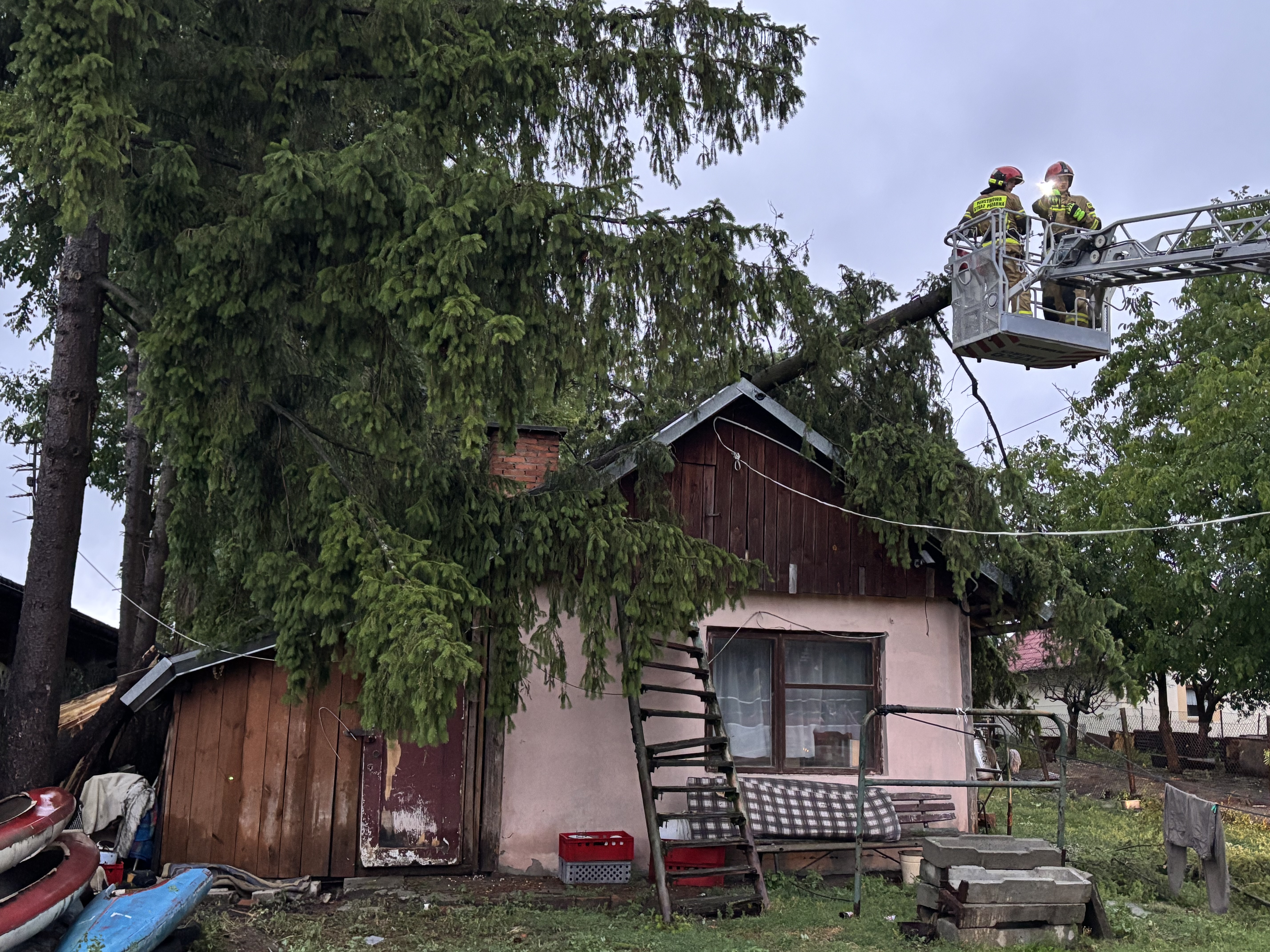 Strażacy zabezpieczali uszkodzone dachy budynków, usuwali powalone drzewa tarasujące drogi oraz zalegające na budynkach i samochodzie.