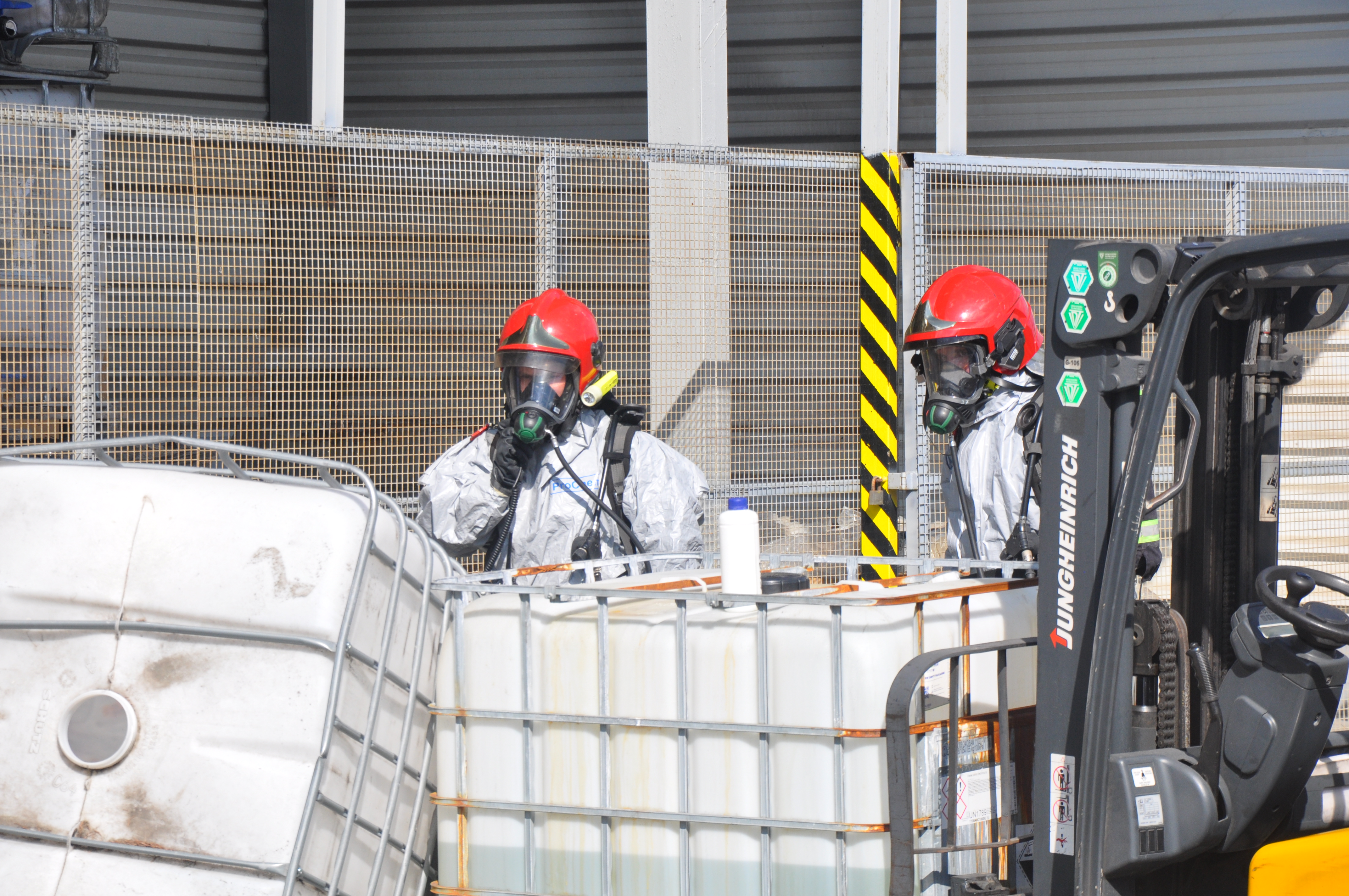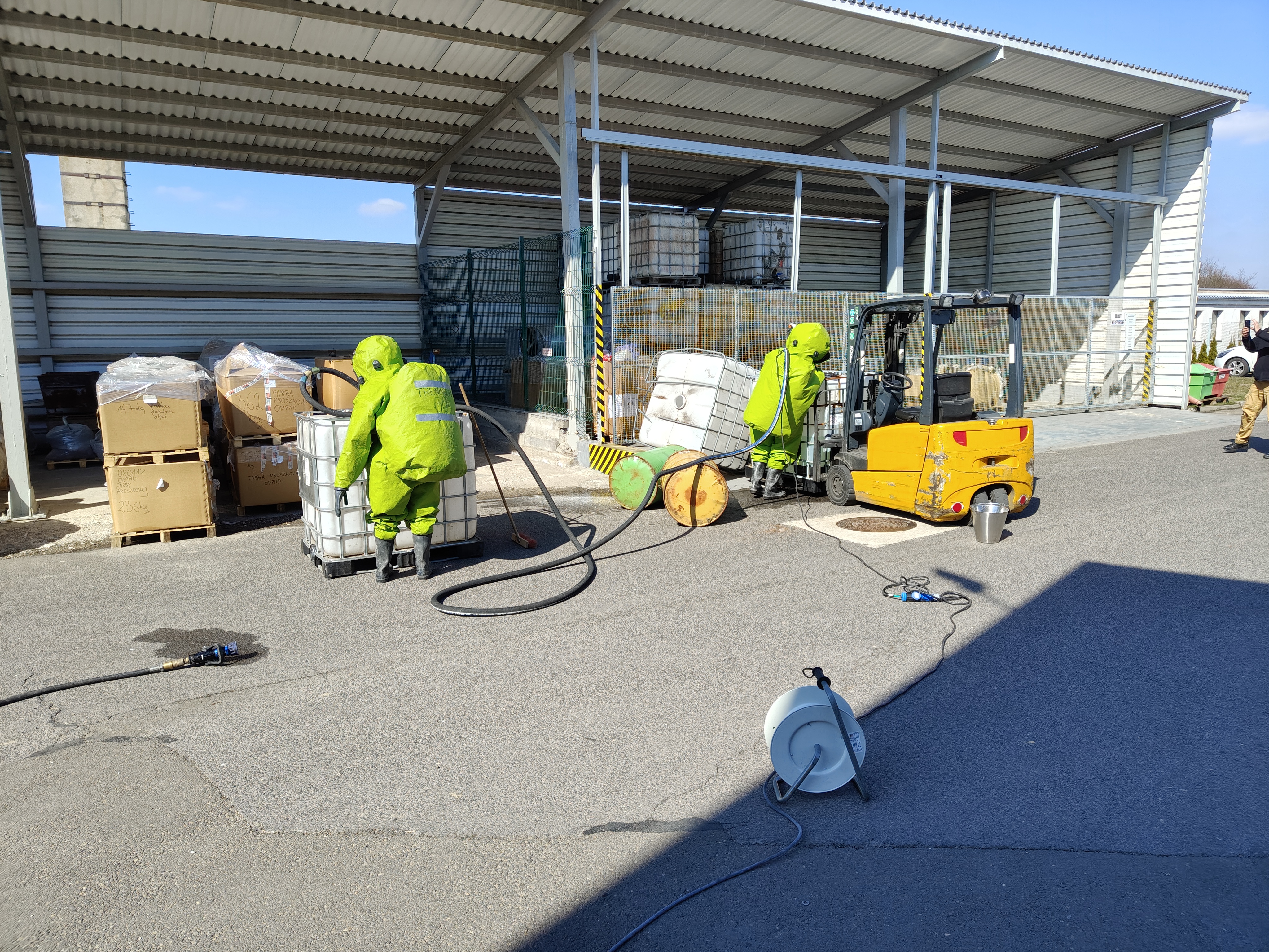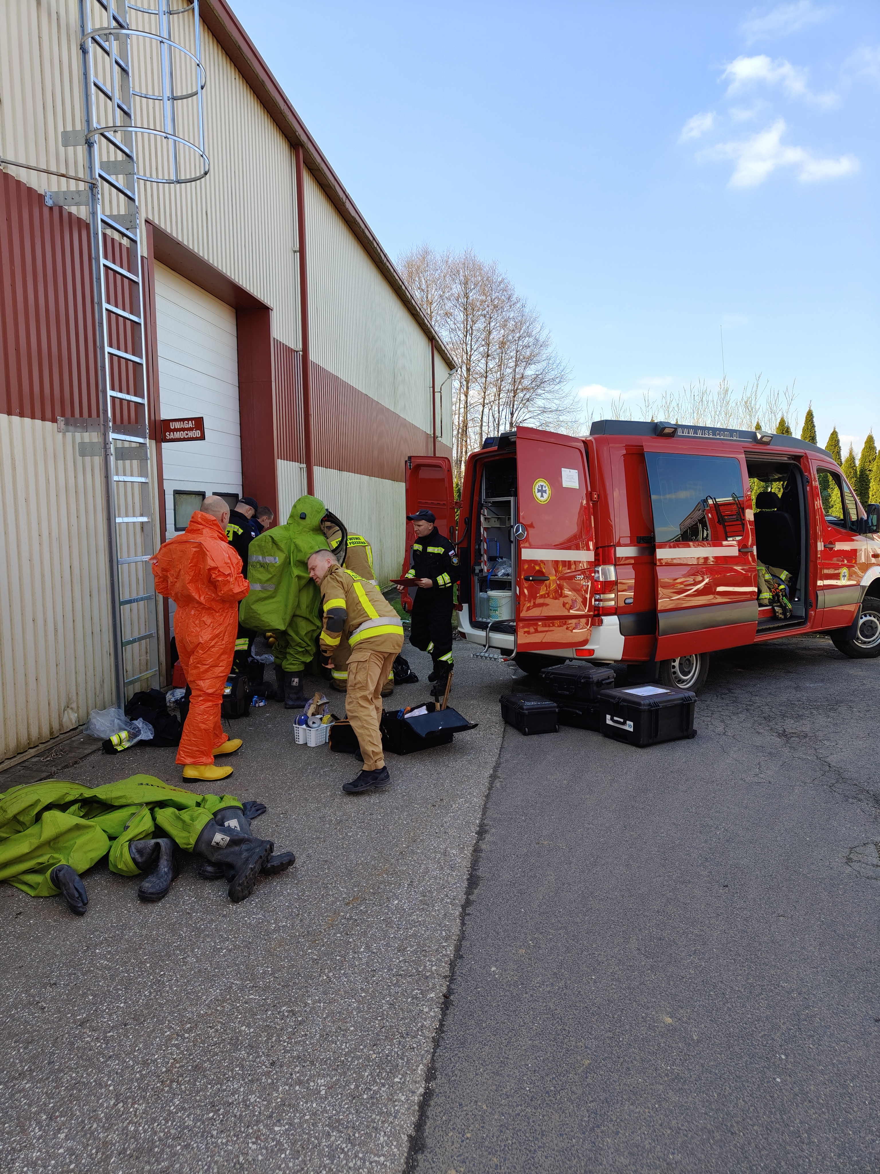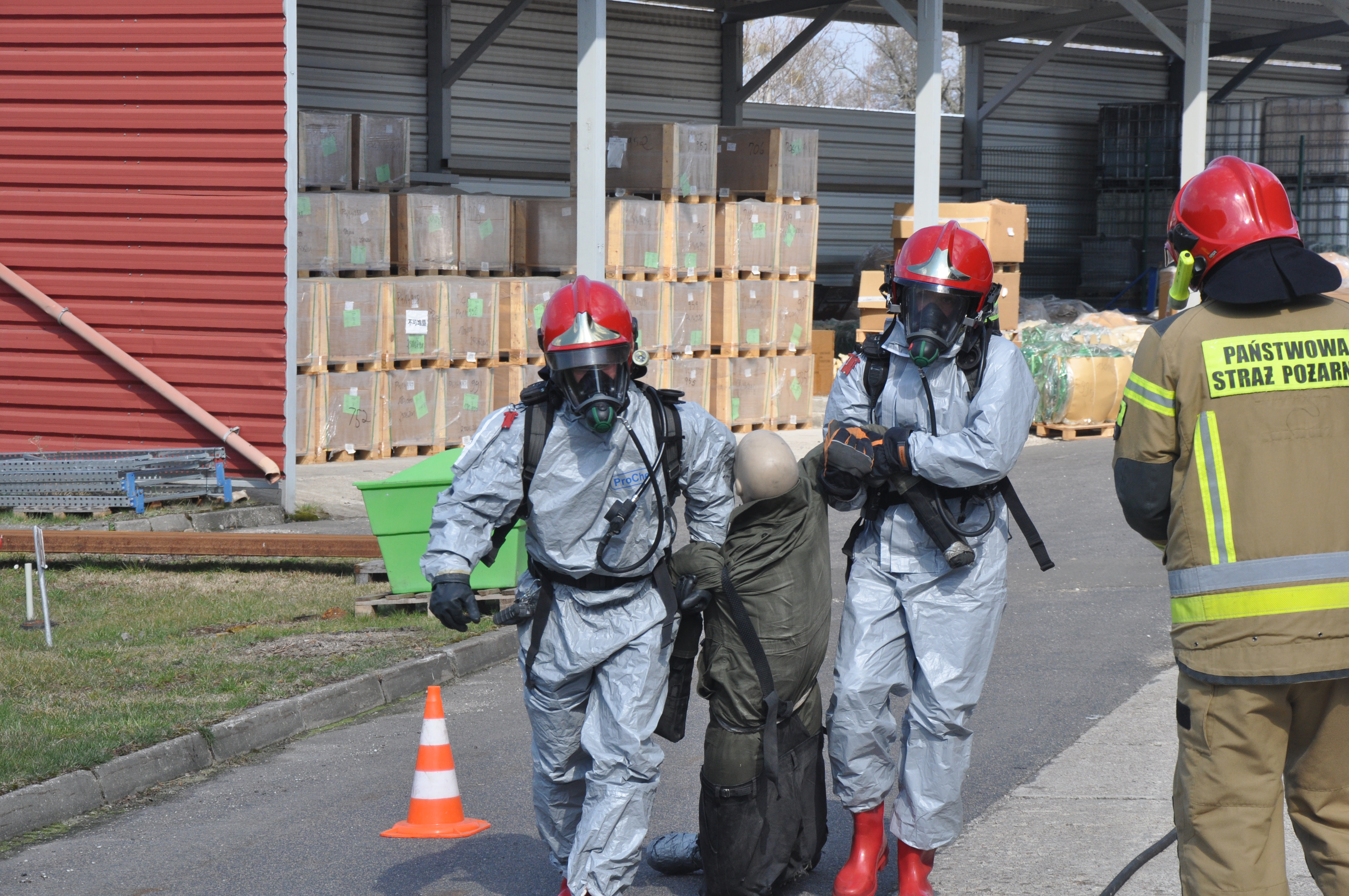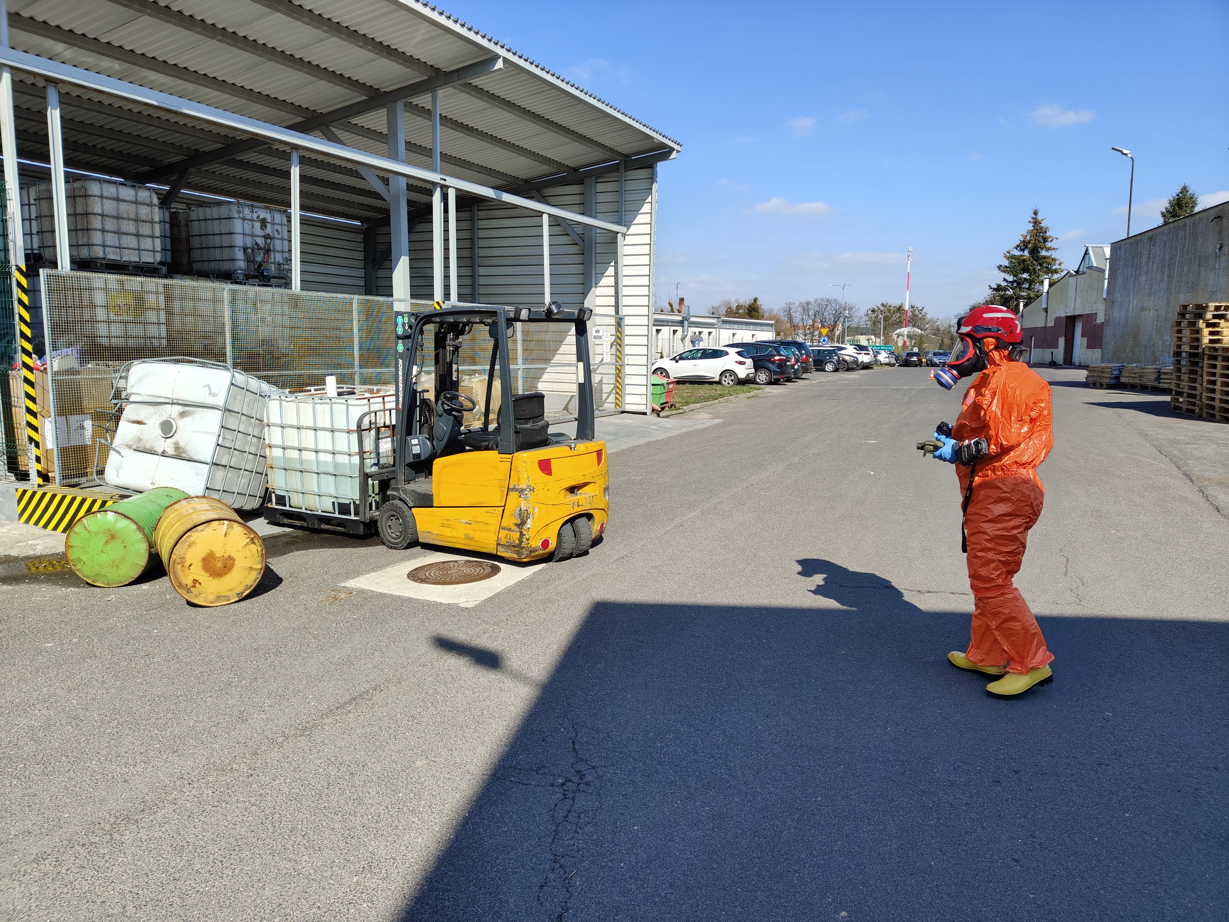 W trakcie działań gaśniczych, KDR otrzymał komunikat o nieprzytomnym operatorze wózka widłowego, który w wyniku nieuwagi uszkodził zbiornik DPPL, w którym przechowywany był kwas solny. Podczas tego epizodu, zespół oceniał podejmowane działania w zakresie ratownictwa chemicznego w zakresie podstawowym. Szczególną uwagę zwracając na zabezpieczenie miejsca zdarzenia, wyznaczanie strefy niebezpiecznej, zapewnienie łączności oraz zapewnienie odpowiedniego stopnia ochrony dla roty pracującej w strefie wycieku. Cel główny oraz cele szczegółowe podczas działań ratowniczych zostały osiągnięte przy współpracy z Specjalistyczną Grupą Ratownictwa Chemiczno-Ekologicznego Olsztyn, która realizowała zadania związane z likwidacją zagrożenia w zakresie działań specjalistycznych.