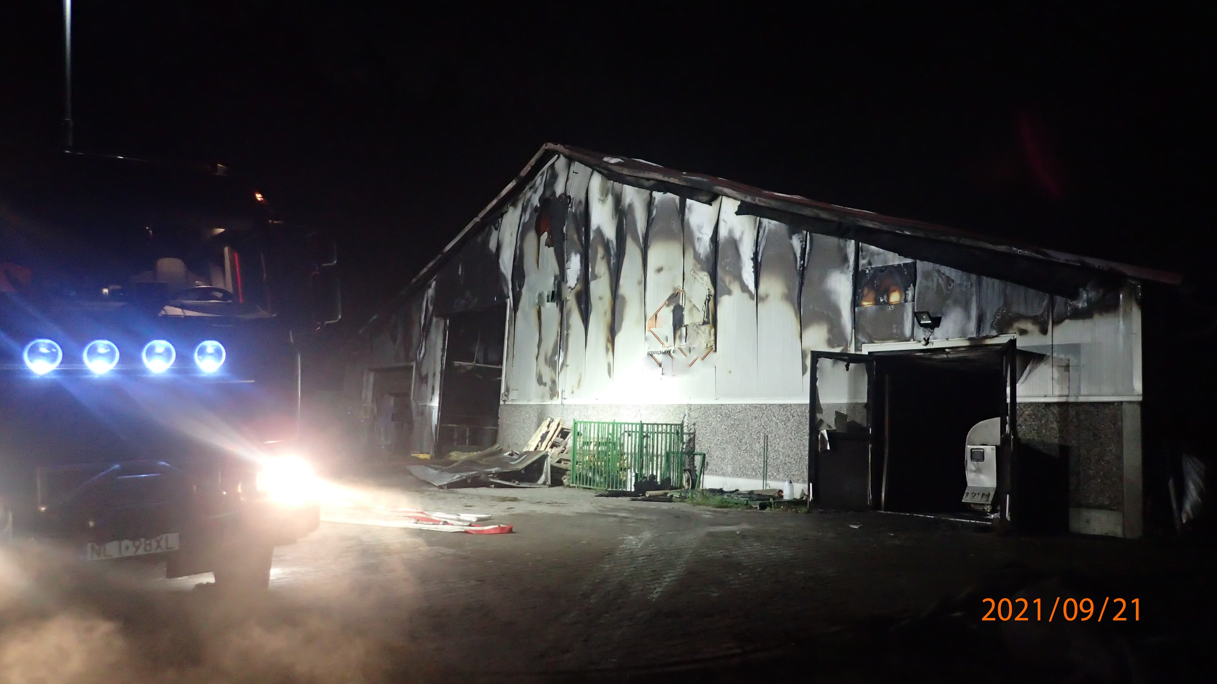 Strażacy po przybyciu na miejsce dyspozycji zastali w pełni rozwinięty pożar budynku inwentarskiego o konstrukcji stalowej, wykonanego w nowej technologii tj. płyta warstwowa. Wewnątrz budynku panowało silne zadymienie, które w znacznym stopniu ograniczało widoczność oraz wysoka temperatura. Potwierdzono również obecność bydła w strefie zagrożenia.