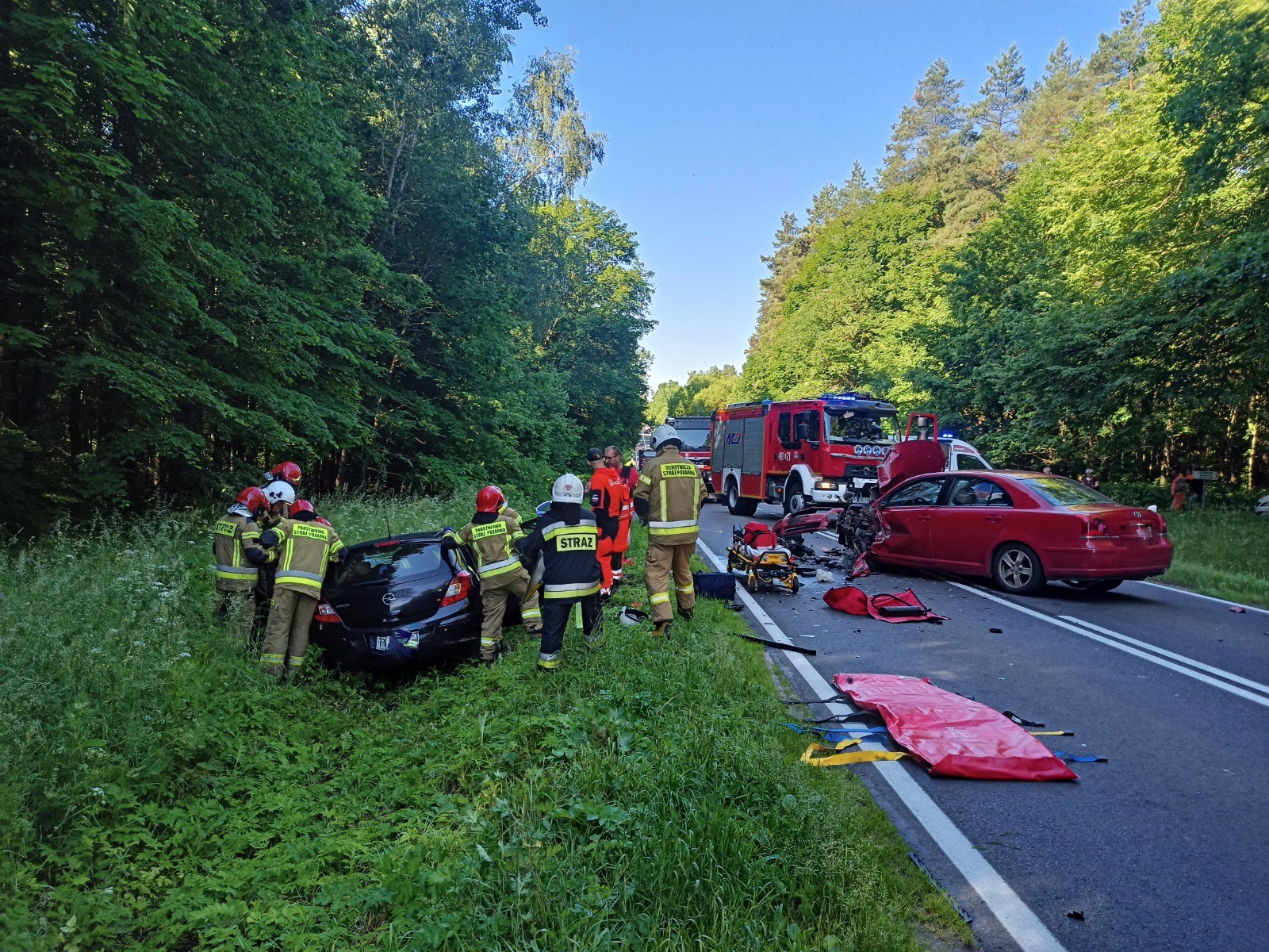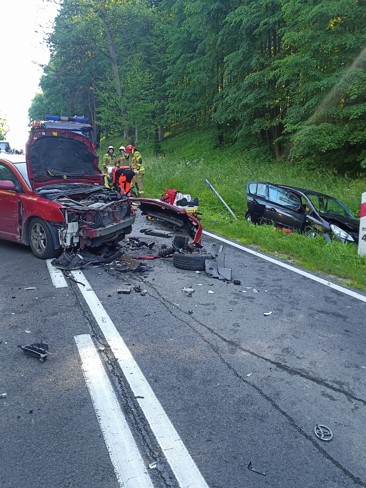 Strażacy przybyli równocześnie z zespołem ratownictwa medycznego. Na miejscu czynności podjął już patrol policji oraz kierowcy, którzy najechali na miejsce wypadku. Wewnątrz uszkodzonego Opla, który znajdował się w przydrożnym rowie przebywała kobieta, która nie była w stanie opuścić pojazd o własnych siłach. Natomiast drugim autem podróżował młody kierowca, który w wyniku uderzenia zablokował drogę krajową. Po chwili analizując przebieg wypadku ustalono, że w zdarzeniu brał udział trzeci pojazd. Około 30 metrów dalej znajdował się Mercedes z uszkodzonym lewym bokiem. Po przebadaniu uczestników zdarzenia, kierowcy Opla oraz Toyoty zostali przewiezieni do najbliższego Szpitalnego Oddziału Ratunkowego.