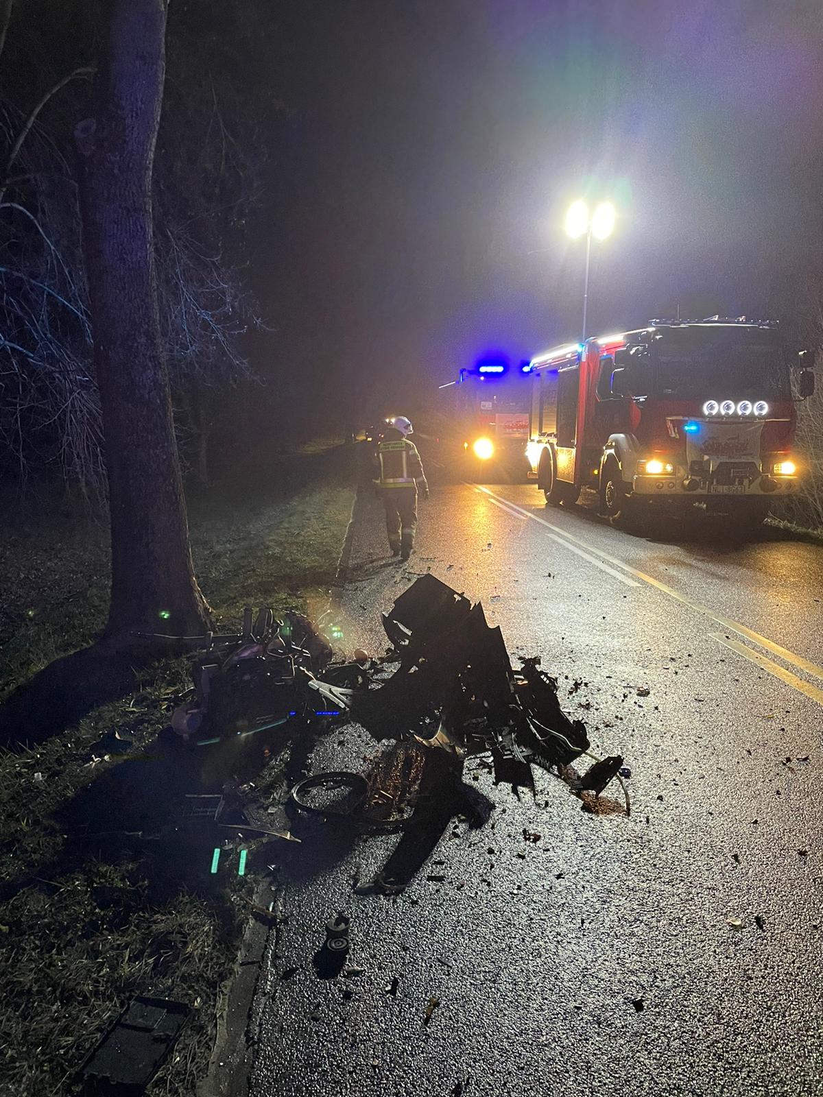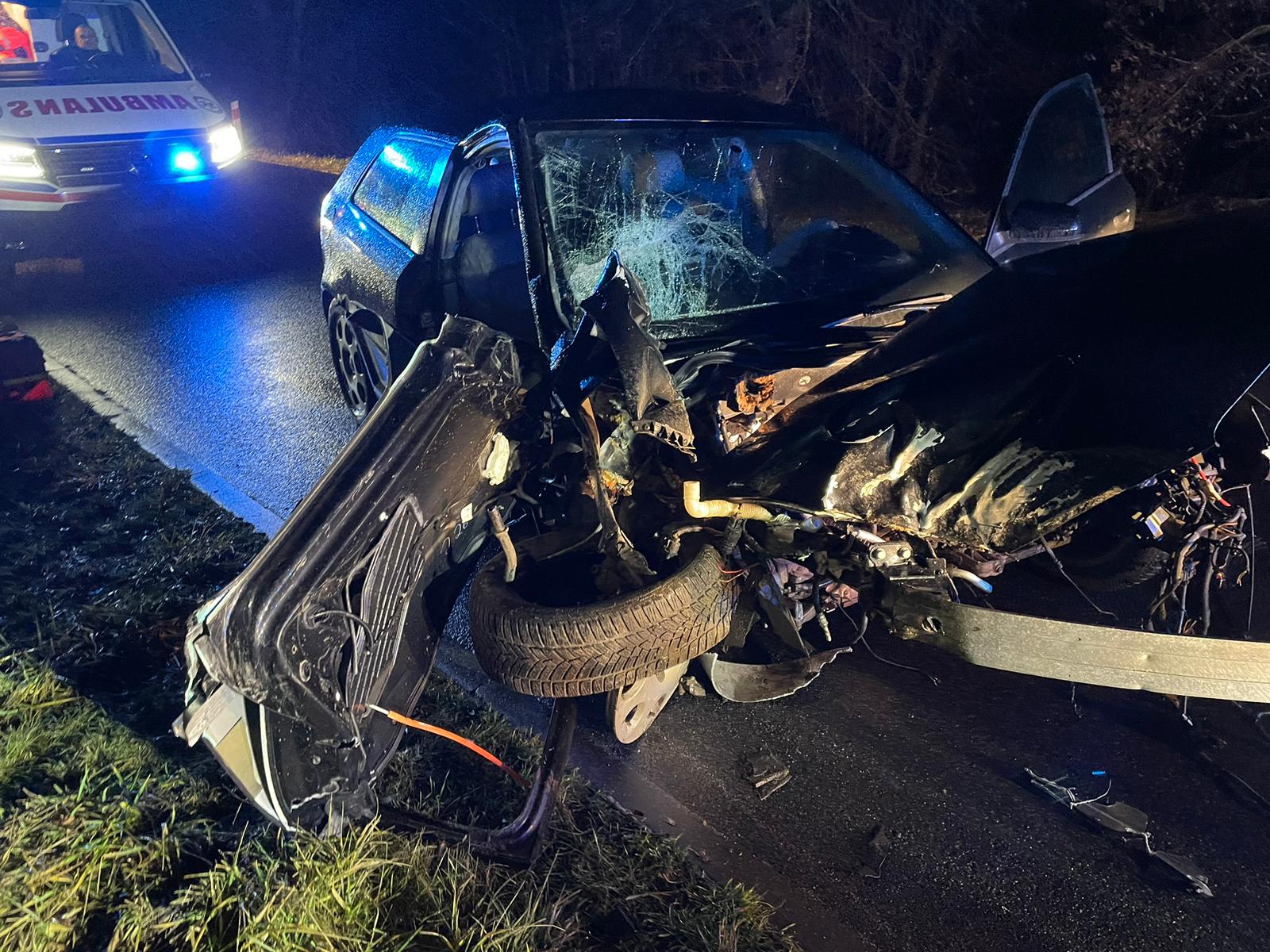 Pierwsi na miejscu pojawili się druhowie z pobliskiej jednostki ochotniczej. Chwilę później do miejsca zdarzenia dojechały zastępy lidzbarskiej straży wraz z zespołem ratownictwa medycznego. Zastano samochód osoby z uszkodzonym przodem w wyniku uderzenia w przydrożne drzewo. 20 metrów dalej znajdował się silnik uszkodzonego auta. Droga została zablokowana. Pojazdem kierował 19 letni, młody mężczyzna a pasażerem była 15-letnia dziewczyna, która znajdowała się w samochodzie nie biorącym udział w zdarzeniu.