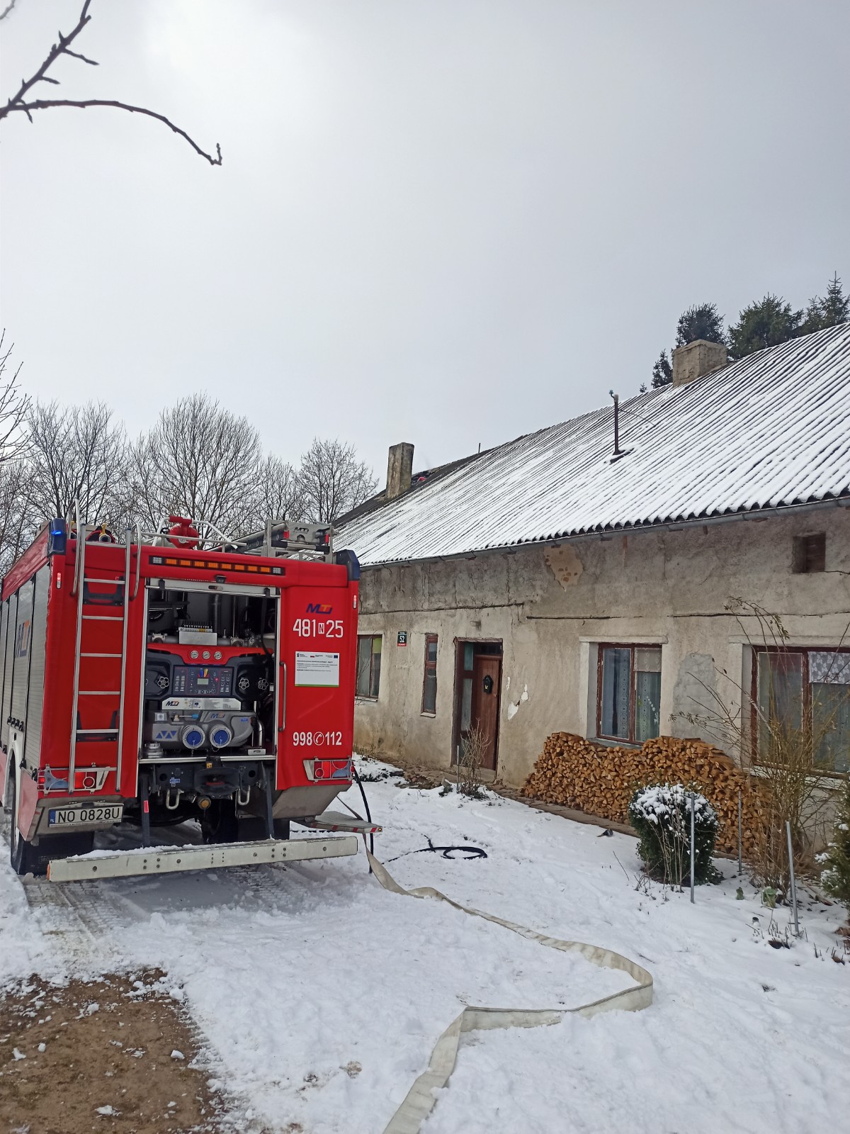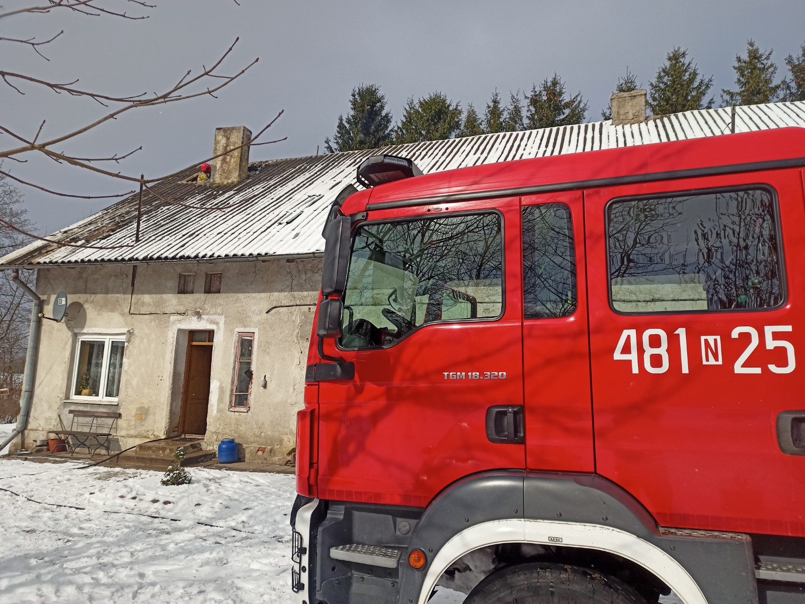 Z chwilą przybycia na miejsce pożaru pierwszego zastępu, dowódca przekazał informacje o pożarze dachu w obrębie przewodu dymowego. Widoczne zadymienie oraz ogień wydostawał się na zewnątrz spod eternitowych płyt. Ogień zaczął trawić drewniane krokwie wraz z odeskowaniem. Oceniając zagrożenie jakie powstało w wyniku pożaru, poprosił o zadysponowanie wsparcia operacyjnego. Natomiast mieszkańcy budynku przebywali na zewnątrz i nie wymagali pomocy medycznej. Po usunięciu zagrożenia porażenia prądem, strażacy przystąpili do gaszenia pożaru.