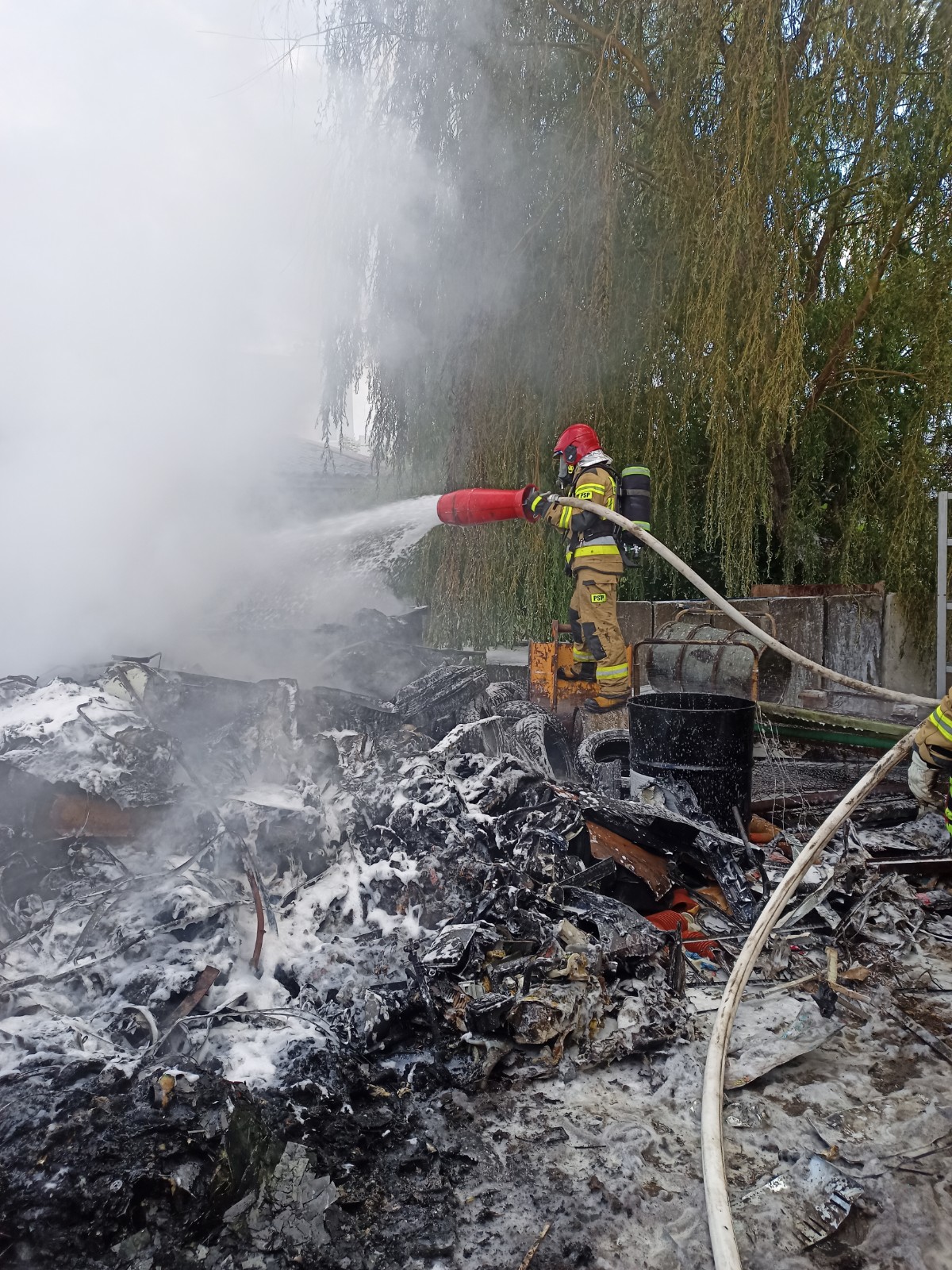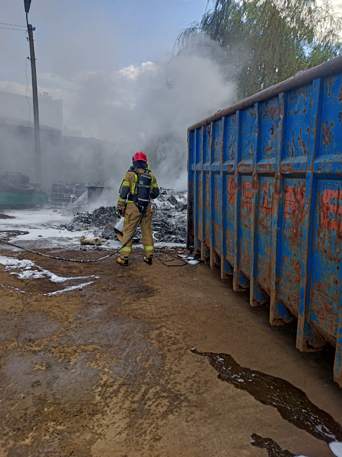Po dotarciu pierwszych zastępów na miejsce dysponowania, potwierdzono pożar elementów demontażu aut o powierzchni około 100 m2 . Bezpośrednio narażony na oddziaływanie ognia był ciężki sprzęt w postaci koparki.