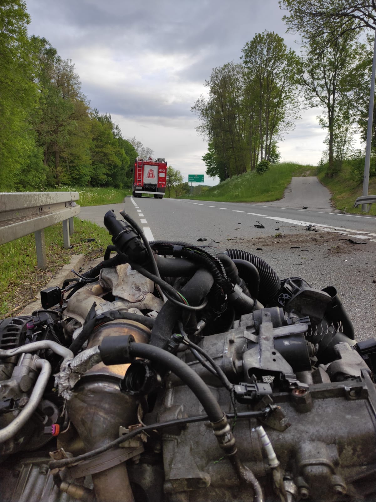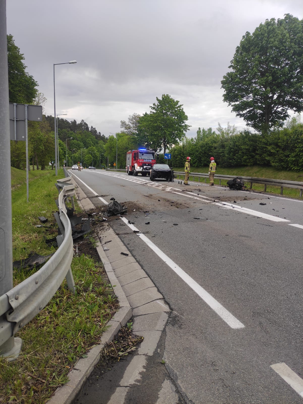 Do zdarzenia zadysponowane zostały dwa zastępy z lidzbarskiej Jednostki Ratowniczo-Gaśniczej, pogotowie ratunkowe oraz policja. Po dojeździe na miejsce wskazywane przez zgłaszającego zastano samochód osobowy marki audi A3 stojący na jednym z pasów ruchu. W wyniku uderzenia w barierki wygrodzeniowe z komory silnika wyrwany został silnik pojazdu, który znajdował się około 15 metrów dalej. Kierowca podróżujący samodzielnie po przebadaniu przez zespół medyczny, pozostał na miejscu zdarzenia. Ruch drogowy został wprowadzony wahadłowo a wycieki płynów eksploatacyjnych zostały usunięte.