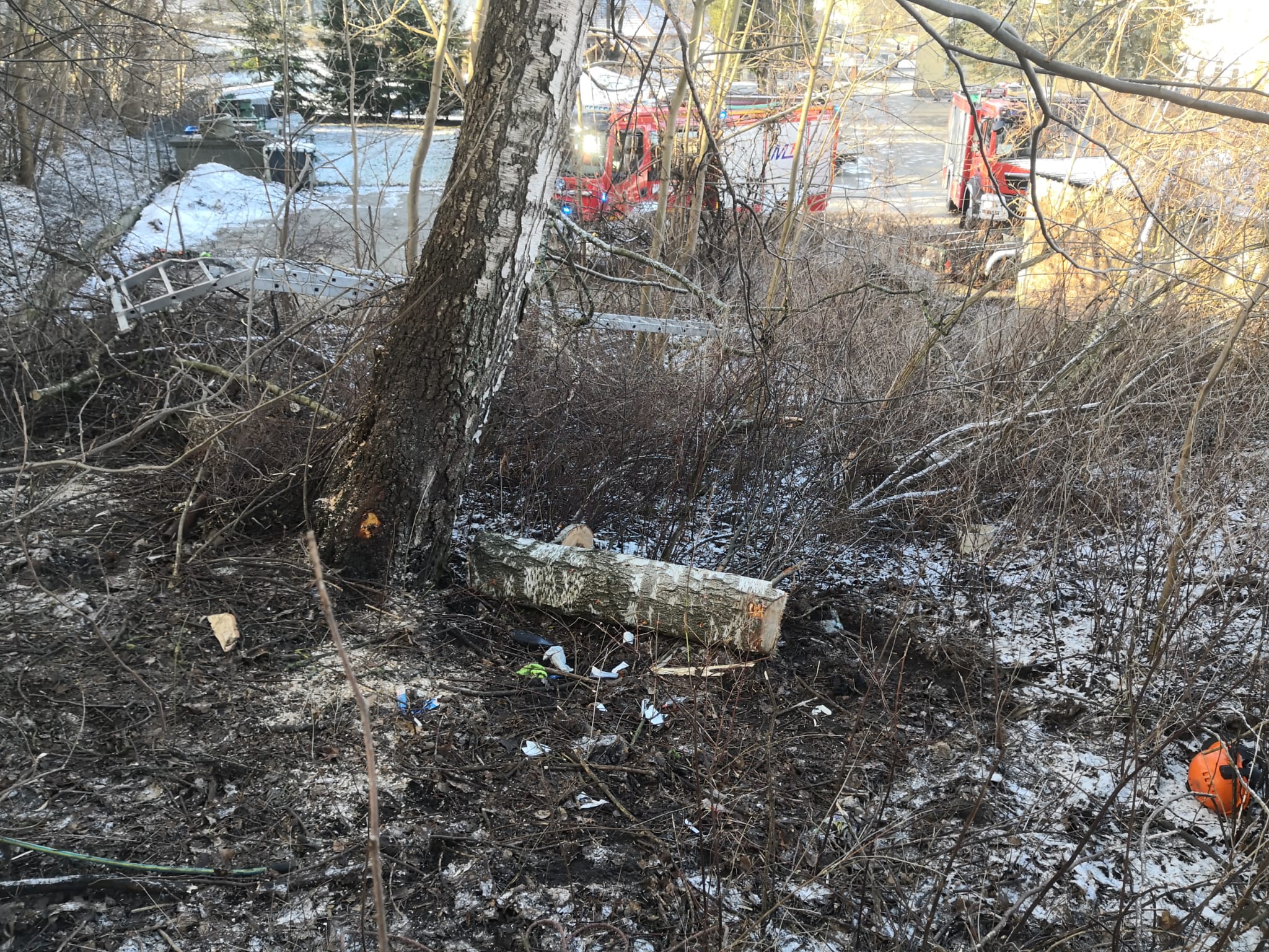 Po przybyciu na miejsce zdarzenia pierwszego zastępu zastano pracowników, którzy wcześniej prowadzili ścinkę drzew w wyznaczonym miejscu. Obok ściętego drzewa leżał poszkodowany z widocznym urazem kończyn, który został przygnieciony przez opadające po ścince drzewo. Pracownicy przy użyciu pilarek usunęli zagrażający konar.