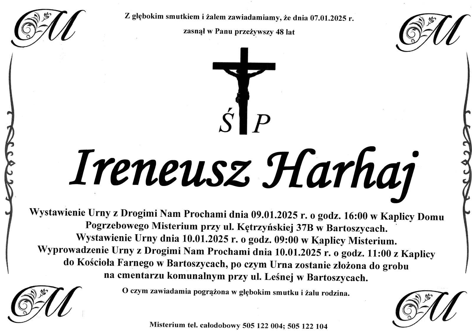 Z głębokim żalem i ogromnym smutkiem zawiadamiamy, że 7 stycznia 2025 roku mł. bryg. Ireneusz Harhaj Zastępca Komendanta Powiatowego Państwowej Straży Pożarnej w Kętrzynie odszedł na „wieczną służbę”.