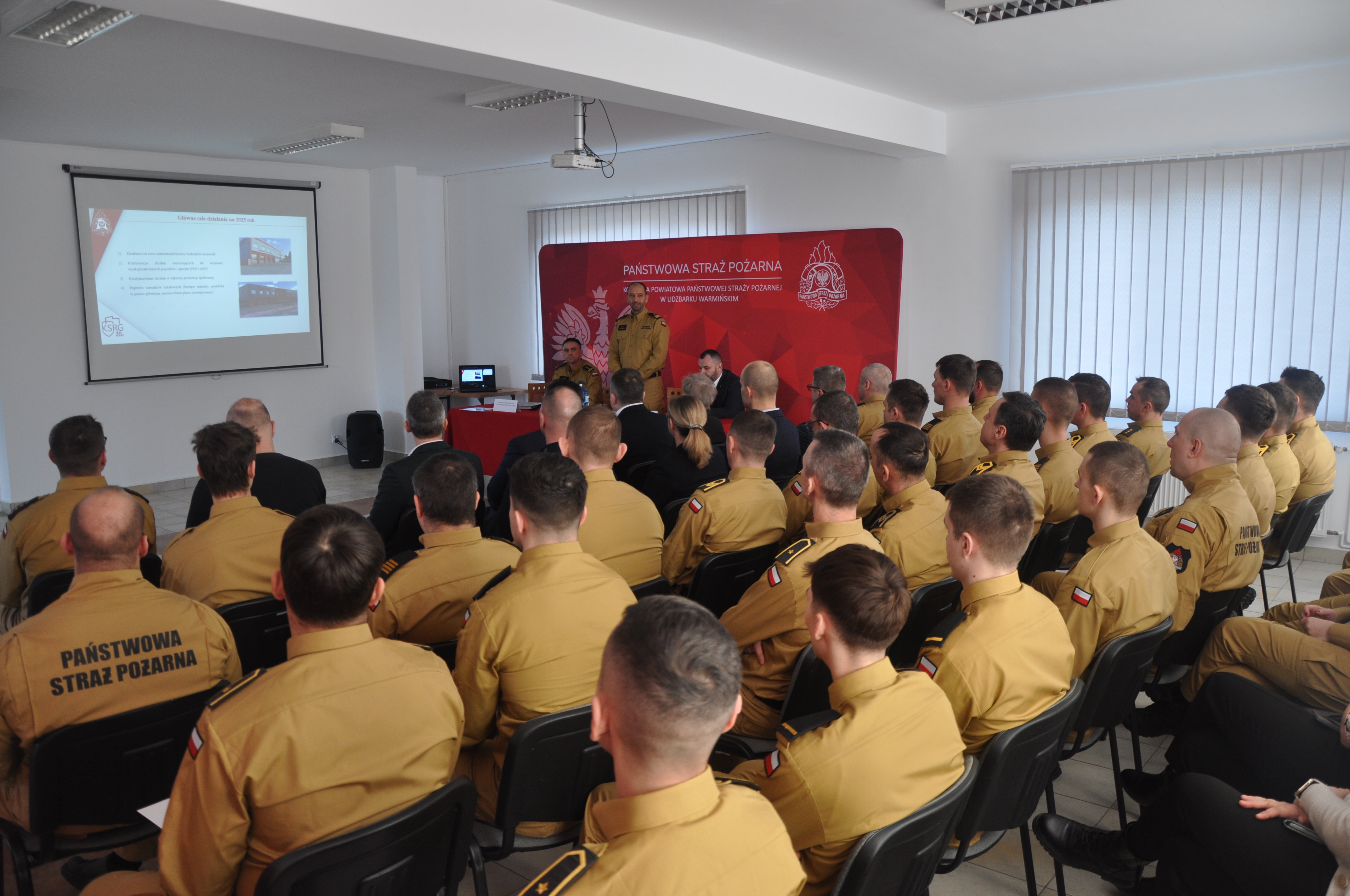Po kadrowym przerywniku, Komendant Powiatowy rozpoczął prezentację całorocznej działalności lidzbarskiej Komendy od uczczenia pamięci zmarłych strażaków minutą ciszy. Następnie st.bryg. Rafał Szymukowicz zaprezentował dane z działalności komendy w roku ubiegłym, z uwzględnieniem ilości i rodzaju podejmowanych działań przez strażaków jednostki ratowniczo-gaśniczej oraz jednostek ochotniczych straży pożarnych. Ponadto, przedstawił zagadnienia z działalności operacyjno-szkoleniowej, kadrowej, logistycznej, kontrolno-rozpoznawczej, działalności w ramach prewencji społecznej, a także współpracy z jednostkami Ochotniczych Straży Pożarnych. Komendant lidzbarskich strażaków zwrócił uwagę na inwestycje przeprowadzone w roku 2024 i określił pan działania na rok 2025.