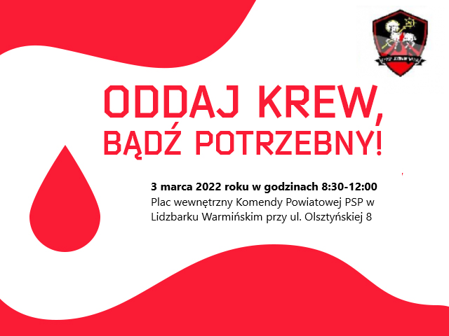 Lidzbarscy strażacy wspólnie z Regionalnym Centrum Krwiodawstwa i Krwiolecznictwa w Olsztynie zapraszają wszystkich chętnych, 3 marca br. (CZWARTEK) do siedziby Komendy Powiatowej PSP w Lidzbarku Warmińskim na akcje zbiórki krwi.