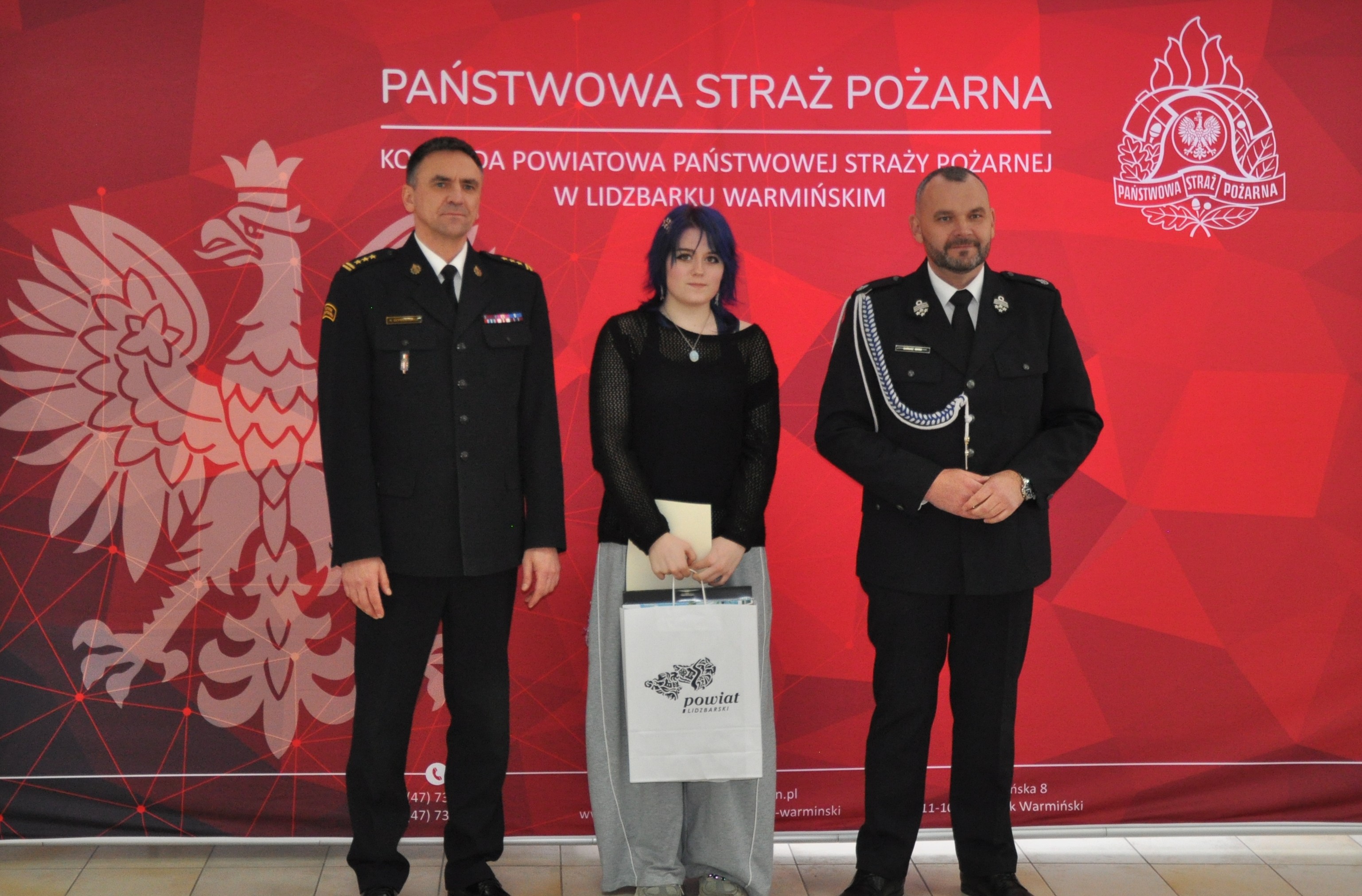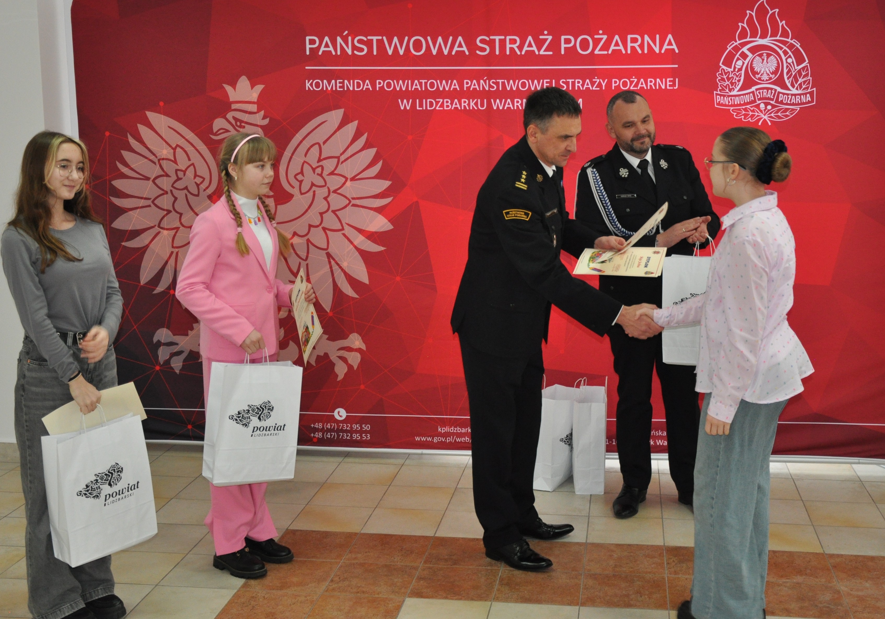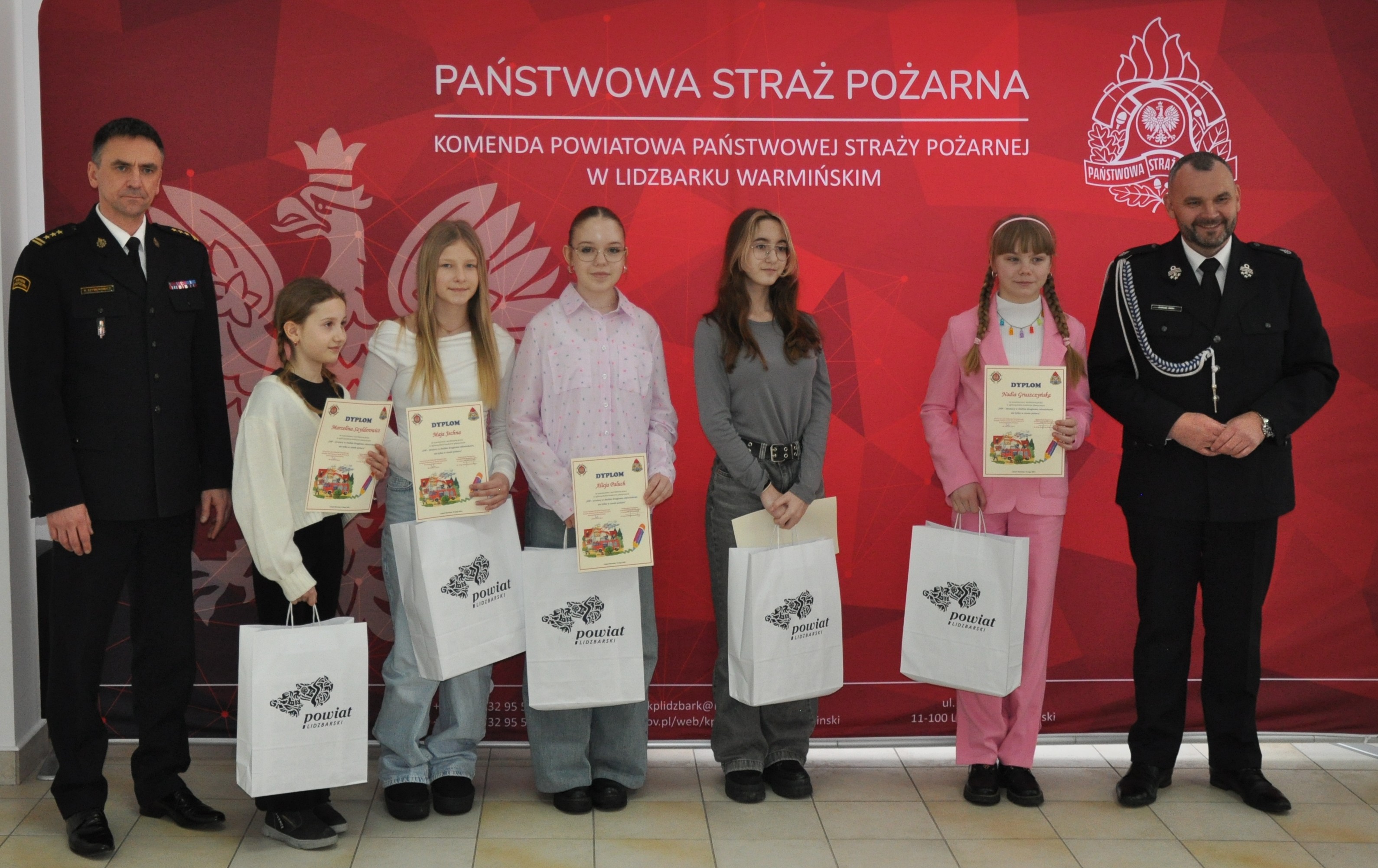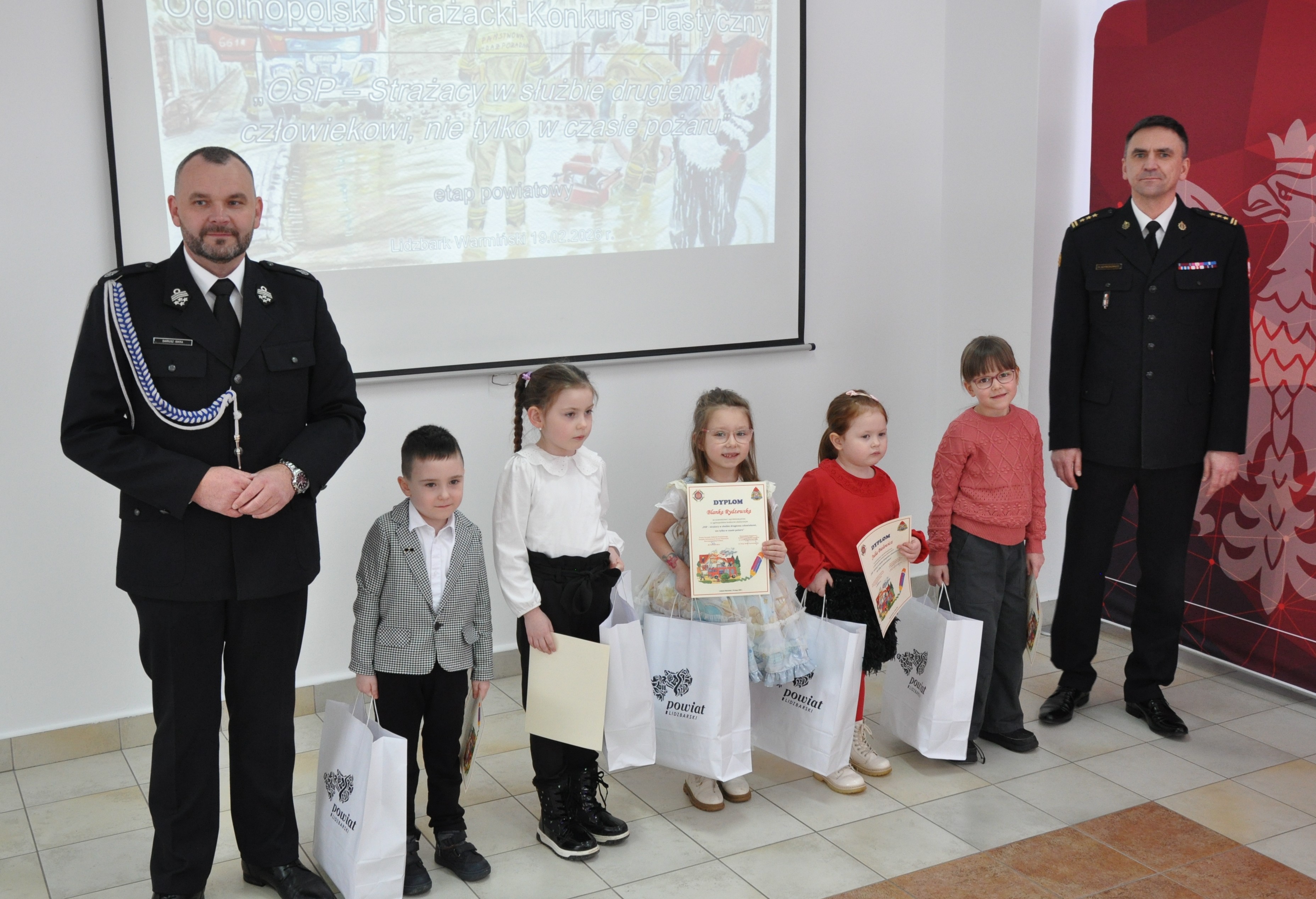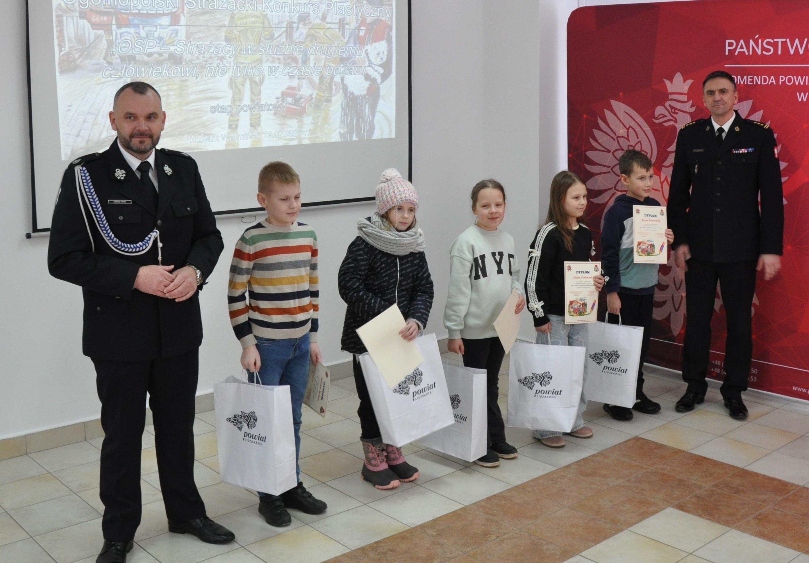 Komendant Powiatowy Państwowej Straży Pożarnej w Lidzbarku Warmińskim st. bryg. Rafał Szymukowicz wraz z Prezesem Zarządu Oddziału Powiatowego ZOSP RP dh Dariuszem Iskrą wręczyli upominki młodym artystom z powiatu lidzbarskiego.