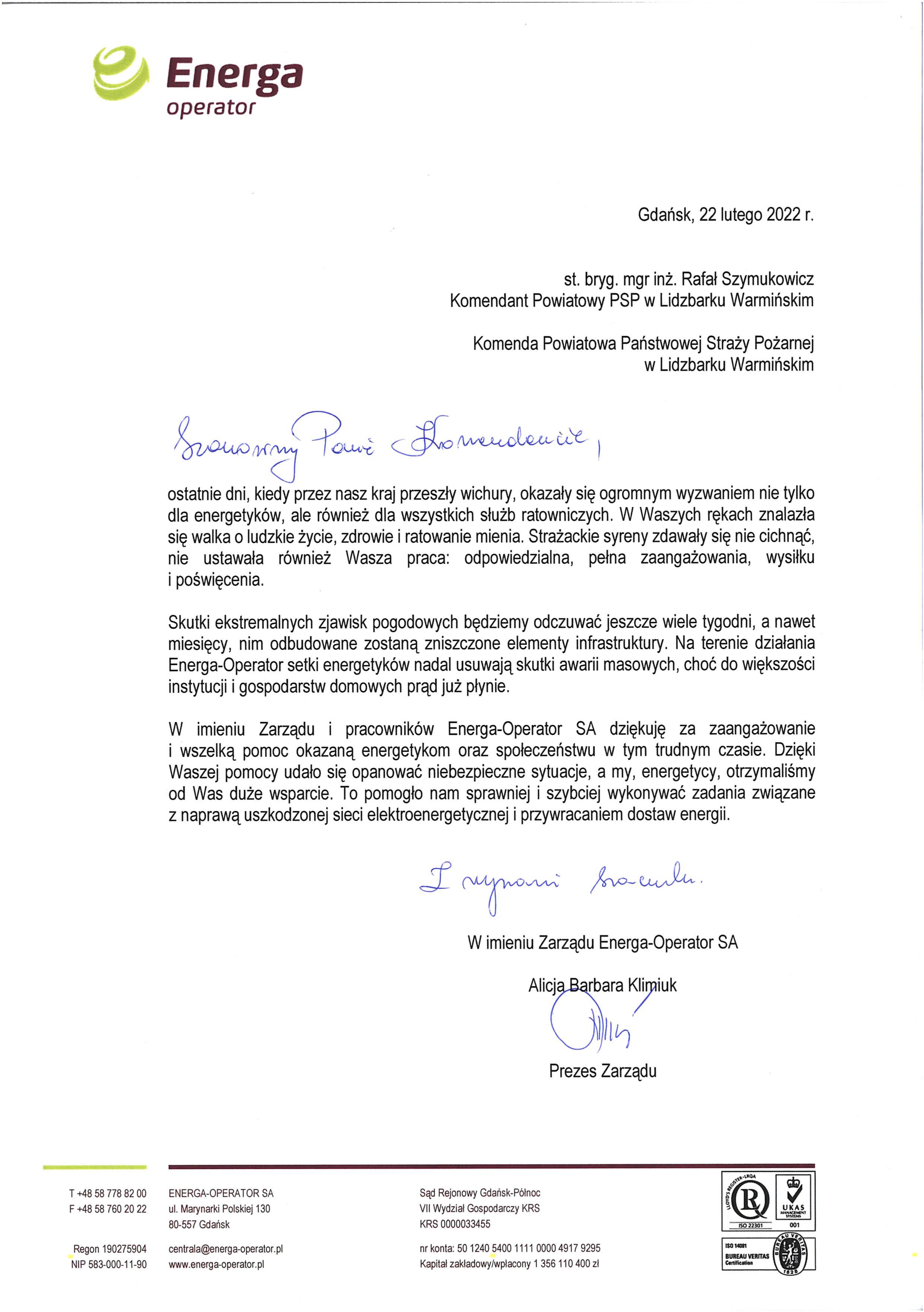 Komenda Powiatowa PSP w Lidzbarku Warmińskim otrzymała od Zarządu Energa-Operator SA podziękowania za zaangażowanie i pomoc w usuwaniu skutków silnych wiatrów, które nawiedziły nasz kraj w ostatnim okresie.