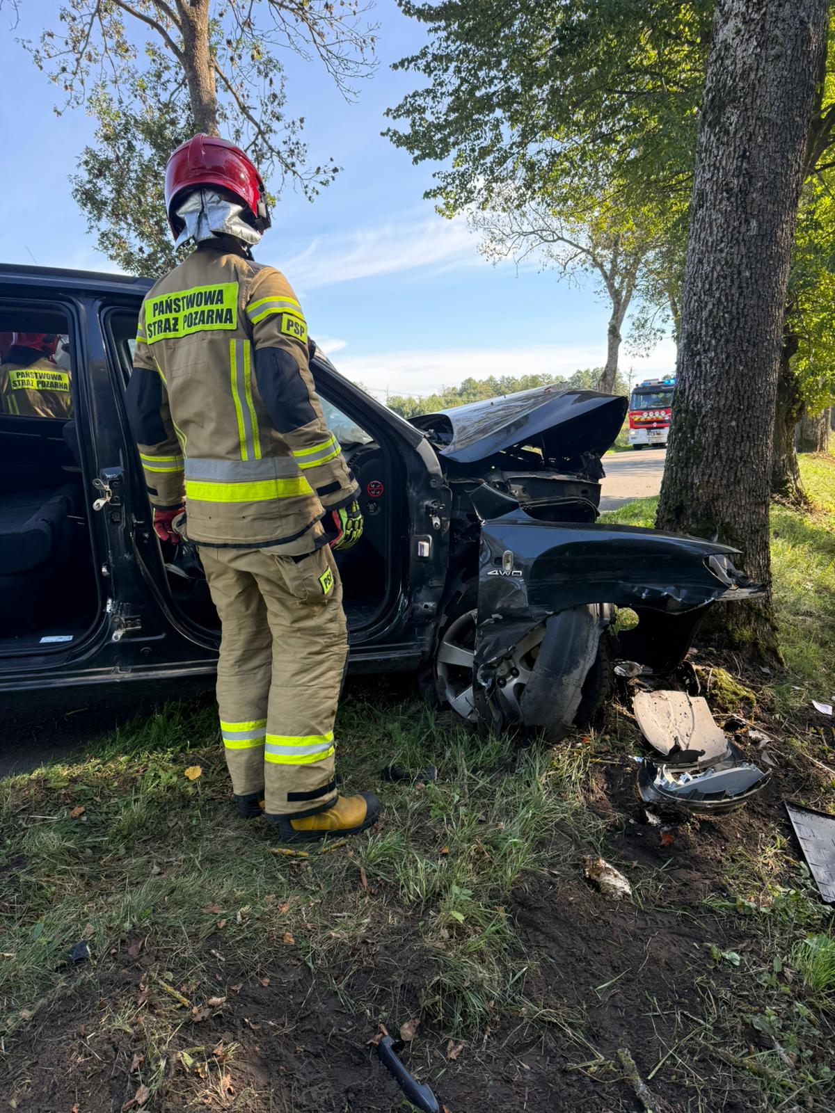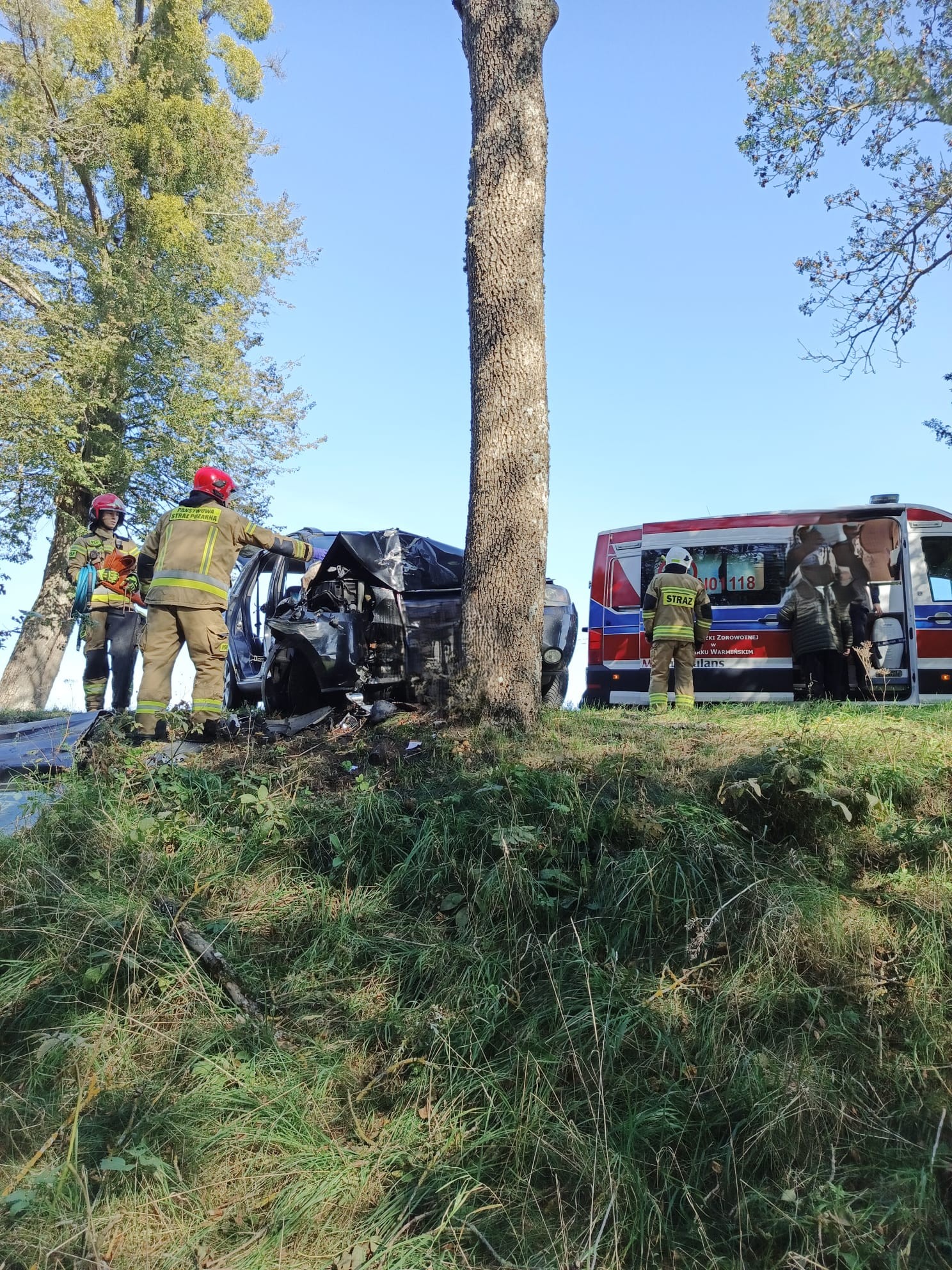 Po przybyciu na miejsce strażacy zastali samochód osobowy marki Hyundai, który uderzył w przydrożne drzewo. Wewnątrz znajdowała się pasażerka – kobieta, która z powodu odniesionych obrażeń i uszkodzeń pojazdu nie była w stanie opuścić auta o własnych siłach. Obok przebywał kierowca. Ratownicy wspólnie z zespołem medycznym przystąpili do ewakuacji poszkodowanej. Przy użyciu narzędzi hydraulicznych wykonano dostęp, umożliwiający wydobycie kobiety, która po udzieleniu pierwszej pomocy została przetransportowana do Szpitalnego Oddziału Ratunkowego w Bartoszycach.